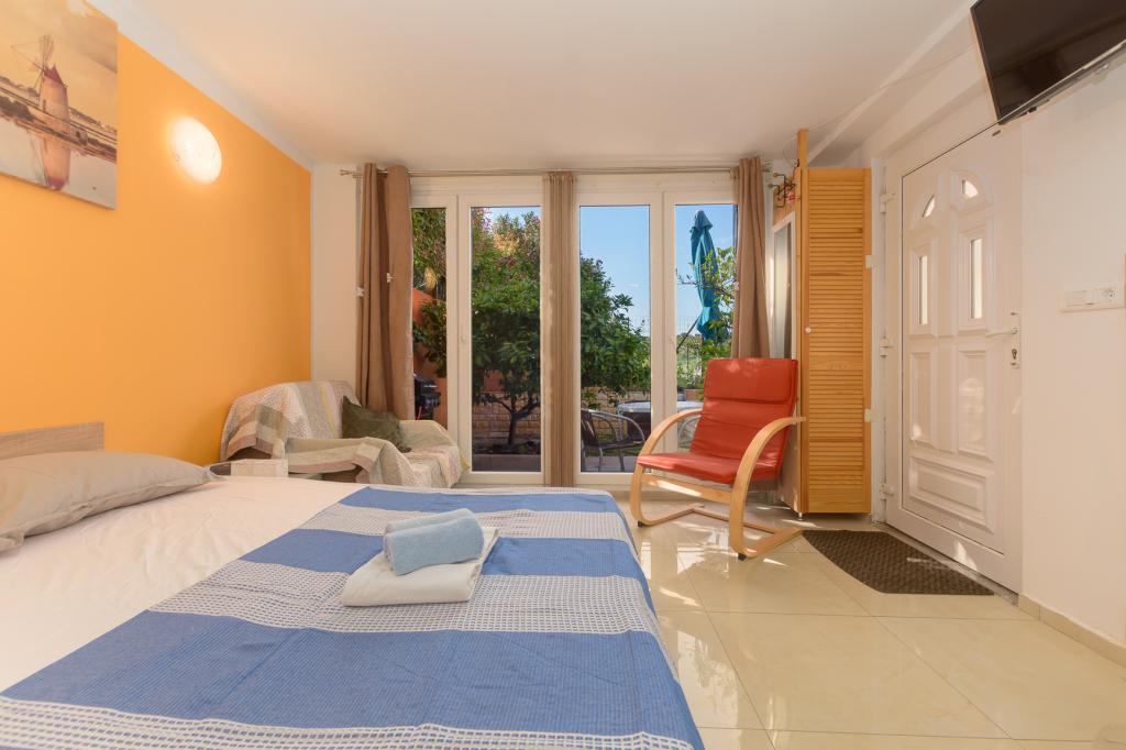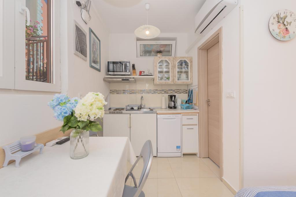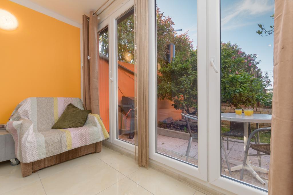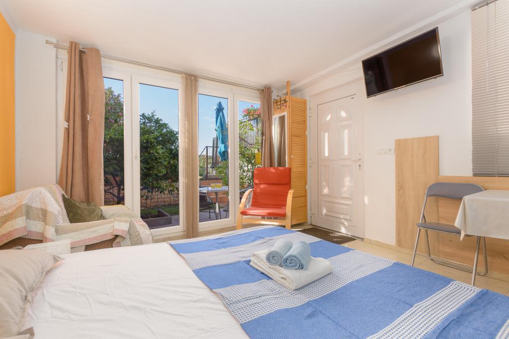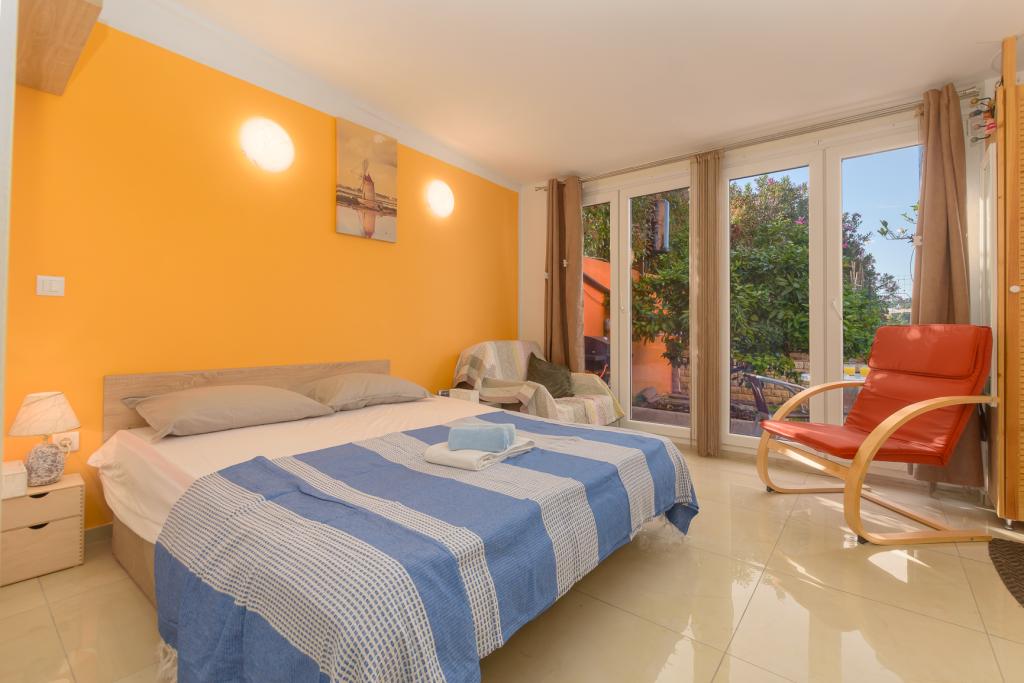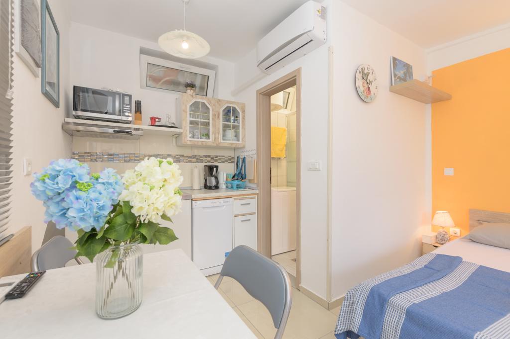Modern ingericht studioappartement (2+1) op de eerste rij aan zee in een zeer rustige toeristische wijk als apart huis. Een klein terras met barbecue, buitendouche en uitzicht op zee vanaf het terras. Het beschikt over een eigen luifel, zodat u aangenaam in de schaduw kunt vertoeven. De winkel en het restaurant liggen op 1000 meter afstand en het eerste strand ligt op 300 meter afstand. Parkeren in de buurt van het gebouw is gratis. U kunt 's ochtends en 's avonds langs de zee wandelen naar het Del Mar Hotel en terug. Ook in de buurt ligt het nationale park Kamenjak - Premantura, op een afstand van ca. 4000 meter.