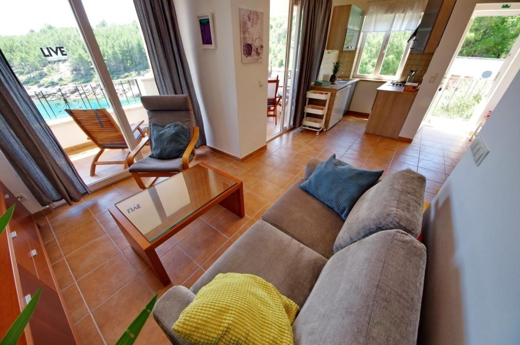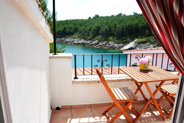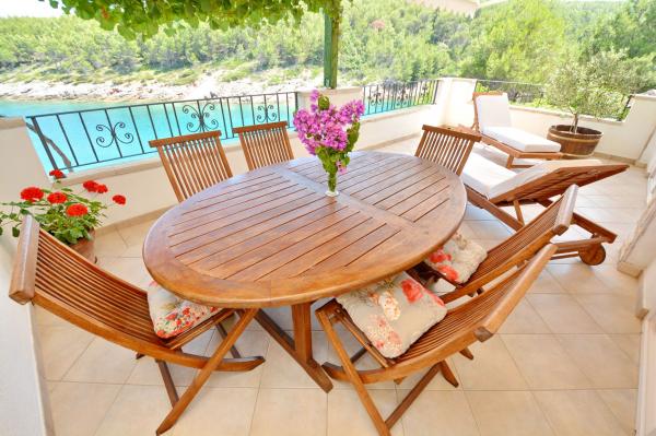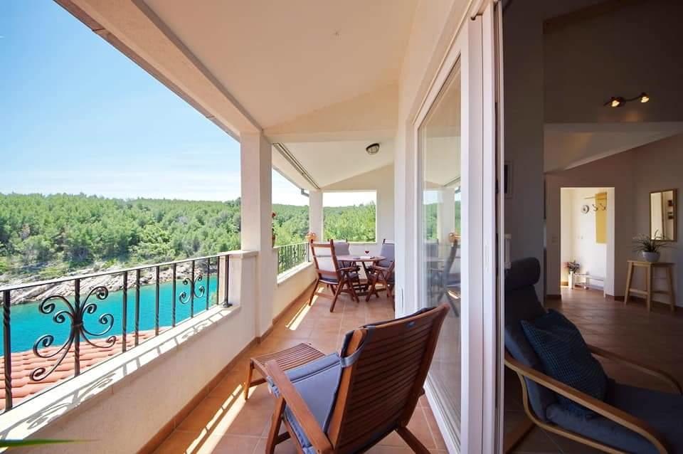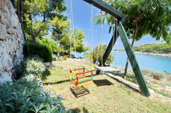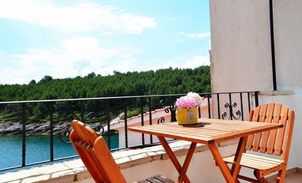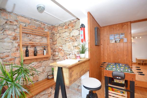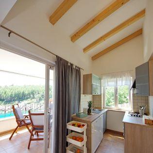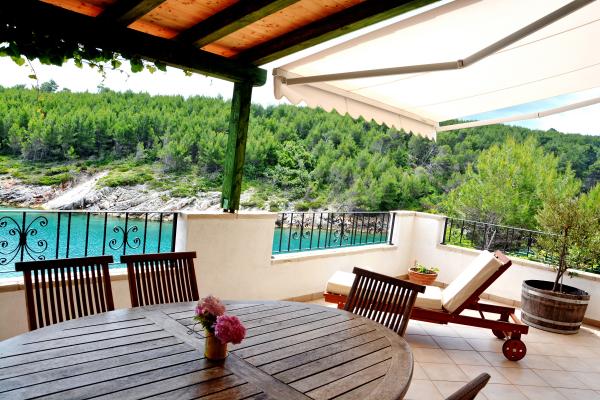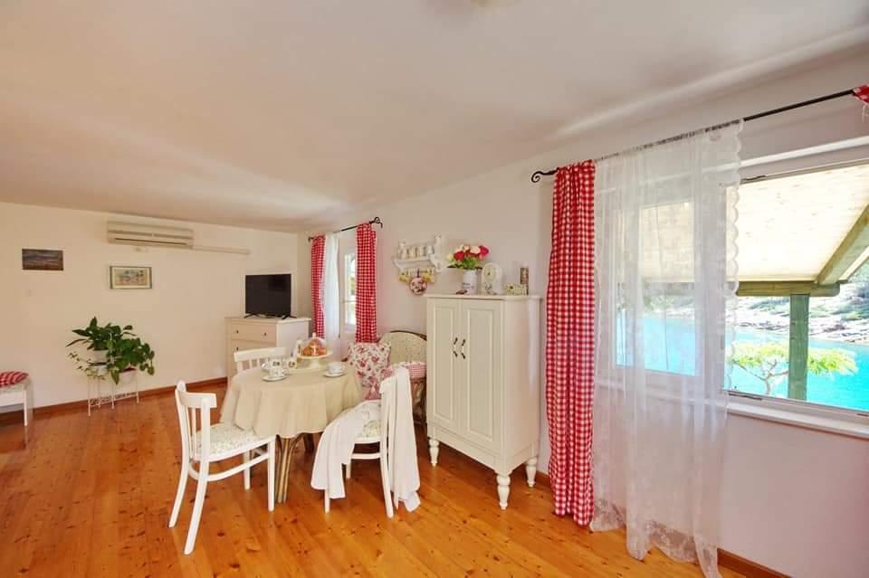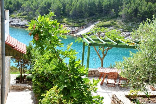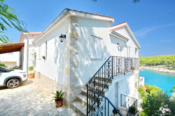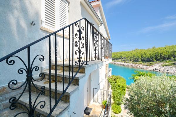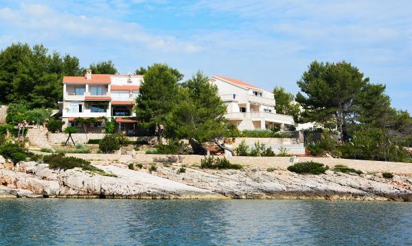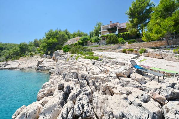 Appartementenhuis, trapsgewijs, in een prachtige rustige baai, eerste rij aan zee, met 6 volledig uitgeruste appartementen, fitnessruimte, privéparkeerplaats, 2 buitenhaarden, 2 buitendouches, ligweide, buitenjacuzzi, kinderspeelplaats en tuin. RUZMARIN (2) - 21 m2, aparte ingang, begane grond, terras 20 m2, woonkamer met keuken en toilet. KADULJA (4) - 60 m2, aparte ingang, middelste verdieping, terras 25 m2, woonkamer met keuken en 2 slaapkamers met 2 toiletten. FIG (2) - 40 m2, aparte ingang, bovenverdieping, terras 7 m2, woonkamer met keuken, toilet en slaapkamer op zolder. LAVANDA (4+1) - 60 m2, aparte ingang, bovenverdieping, terras 15 m2, inkomhal, woonkamer met keuken en 2 slaapkamers met 2 toiletten. MASLINA (4) - 65 m2, aparte ingang, middelste verdieping, terras 20 m2, hal, woonkamer met keuken en open haard, 2 slaapkamers met 2 toiletten. LOVOR (2+1) - 45 m2, aparte ingang, begane grond, terras 20 m2, woonkamer met keuken en slaapkamer met toilet.