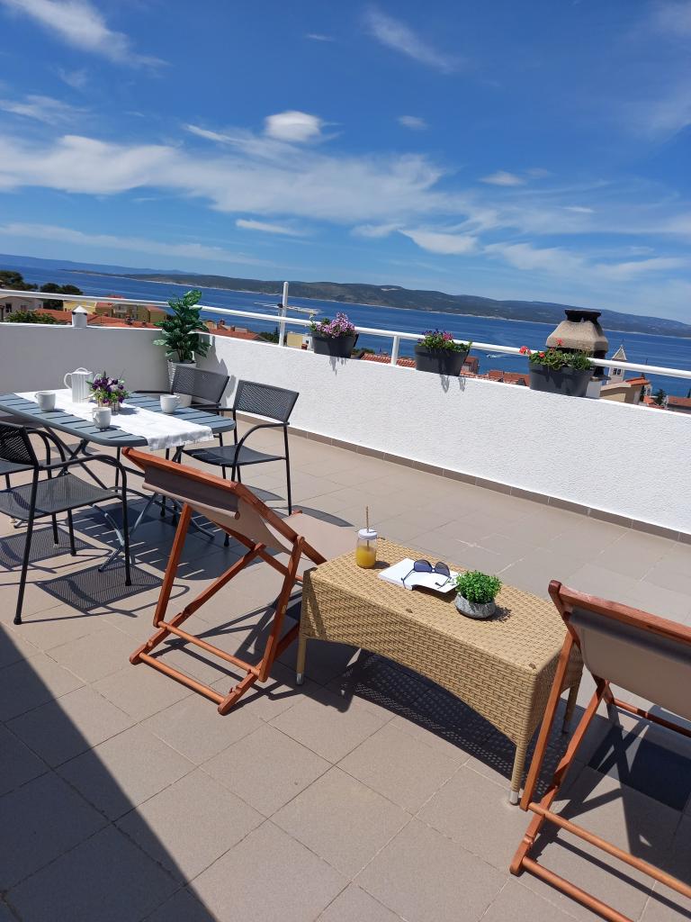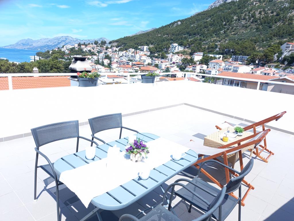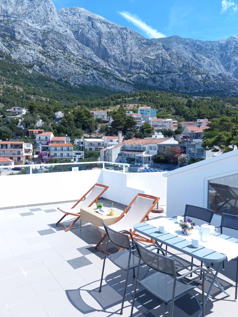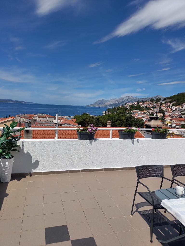 Appartement Nino is een modern appartement, voorzien van alles wat u nodig heeft voor uw vakantie. Het appartement is voorzien van airconditioning en een uitgeruste keuken. Twee slaapkamers zijn voorzien van televisie en hebben een eigen badkamer. Het appartement beschikt over een balkon en een terras met een prachtig uitzicht op de zee en de berg Biokovo. Naast een kleine eethoek in het appartement, is er op het terras een zithoek en ligstoelen. Ons appartement Nino ligt op 5 minuten lopen van het centrum en het hoofdstrand. In de buurt is er ook een speeltuin met kunstgras voor sportactiviteiten: voetbal, basketbal, ...