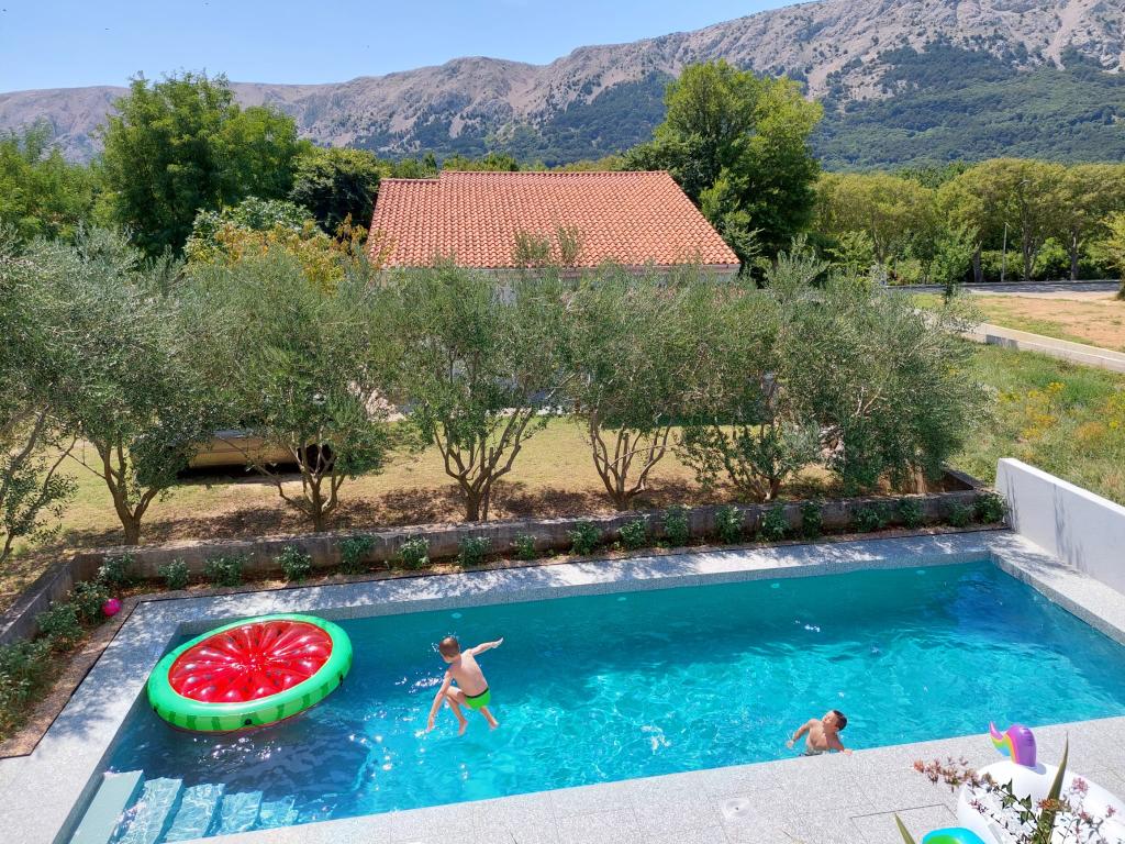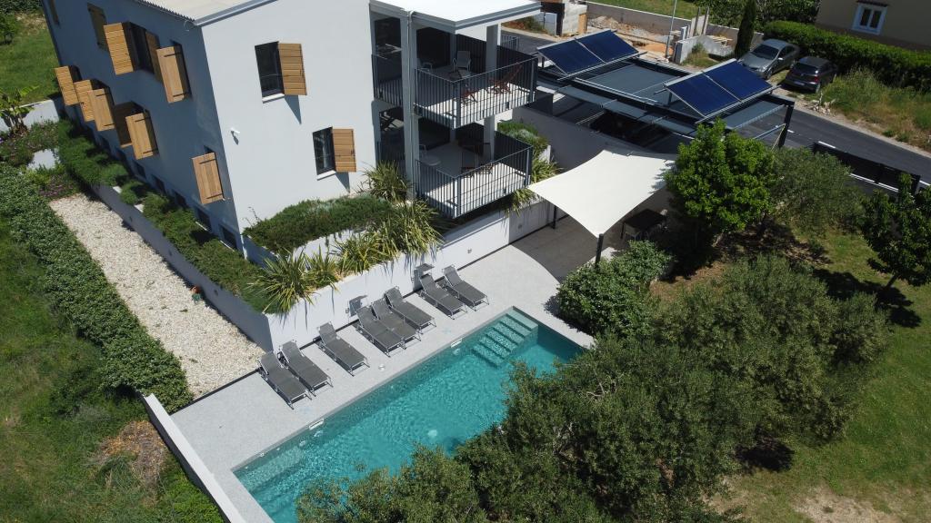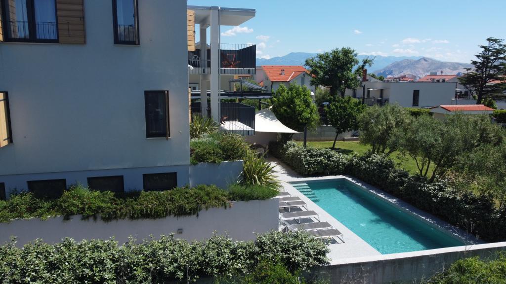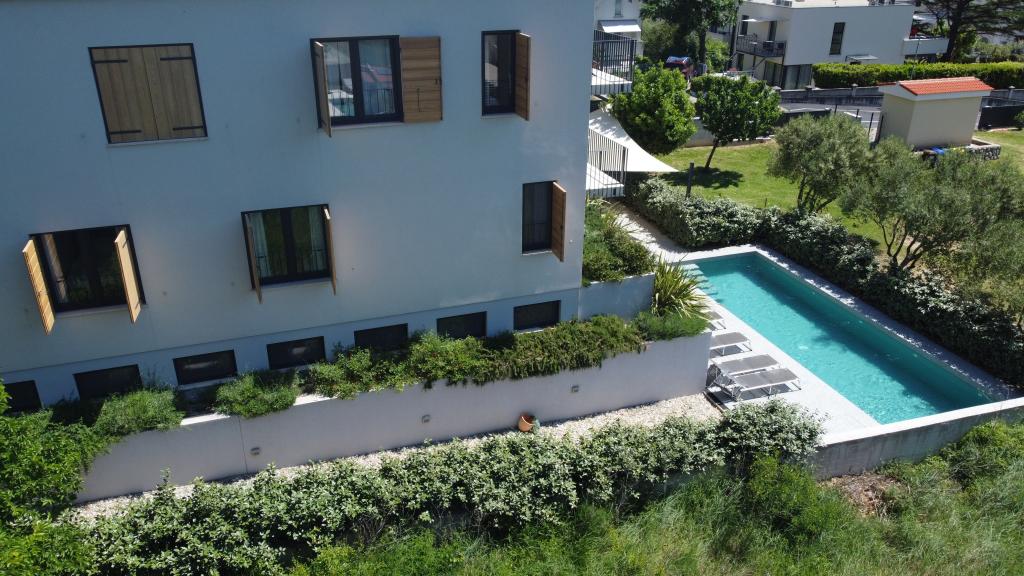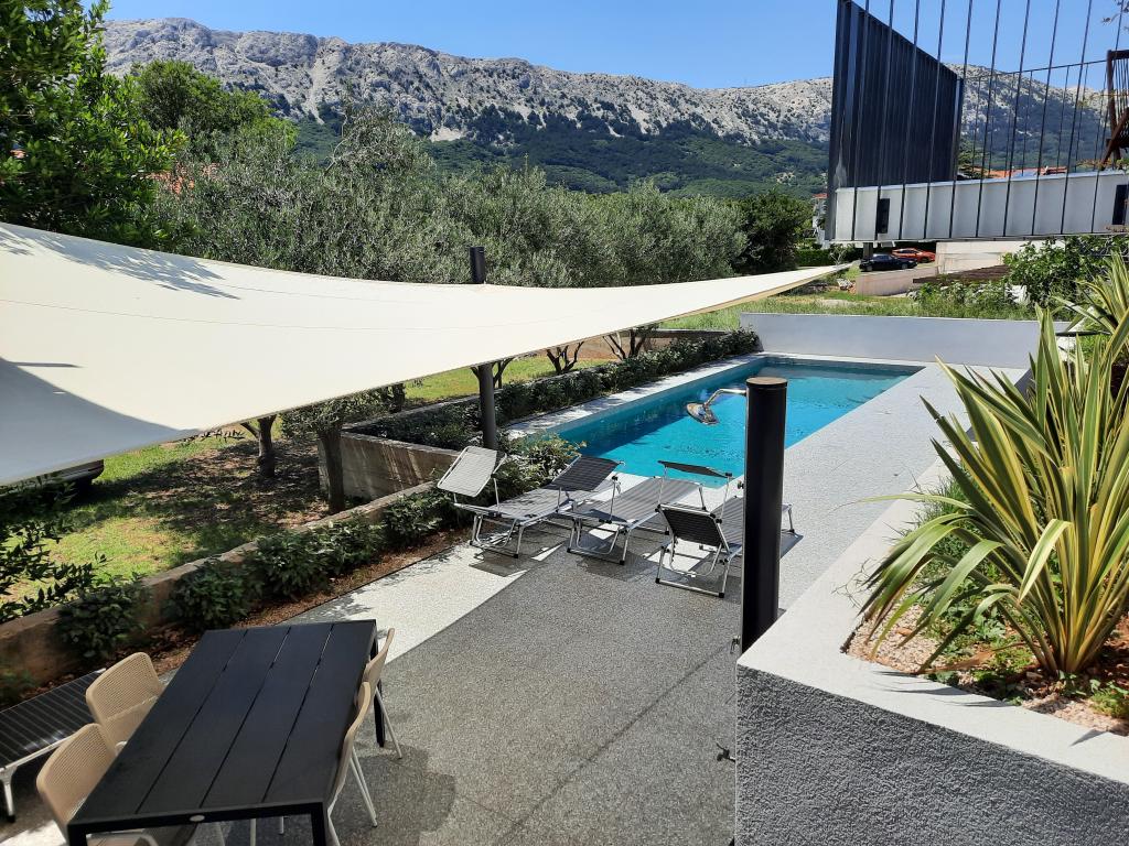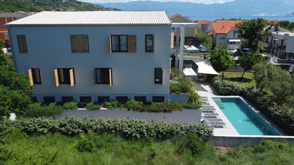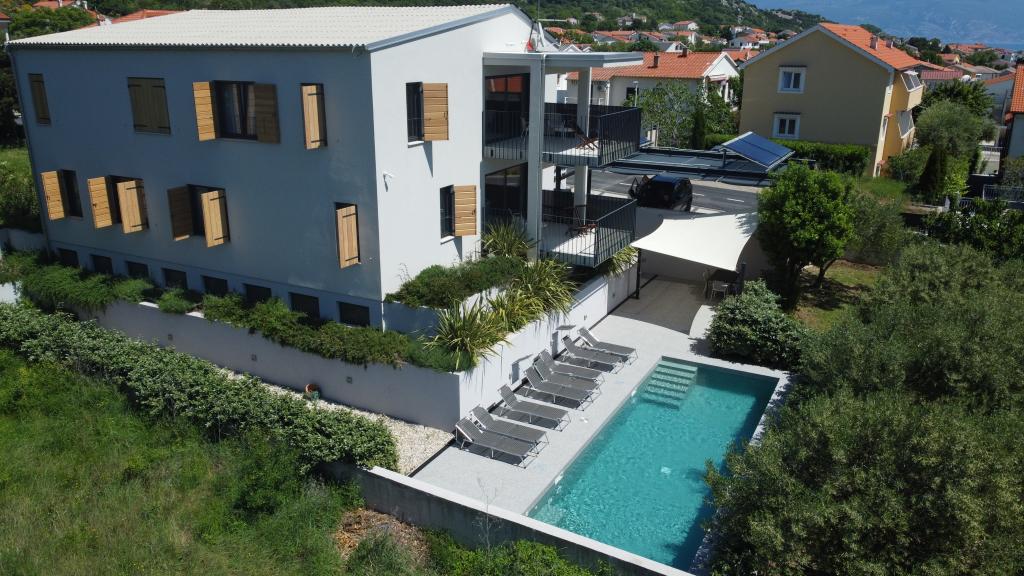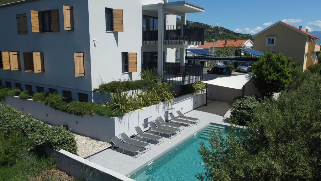 Modern ingerichte en volledig uitgeruste appartementen in een nieuw gebouw met zwembad. Aangename ontspanningsruimte rond het zwembad. Het huis ligt op een rustige locatie in Baška, op 7 minuten lopen van Vela Plaza.
