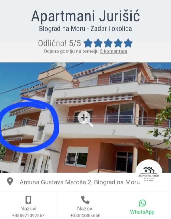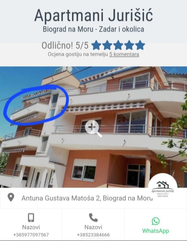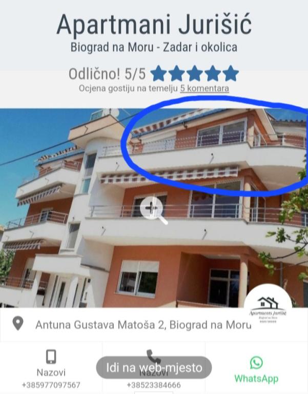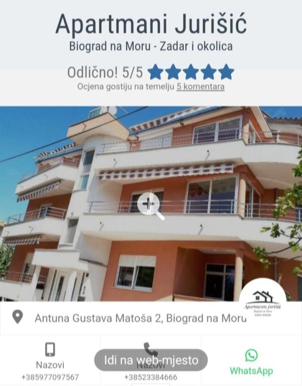 Wij zijn de familie Jurišić, met een lange traditie in toerisme van meer dan 40 jaar. In een rustig deel van het stadscentrum van Biograd na Moru (vlakbij het hotel "Ilirija"), bevinden zich onze twee huizen, op slechts 50 meter van de zee, de boulevard, de waterkant en andere voorzieningen... restaurants, winkels, postkantoor... Alle appartementen zijn voorzien van airconditioning (er is airconditioning in elke kamer en woonkamer), er zijn horren voor de ramen en elk appartement heeft een eigen balkon, beveiligde parkeerplaats, Wi-Fi en barbecue voor gebruik. Prijzen (op datum) staan vermeld in de prijslijst van elk appartement (extra bed - bank voor 2 extra personen/kinderen kost +10 euro/nacht).