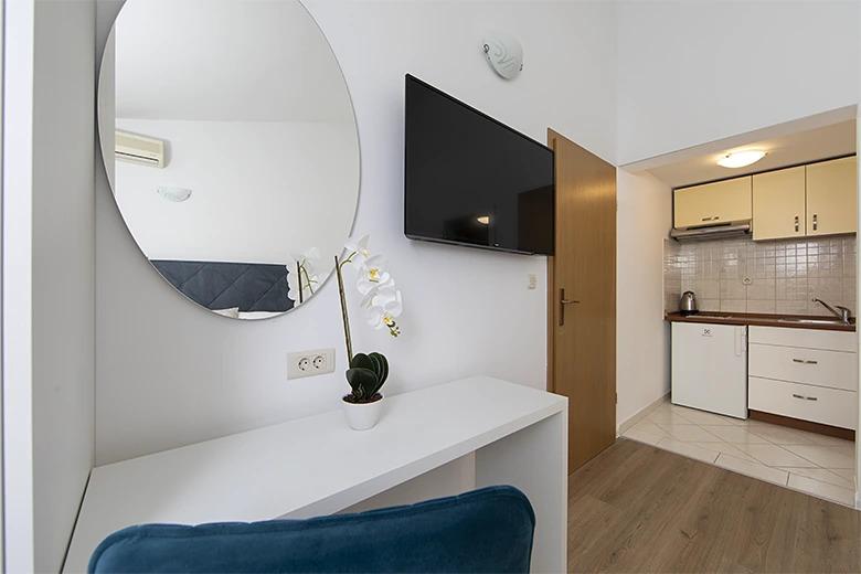 De studio is erg schoon, het afval wordt elke dag opgehaald en de handdoeken worden indien nodig vervangen. De uitrusting is mooi, modern, alles werkt. De keuken is klein, de apparatuur is hier ook geschikt voor - alleen het hoognodige. Het balkon is alleen geschikt om 's ochtends op te zitten, omdat het overdag te warm wordt. De airconditioning werkt perfect. Tijdens de avondspits wordt de Wi-Fi-verbinding vaak onderbroken. De gastheren zijn erg vriendelijk en behulpzaam. Het strand is erg mooi en biedt veel schaduw; vooral Punta Rata. De zee is schoon, prachtige kleuren.