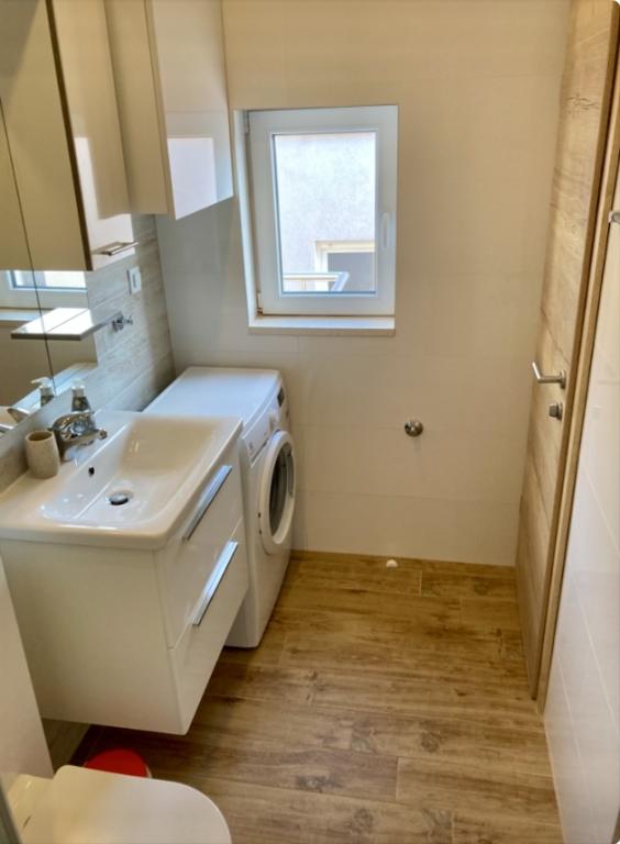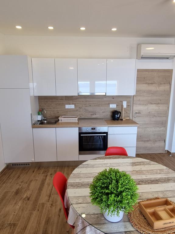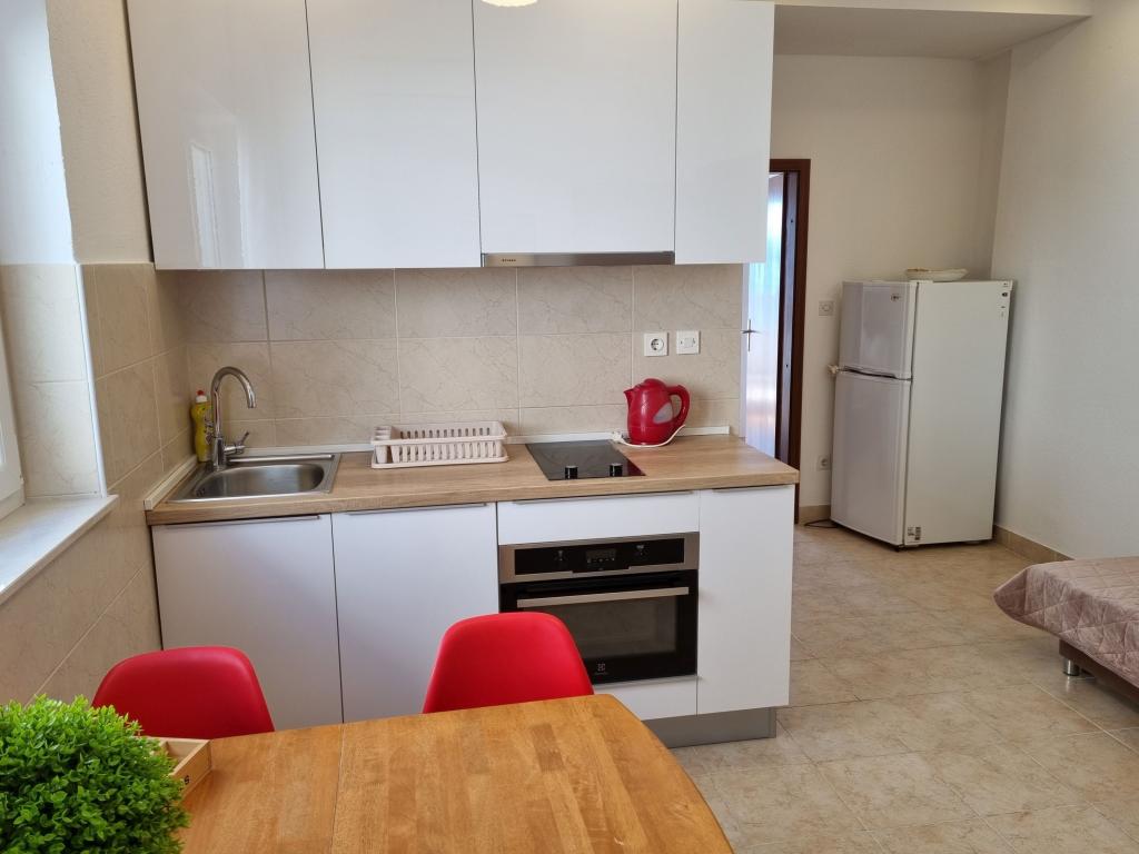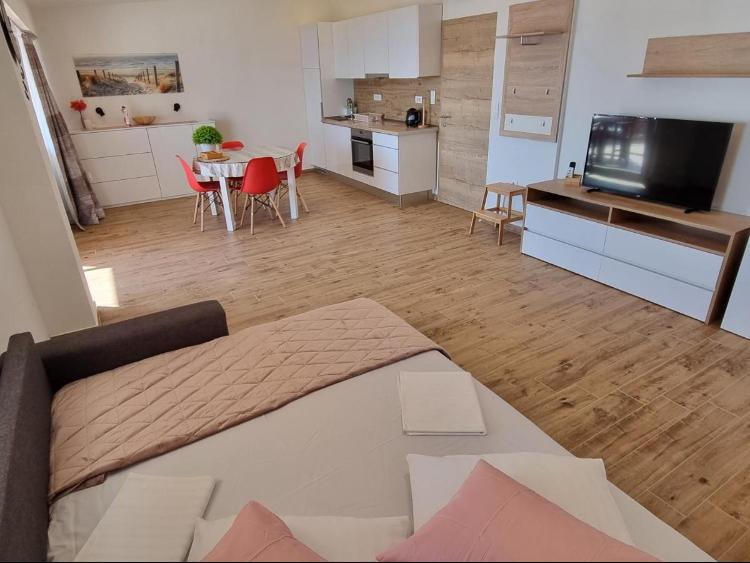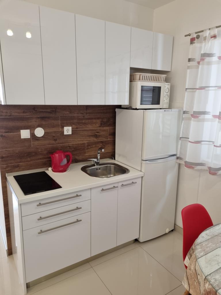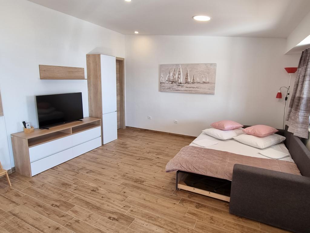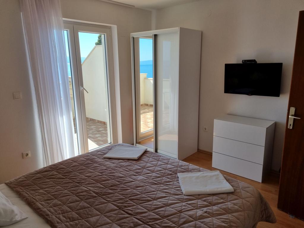 Het gebouw is gelegen in een zeer rustige (doodlopende) straat waar geen verkeer is (alleen auto's van de gasten en gebouweigenaren) en biedt een prachtig uitzicht op het dennenbos, de zee en het nabijgelegen eiland Brač. De afstand tot het strand en het centrum van de stad is ongeveer 300 meter. Onze parkeerplaats is beveiligd voor het gebouw.