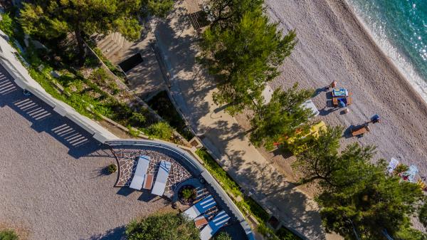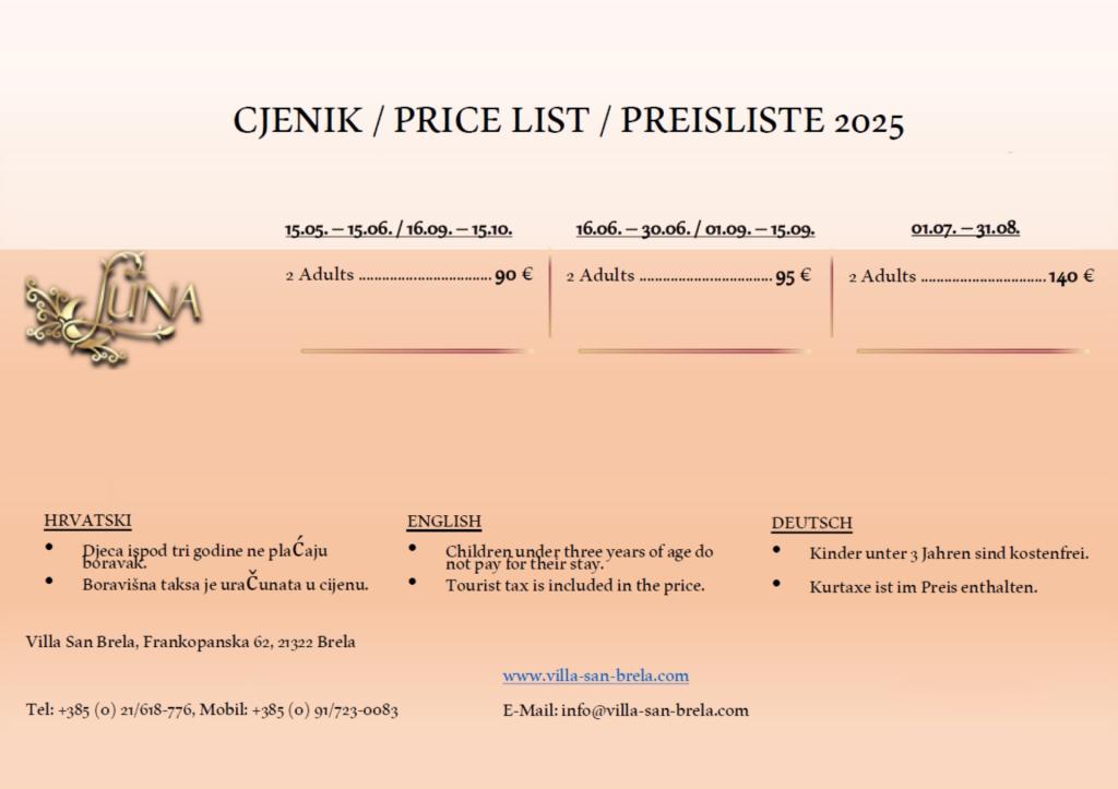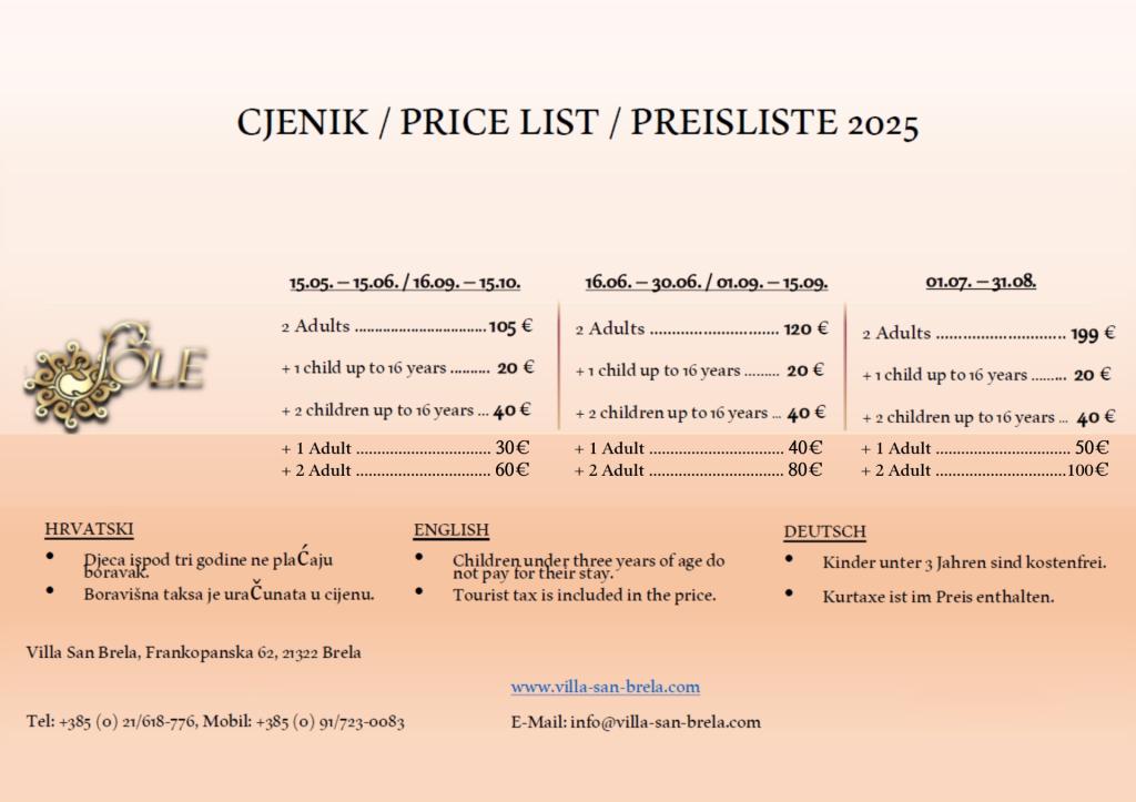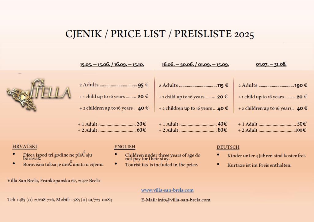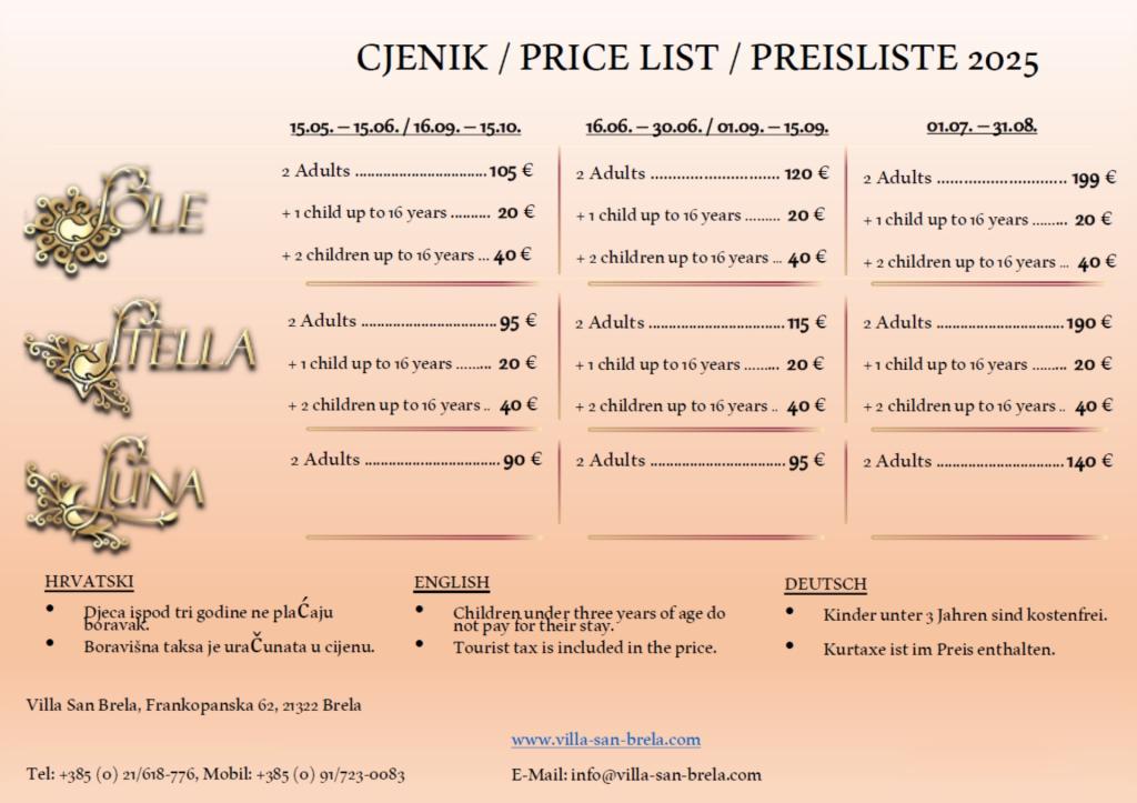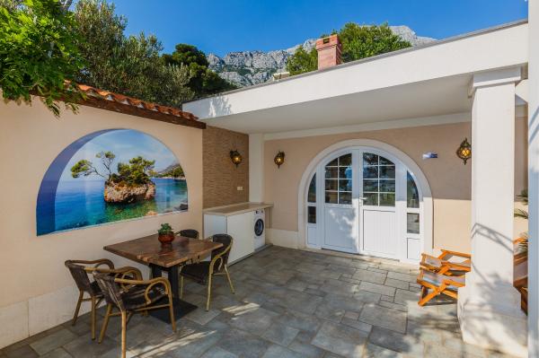 Villa SAN was een droom Ned en Ante die een realiteit in het prachtige Brela en die vandaag de dag delen met hun gasten werd. Op de realisatie ervan opgeleid gastronomen werken al meer dan 30 jaar in zijn familie restaurant in Duitsland. 1998 hun inspanningen uiteindelijk werd gekroond door het kopen van een oude villa in een rustige omgeving dicht bij de zee. Zeven jaar van blijvende werk van renovatie van de villa, gebouwd in 1937, terwijl al helemaal niet aan de wensen van Ned en Ante aan te passen. Vandaag de dag, vrienden en gasten zijn beschikbaar vanaf 15 04th-15e 10e elk jaar drie prachtig en comfortabel ingericht appartement genaamd Luna, Sole en Stella. Elk appartement heeft zijn eigen charme en stijl - zij het op de open haard, mooi terras en een prachtig uitzicht op de zee. De idyllische tuin met palmbomen en diverse planten en bloemen nodigt uit om te rusten. Voor deze oase eigenaars in 2008 van de gemeente kreeg een award beste tuin in Brela, waarop ze zijn bijzonder trots op zijn.