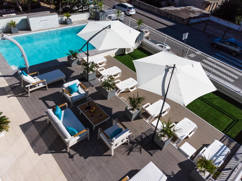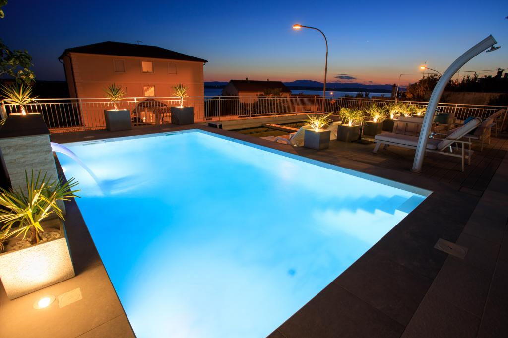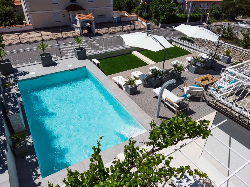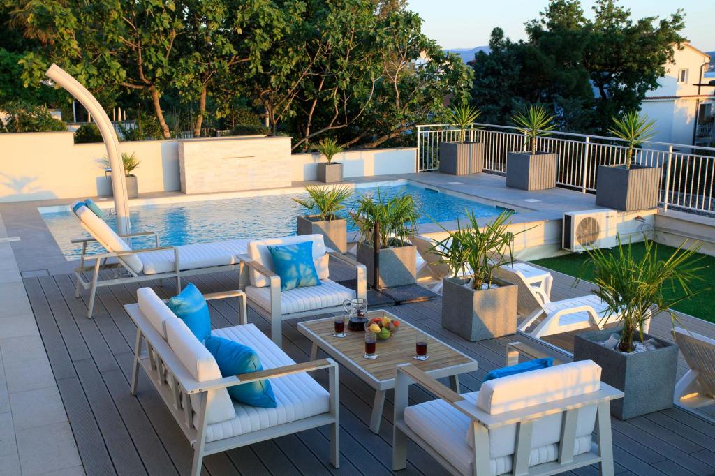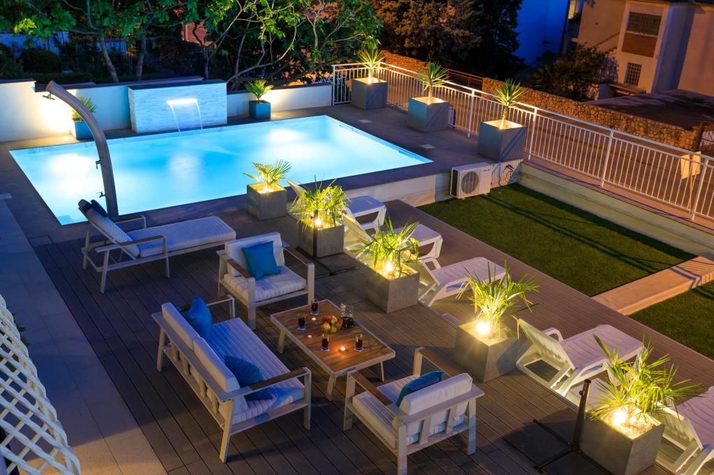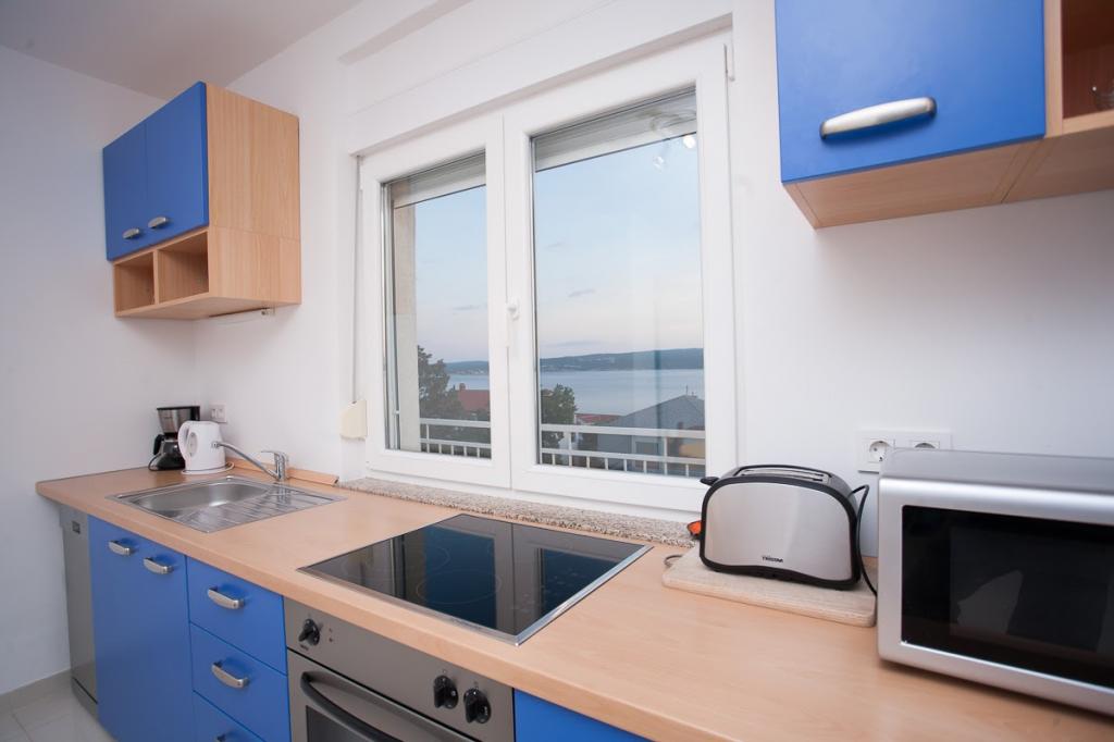 Modern ingerichte, luxe appartementen met 4 sterren, airconditioning en gratis internet. Mogelijkheid voor nog een persoon op een extra bed (€ 15/dag). Huisdieren toegestaan (€ 10/dag). Gebruik van een wasmachine (7 euro per wasbeurt). De appartementen bestaan uit twee slaapkamers, woonkamer, keuken, badkamer met toilet en nog een apart toilet. Aan de zuidkant van het huis heeft elk appartement een terras met uitzicht op de zee en het zwembad. Het zwembad is eco, wat betekent dat er geen chloorgeur of irritatie aan de ogen of huid is. Zeer veilig voor de gezondheid van kinderen. Elk appartement heeft een eigen parkeerplaats, die 24 uur per dag onder videobewaking staat. Op de begane grond van de woning bevindt zich een winkel met eten en drinken. Het dichtstbijzijnde strand ligt op 4 minuten lopen. De faciliteit ligt op 20 minuten lopen van het stadscentrum, er is een mogelijkheid tot vervoer per toeristentrein, waarvan de halte voor het huis ligt.