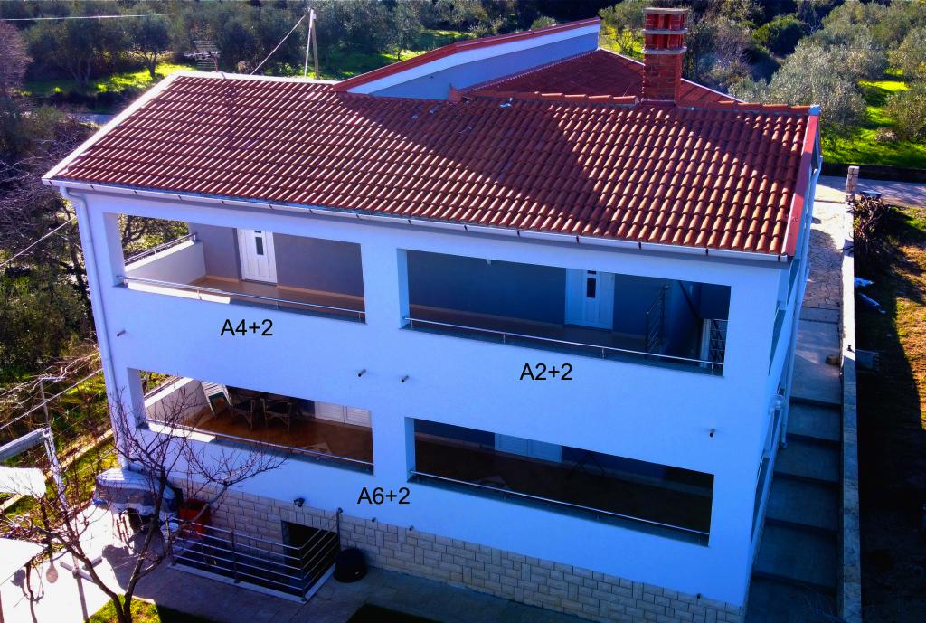 Het gebouw heeft 3 appartementen. Het grootste appartement, A6+1, beslaat de gehele begane grond, circa 90 m², met een terras van 30 m². Op de eerste verdieping bevinden zich de appartementen A4+1 en A2+1, elk circa 45 m² groot en met een gedeeld terras van 30 m². De terrassen bieden uitzicht op zee. De appartementen zijn volledig uitgerust en voorzien van airconditioning. Het gebouw ligt op 50 meter van de zee. Het gebouw is gelegen in een afgelegen gebied. Het strand voor het appartement is van beton en voor 50% in de schaduw. Er is een parkeerplaats voor het gebouw. Er is ook een grote barbecue/bakplaats/braadplaats die gratis door gasten gebruikt kan worden. Daarnaast zijn er een grote tafel en banken voor de barbecue. Het stadje Dobropoljana ligt op 200 meter afstand. Het centrum is op 5 minuten loopafstand. In het centrum vindt u 2 winkels, een groot, goed onderhouden zandstrand, een uitstekend restaurant en een kleine jachthaven. Er is ook ruimte voor het gebouw om een boot aan te meren, en in Dobropoljana kan de boot met een trailer te water worden gelaten of uit het water worden gehaald.