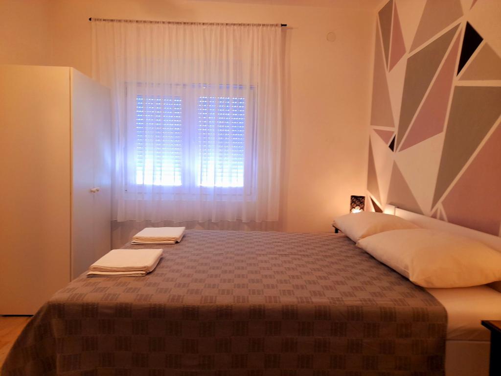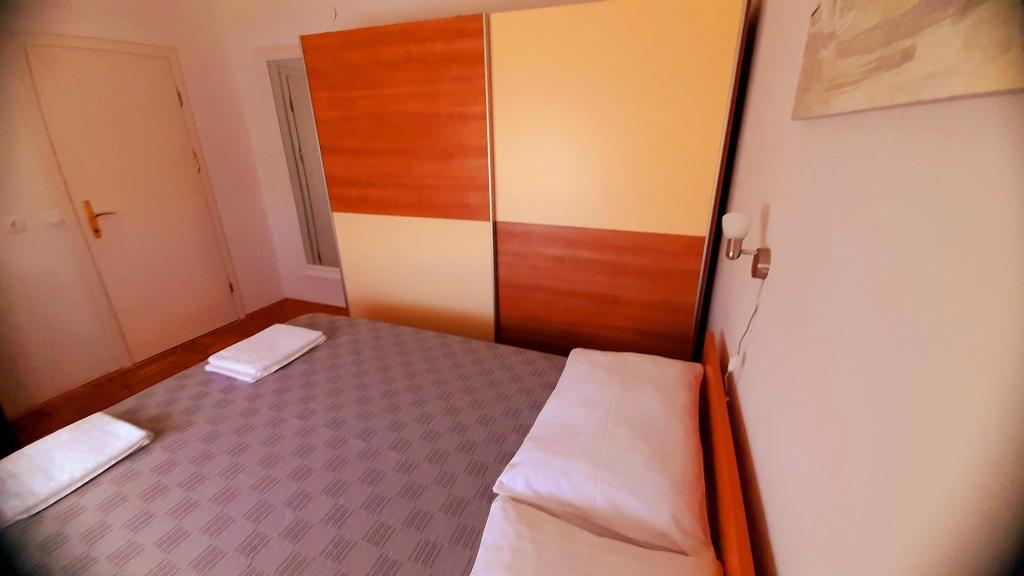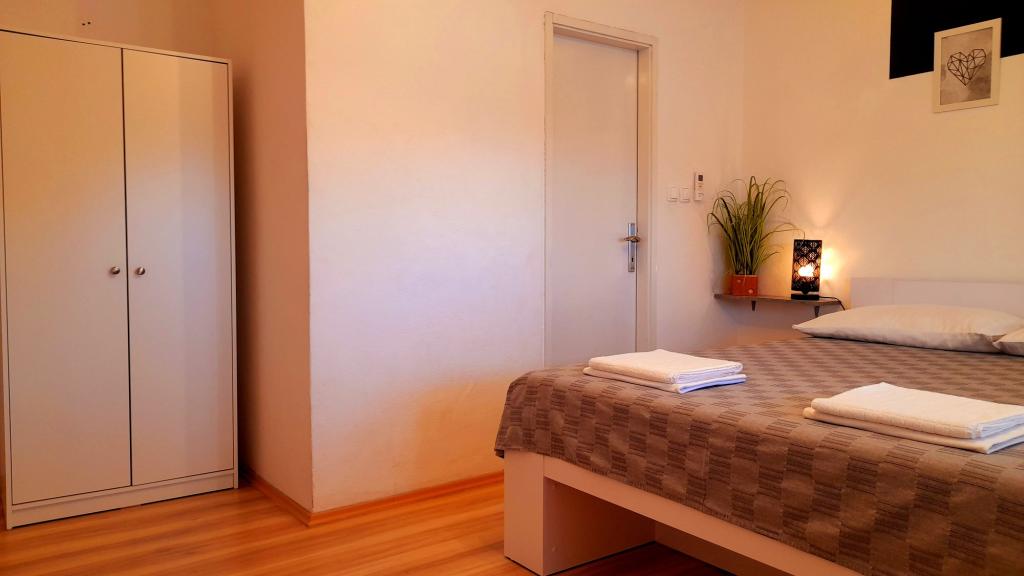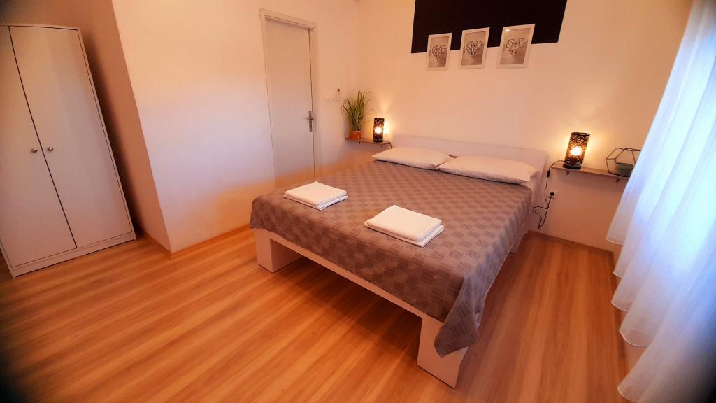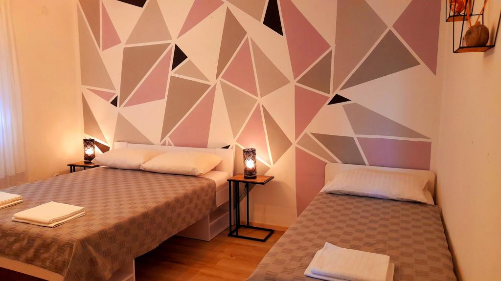 Appartement Mediteran, A7+5, Drage (Pakoštane, Zadar) Ruime en goed uitgeruste accommodatie voor 7-12 personen, met een groot terras! Appartement Mediteran is een zeer ruim en goed uitgerust appartement, met een totale woonoppervlakte van 100m2 met een groot ruim terras van 15m2 en één klein balkon. Het appartement bestaat uit drie slaapkamers, drie badkamers, een keuken met eetkamer, twee woonkamers, een hal, een wasruimte, een klein balkon en een groot terras. In twee slaapkamers staan tweepersoonsbedden van 160 cm breed, in de derde kamer staat een tweepersoonsbed van 160 cm breed, een bed van 90 cm breed en een uitschuifbaar bed van 90 cm breed. In de woonkamer staan twee uitschuifbare bedden van 160 cm breed. Het appartement heeft in totaal 7 hoofdbedden en 5 extra bedden. We bieden ook 2 draagbare babybedjes. Het appartement is voorzien van airconditioning en beschikt over gratis wifi plat internet. Gasten hebben de beschikking over een wasmachine, vaatwasser, oven, magnetron, strijkijzer, schoonmaakmiddelen, beddengoed, handdoeken...