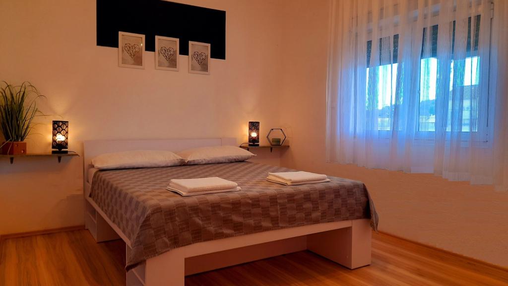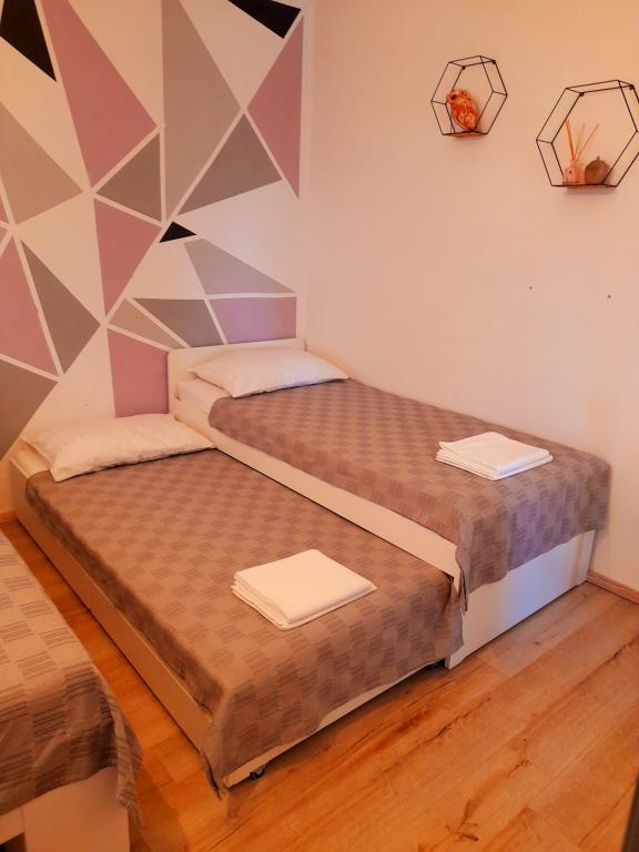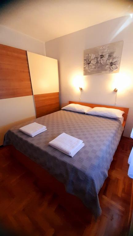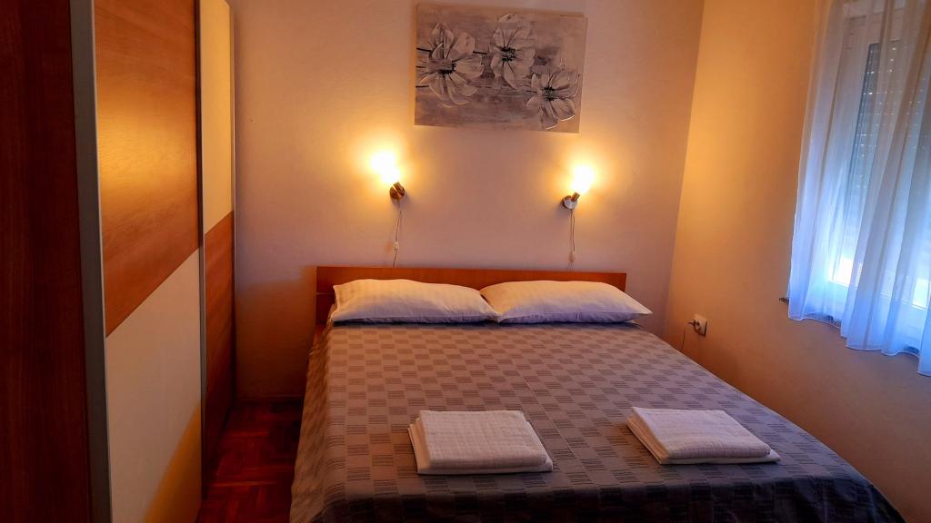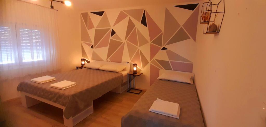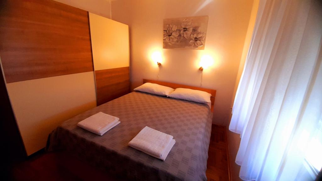 Appartement Mediteran, A7+5, Drage (Pakoštane, Zadar) Ruime en goed uitgeruste accommodatie voor 7-12 personen, met een groot terras! Appartement Mediteran is een zeer ruim en goed uitgerust appartement, met een totale woonoppervlakte van 100m2 met een groot ruim terras van 15m2 en één klein balkon. Het appartement bestaat uit drie slaapkamers, drie badkamers, een keuken met eetkamer, twee woonkamers, een hal, een wasruimte, een klein balkon en een groot terras. In twee slaapkamers staan tweepersoonsbedden van 160 cm breed, in de derde kamer staat een tweepersoonsbed van 160 cm breed, een bed van 90 cm breed en een uitschuifbaar bed van 90 cm breed. In de woonkamer staan twee uitschuifbare bedden van 160 cm breed. Het appartement heeft in totaal 7 hoofdbedden en 5 extra bedden. We bieden ook 2 draagbare babybedjes. Het appartement is voorzien van airconditioning en beschikt over gratis wifi plat internet. Gasten hebben de beschikking over een wasmachine, vaatwasser, oven, magnetron, strijkijzer, schoonmaakmiddelen, beddengoed, handdoeken...