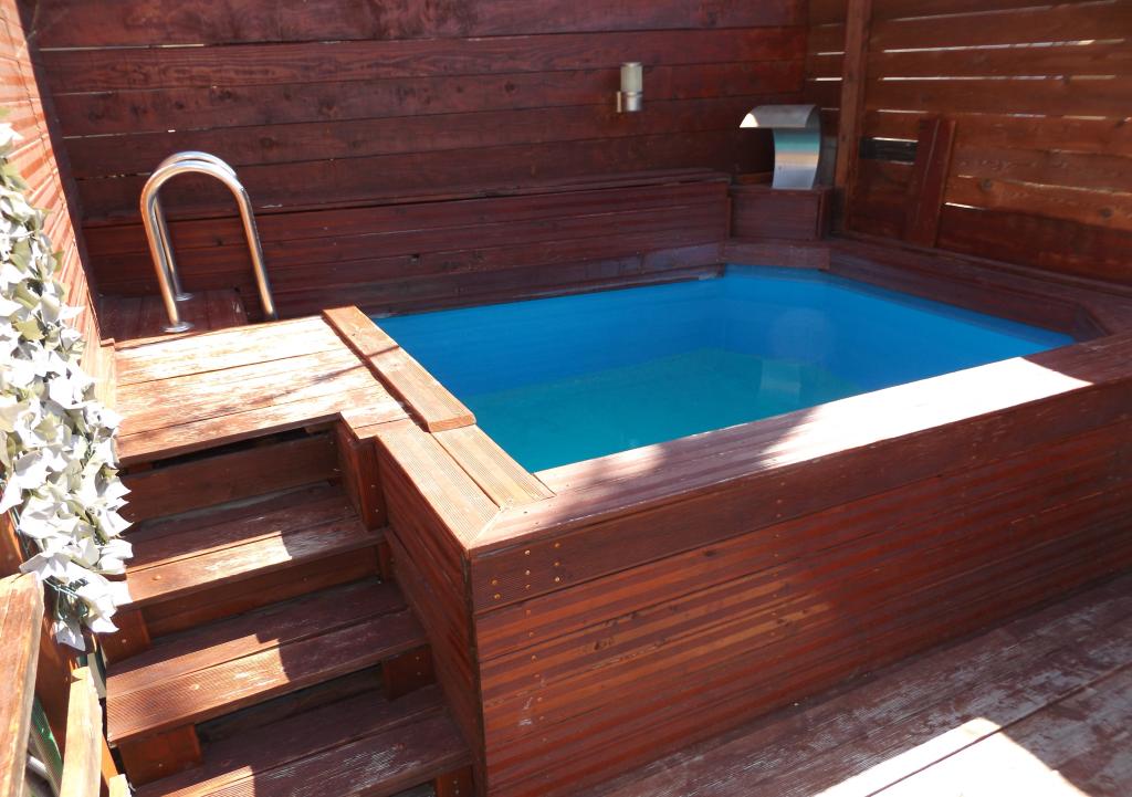 Klein zwembad, ligstoelen, overdekte parkeerplaats, elk appartement heeft een eigen balkon, terras om te zitten, barbecue en overdekte zithoek.