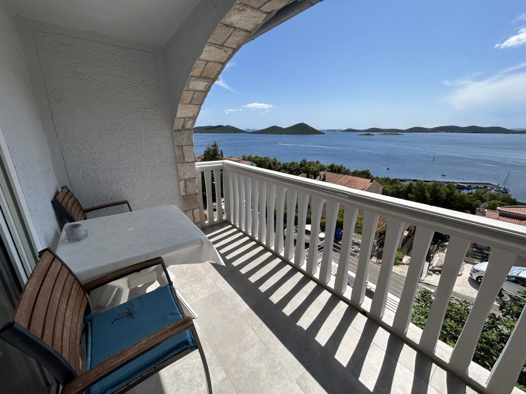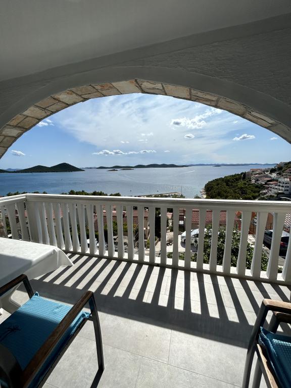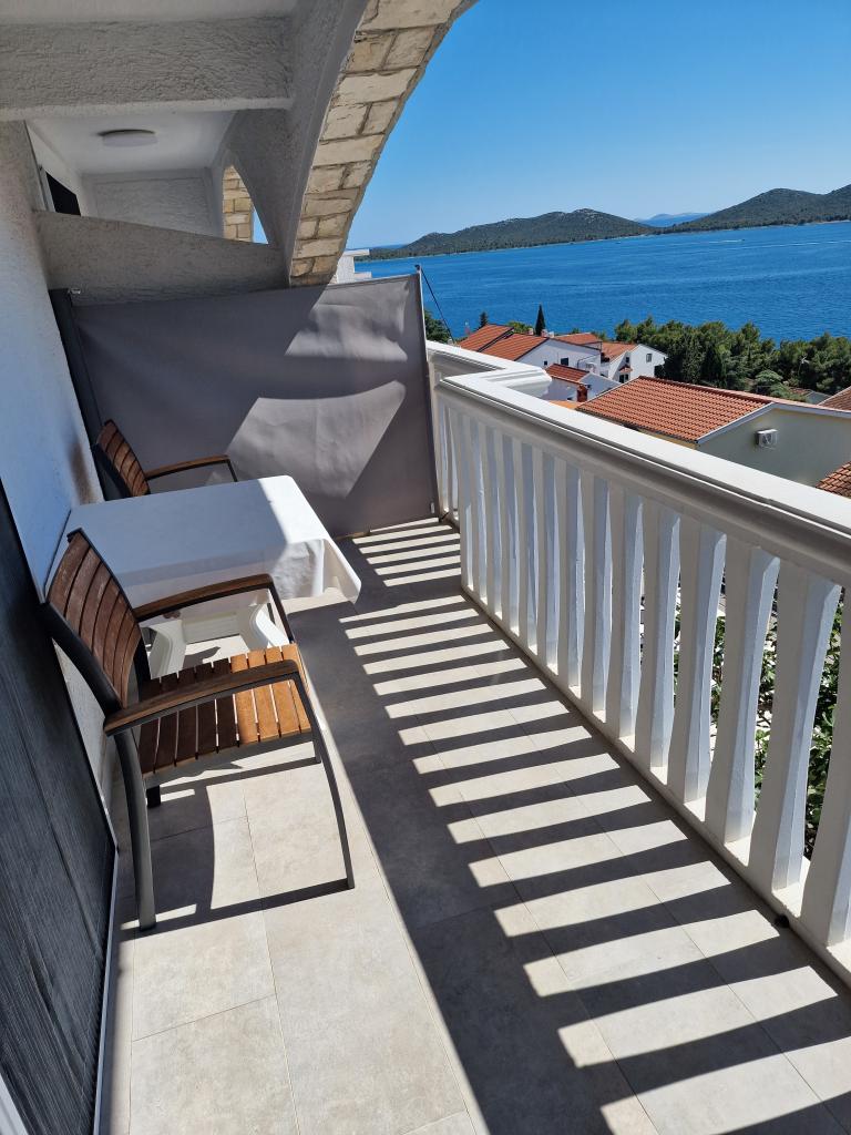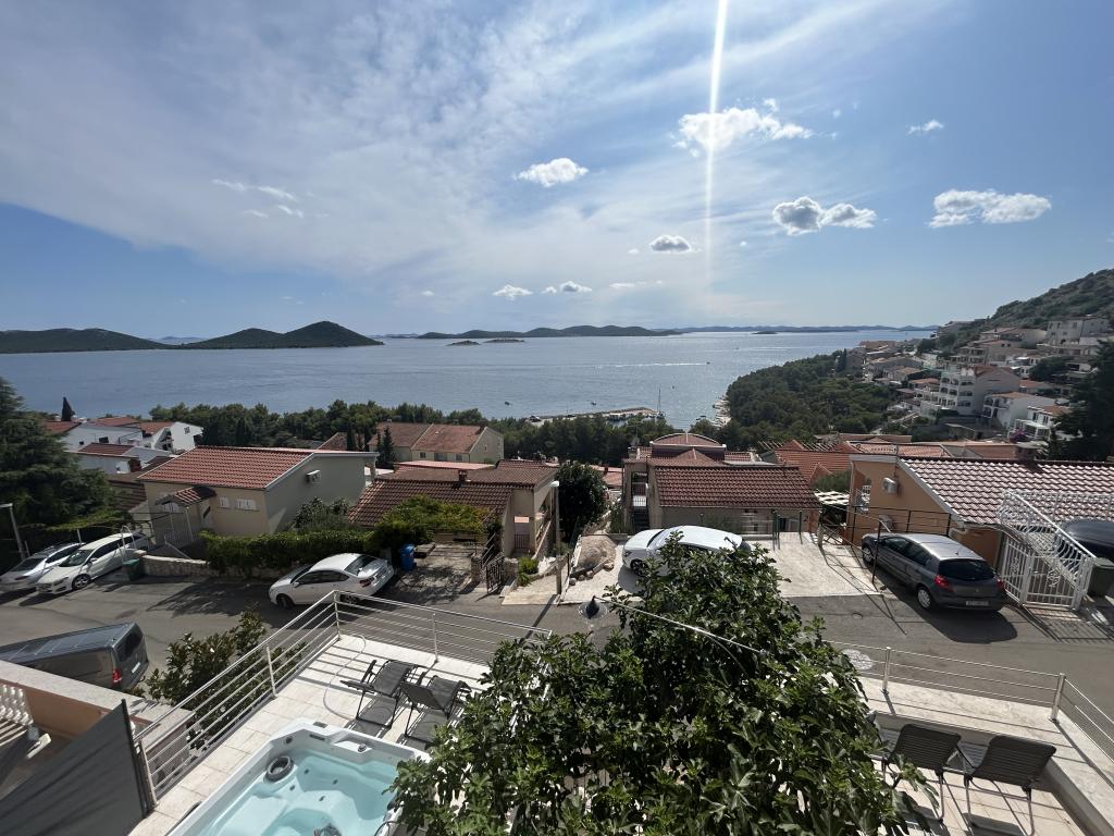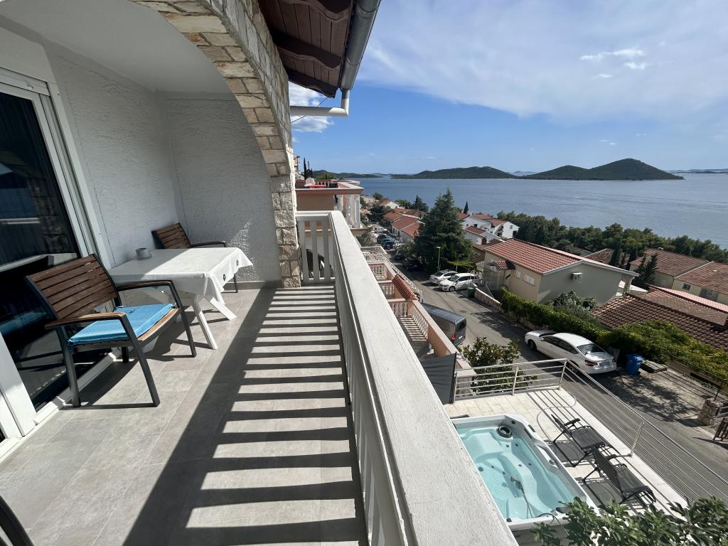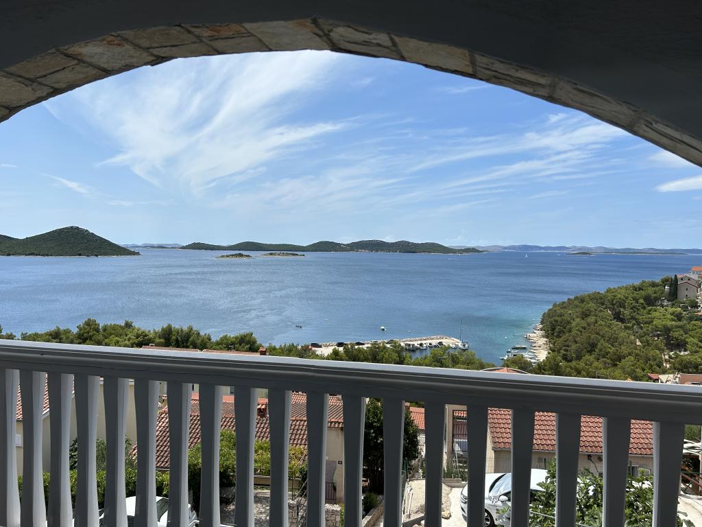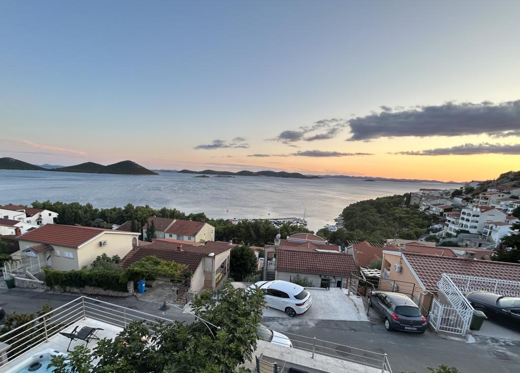 Appartement met een prachtig uitzicht op de zee en de Kornati-eilanden. Achter het appartement is er een terras met aangelegde tuin en een gemeenschappelijke barbecue. Het is 3 minuten lopen naar het strand. Langs de kust ligt een dicht dennenbos met een steen- en kiezelstrand (voor kinderen). Naast het strand is er ook een strandbar en een restaurant-pizzeria en bakkerij. De winkel ligt op slechts 300 meter afstand, 5 minuten lopen. Het natuurpark Vrana Lake ligt op 1500 meter afstand.