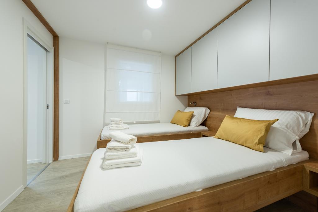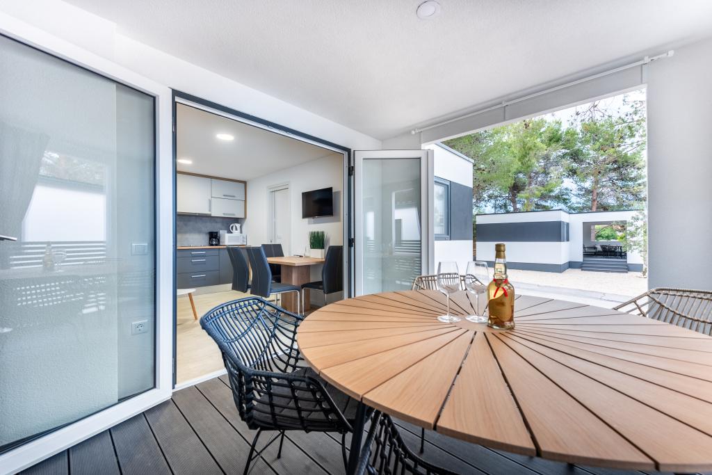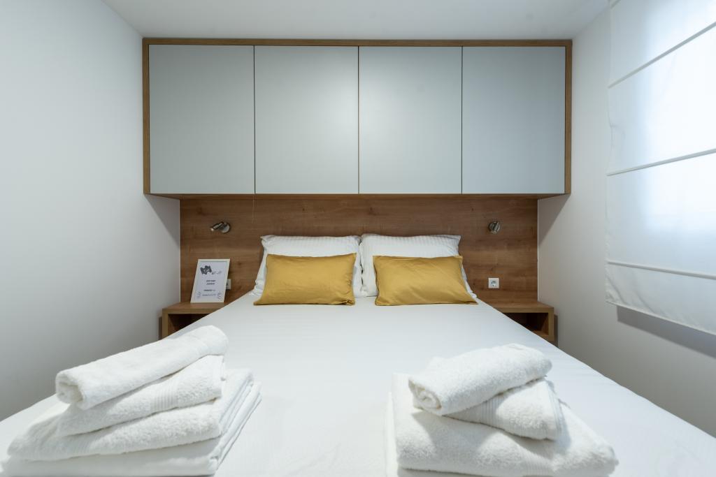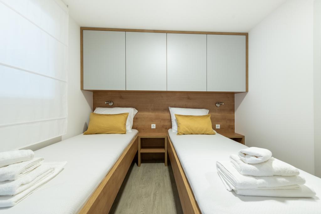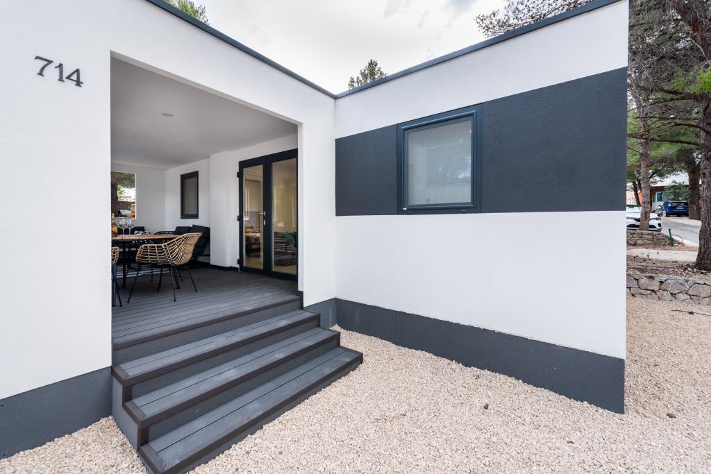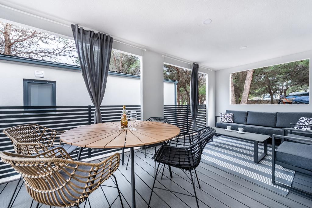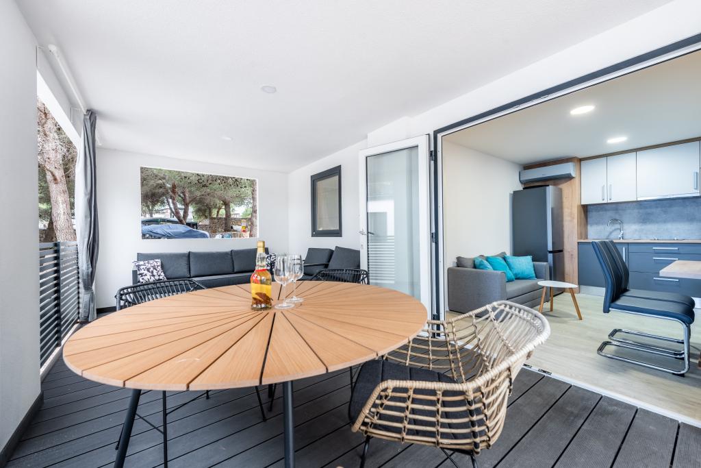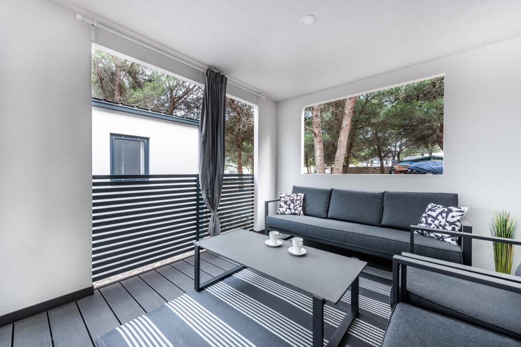 Een luxe stacaravan, modern uitgerust met een prachtig terras dat aan alle smaken zal voldoen. De stacaravan bevindt zich op de camping "Oaza mira" op een toplocatie in een schaduwrijk pijnbomenbos, op slechts 50 m van het prachtige strand. In de directe omgeving bevinden zich een groot zwembad en talrijke sportfaciliteiten (tennisbaan, jeu de boulesbaan, kinderspeelplaats). De camping beschikt over een restaurant, een supermarkt en een groot sanitairgebouw met wasruimte. De huizen hebben elk twee slaapkamers, een kamer met een tweepersoonsbed en een kamer met twee eenpersoonsbedden. In de woonkamer kan de hoekbank dienen als extra slaapplaats voor twee extra personen. Het huis beschikt over een grote woonkamer, een keuken met servies, fornuis en koelkast, en één/twee badkamers met douche, wastafel en toilet. De stacaravan beschikt over een tuin met terras en luifel.