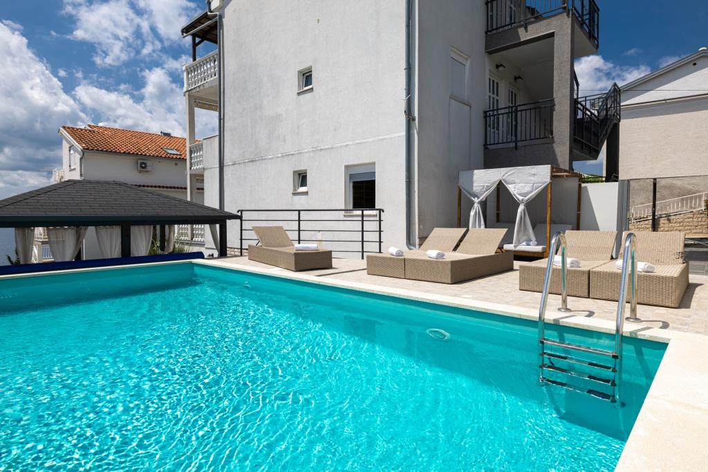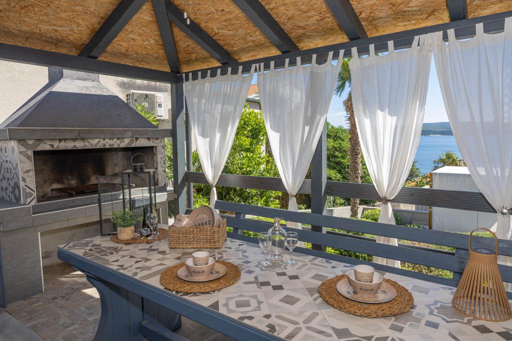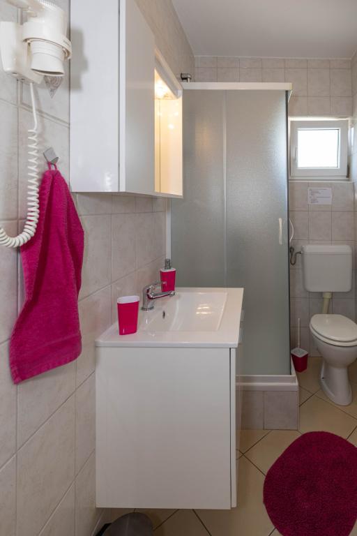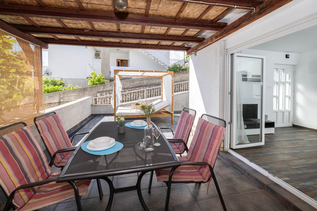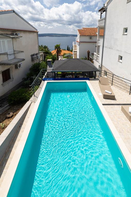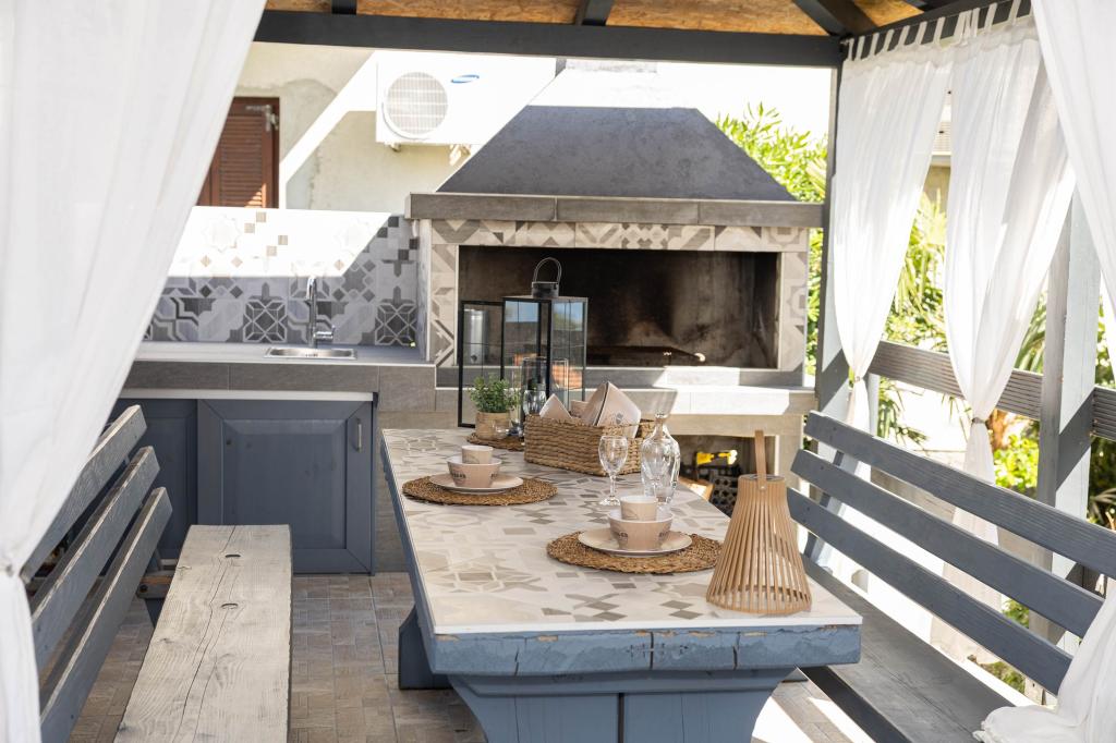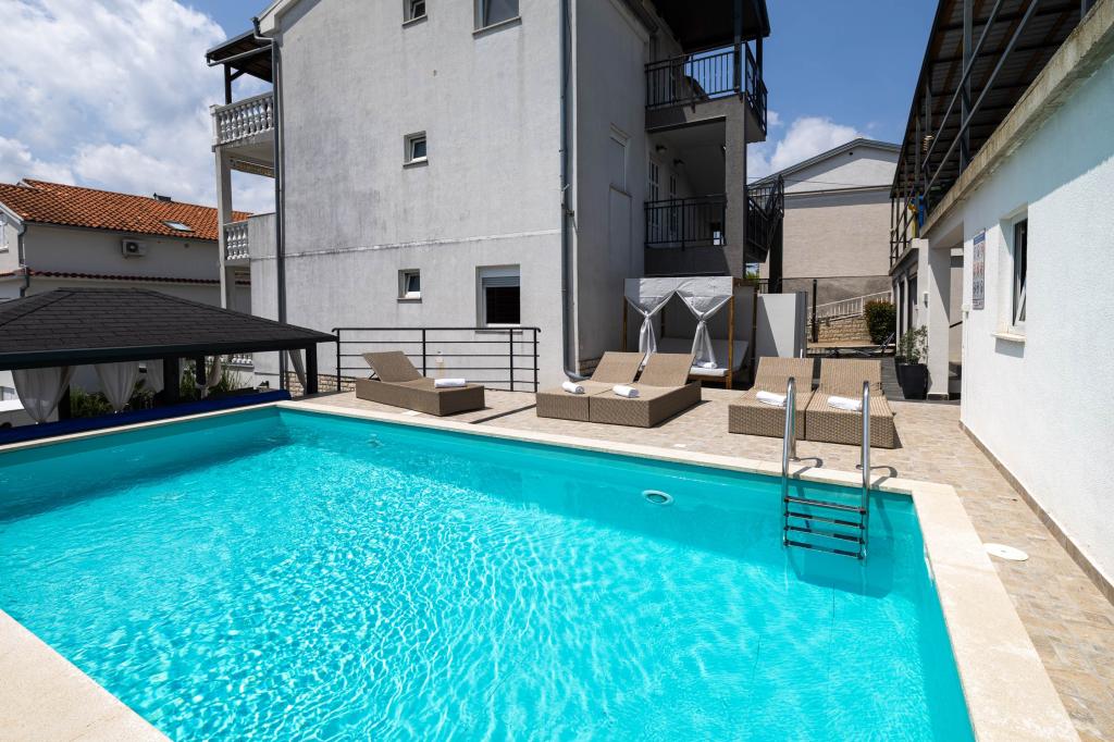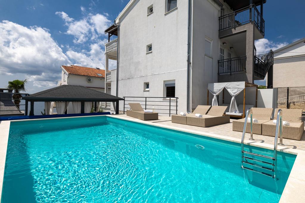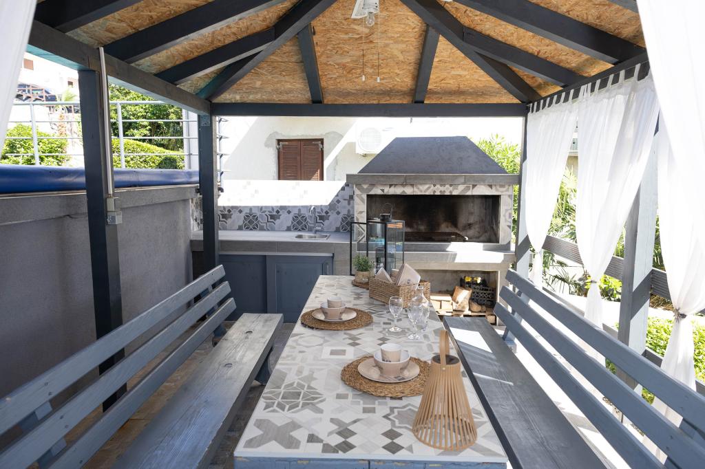 Onze accommodatie ligt op de tweede rij aan zee en is ideaal voor een ontspannen zomervakantie. Het huis beschikt over zes modern ingerichte appartementen met uitzicht op zee, die zijn uitgerust voor een aangenaam verblijf. Alle appartementen beschikken over een ingerichte keuken met waterkoker, koffiezetapparaat, broodrooster en magnetron. De badkamers zijn voorzien van een douche, toilet en haardroger. De tuin biedt talrijke faciliteiten voor ontspanning en vermaak. Er is een zwembad van 7 x 3,5 m met ligstoelen, een hydromassagebad, een douche en een prieel met een barbecue. De barbecue is uitgerust met een spoelbak en alle benodigde keukengerei. Het prieel beschikt over een grote tafel met twee banken voor grotere gezelschappen. In het overdekte gedeelte van de tuin bevinden zich een pooltafel, darts, bordspellen en een kleine bibliotheek met boeken. Er is een overdekte parkeerplaats voor het huis, één parkeerplaats per appartement. De appartementen zijn als volgt ingedeeld: A1 en A2 op de begane grond, A3 op de eerste verdieping, A5 op de tweede en A7 en A8 op de derde verdieping. Welkom!!!