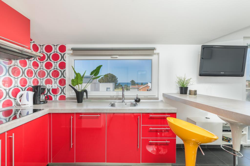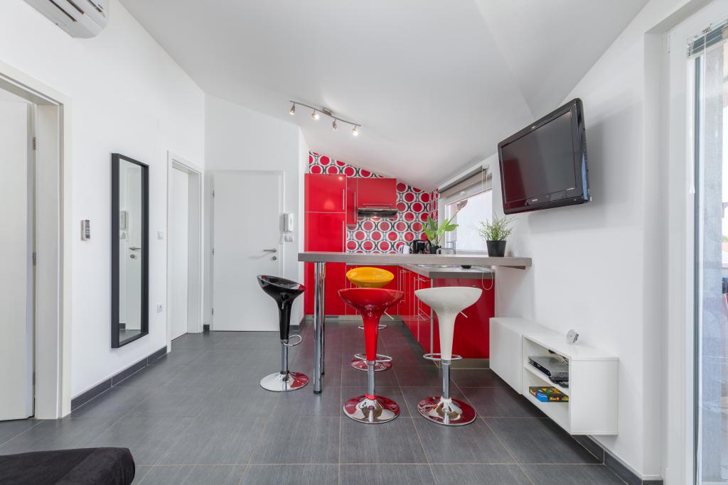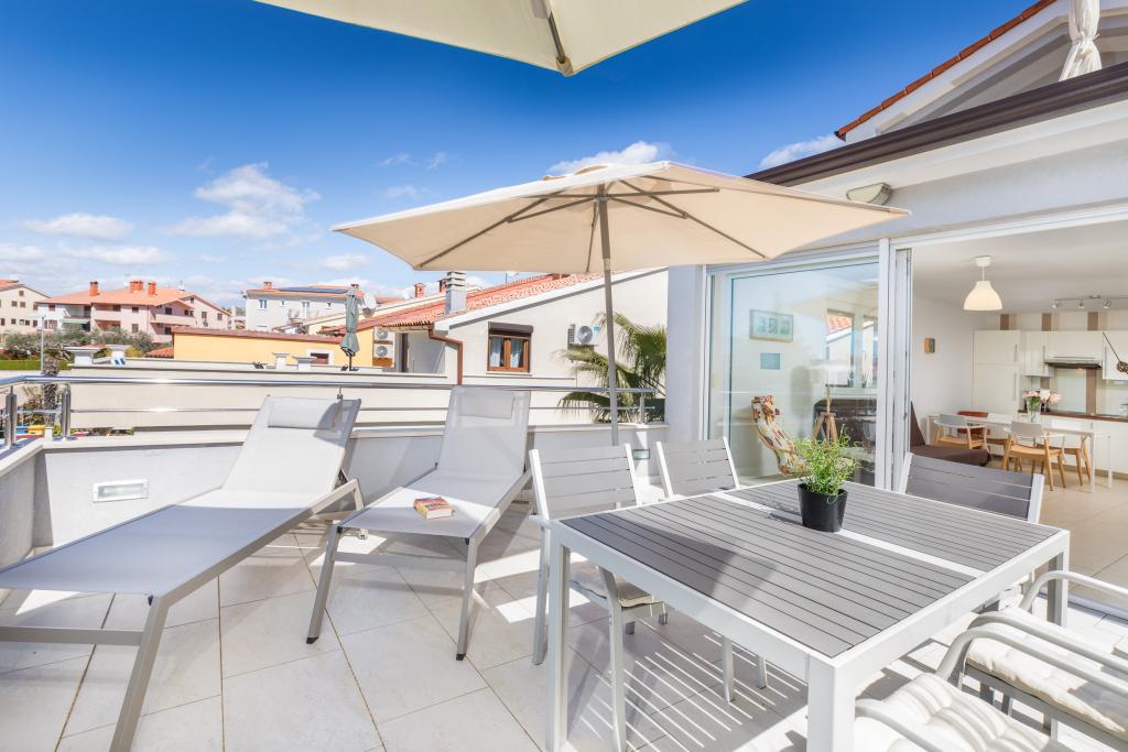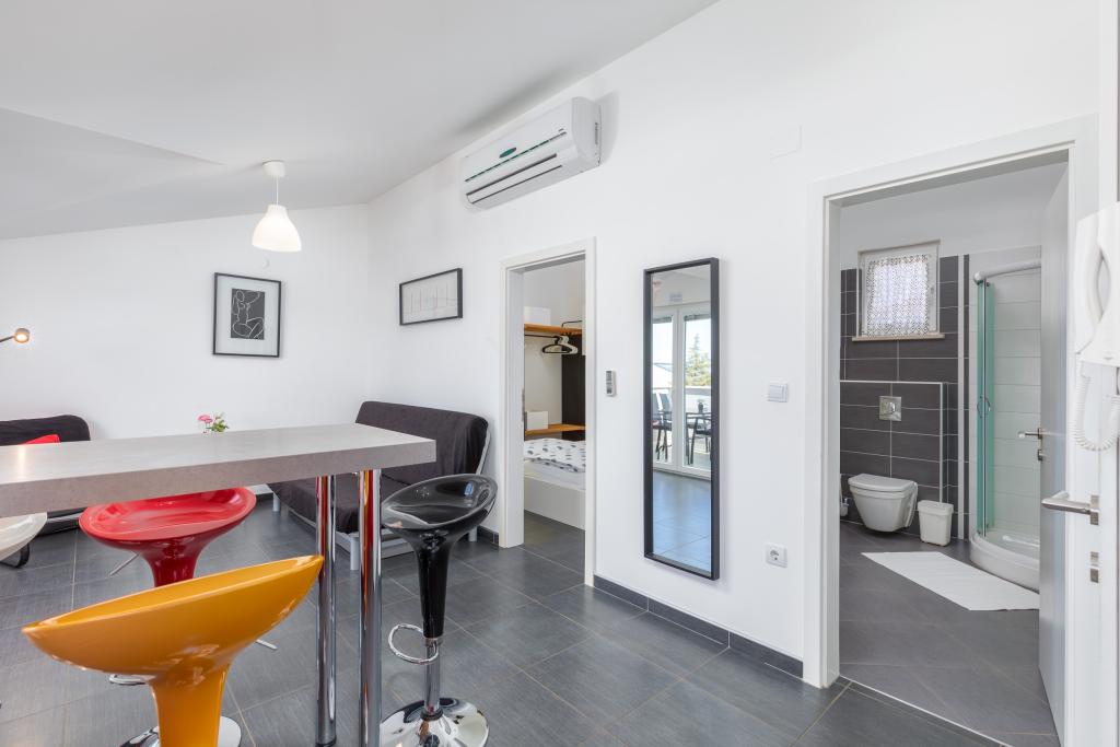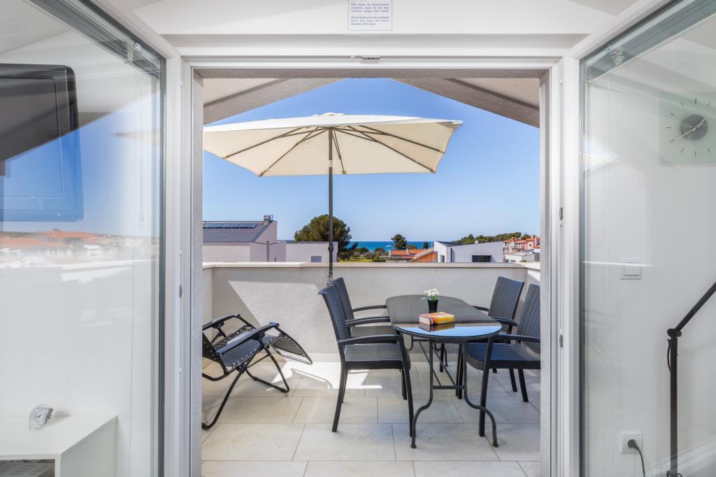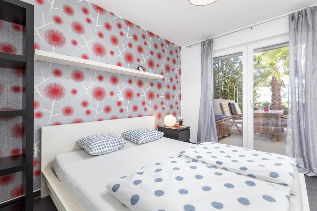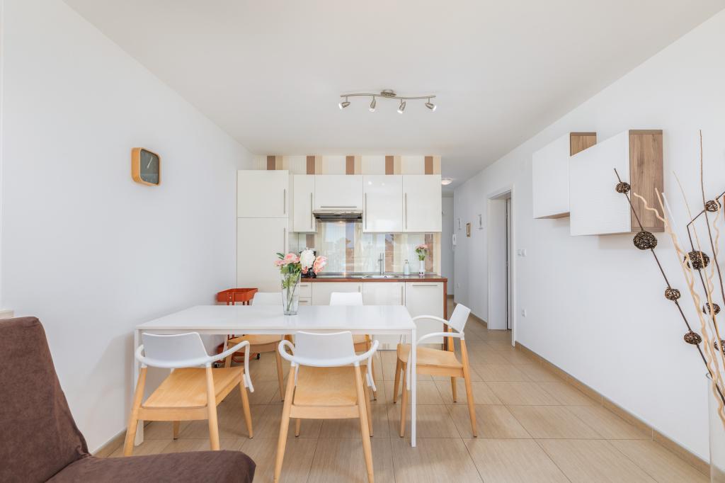 Modern huis met 5 appartementen, met uitzicht op de zee, 200 m van het strand. Elk appartement heeft een parkeerplaats voor het huis. Nabij het gebouw is er een compleet programma dat nodig is voor een aangename vakantie. (winkelen, strand, dokter, restaurants, bar, oude stad, etc.) Dit alles is binnen een paar minuten lopen.