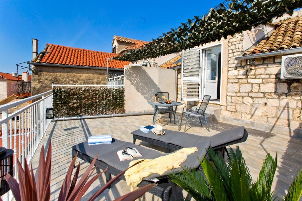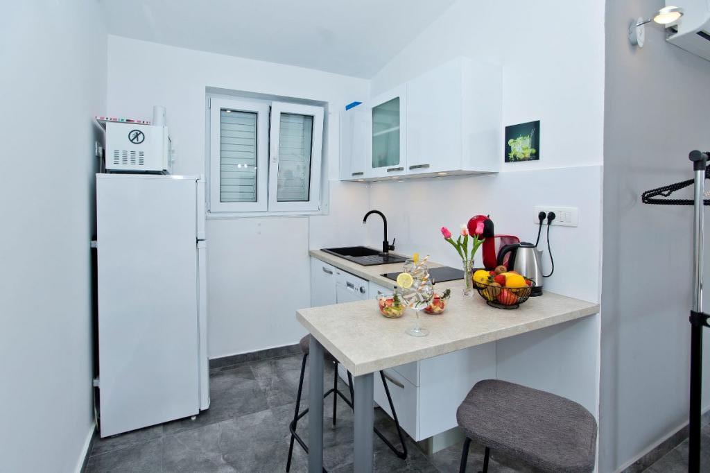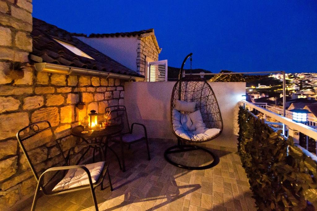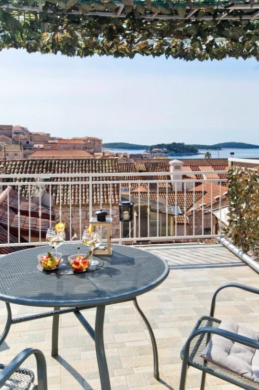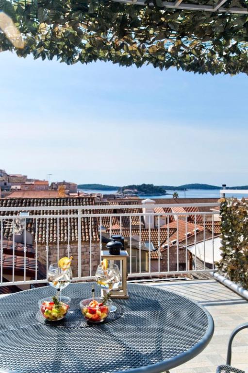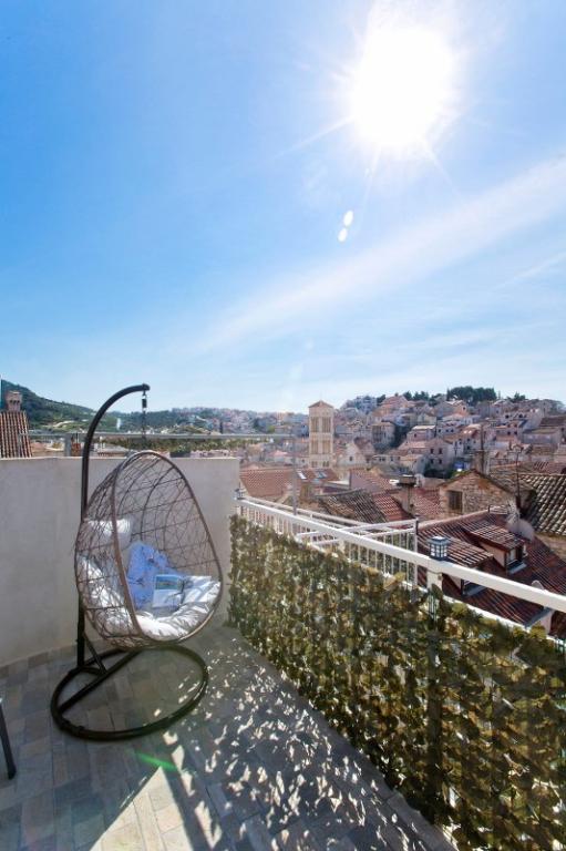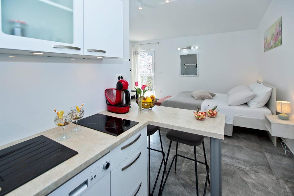 Elegant ingerichte studio-appartementen, gelegen in het hart van Hvar, bieden de perfecte combinatie van comfort en een uitstekende locatie. De appartementen zijn licht en modern, voorzien van een comfortabel tweepersoonsbed (160 x 200 cm), een volledig uitgeruste keuken met alle benodigde voorzieningen (koelkast met vriezer, waterkoker, broodrooster, kookplaten, magnetron, vaatwasser), een badkamer met inloopdouche, airconditioning en beide een eigen terras (buitentafel, stoelen en ligstoelen) met een betoverend uitzicht op de oude stad en de prachtige haven van Hvar. Beleef het beste van Hvar letterlijk voor de deur: charmante cafés, toprestaurants, gezellige ontbijttentjes, lokale boetiekjes en souvenirwinkels. Het centrale stadsplein met de Sint-Stephansdom en het oudste openbare theater van Europa liggen op slechts 3 minuten lopen. U verblijft in het hart van Hvar, maar toch in een perfect rustige straat die garant staat voor een vredige en aangename nachtrust.