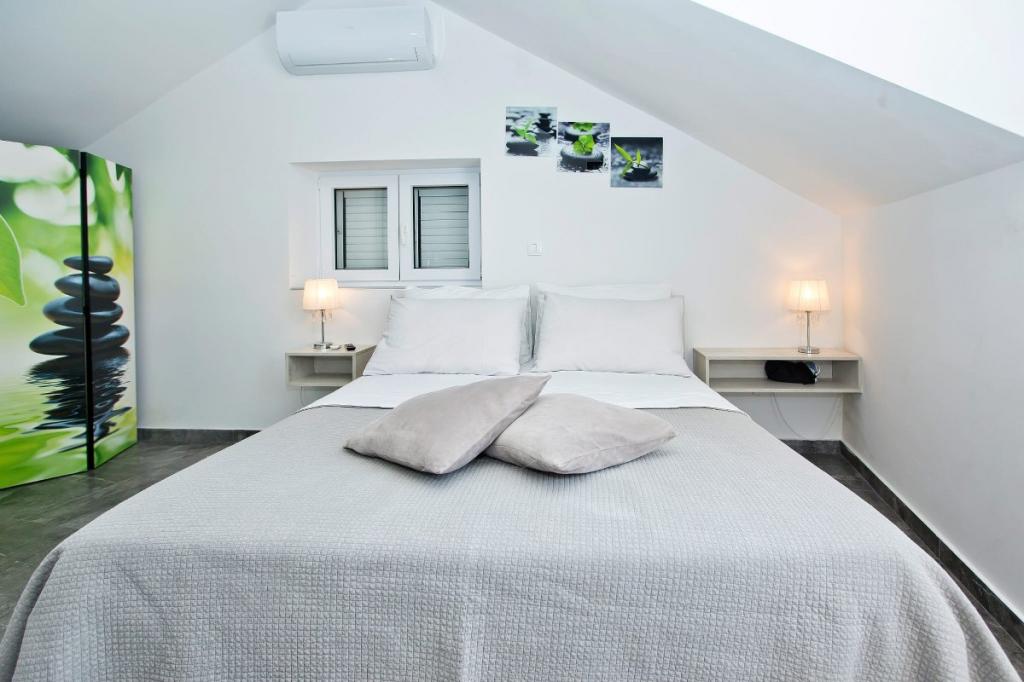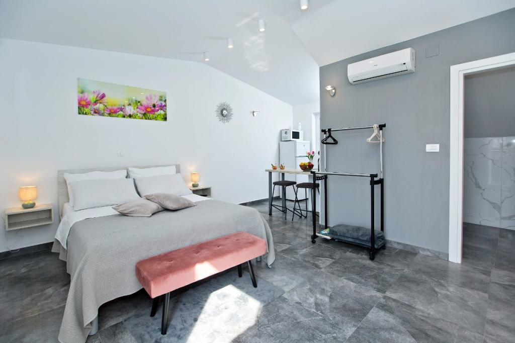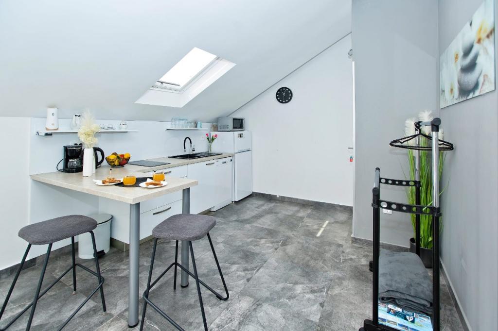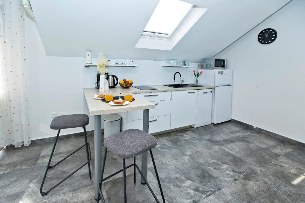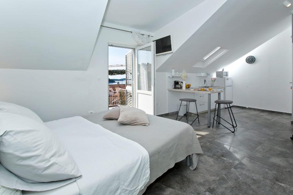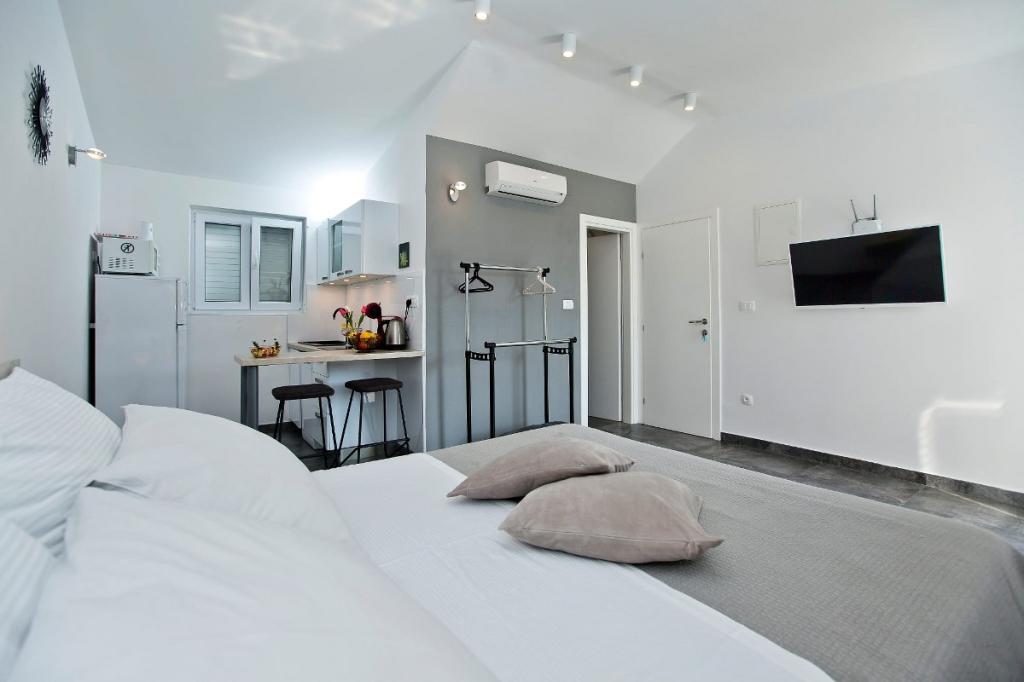 Elegant ingerichte studio-appartementen, gelegen in het hart van Hvar, bieden de perfecte combinatie van comfort en een uitstekende locatie. De appartementen zijn licht en modern, voorzien van een comfortabel tweepersoonsbed (160 x 200 cm), een volledig uitgeruste keuken met alle benodigde voorzieningen (koelkast met vriezer, waterkoker, broodrooster, kookplaten, magnetron, vaatwasser), een badkamer met inloopdouche, airconditioning en beide een eigen terras (buitentafel, stoelen en ligstoelen) met een betoverend uitzicht op de oude stad en de prachtige haven van Hvar. Beleef het beste van Hvar letterlijk voor de deur: charmante cafés, toprestaurants, gezellige ontbijttentjes, lokale boetiekjes en souvenirwinkels. Het centrale stadsplein met de Sint-Stephansdom en het oudste openbare theater van Europa liggen op slechts 3 minuten lopen. U verblijft in het hart van Hvar, maar toch in een perfect rustige straat die garant staat voor een vredige en aangename nachtrust.