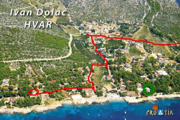 Het huis is gelegen in Ivan Dolac, aan de zuidkant van het eiland Hvar. Het is een rustige en vredige plek met een dennenbos, geschikt voor mensen die op zoek zijn naar een plek om te rusten. Er zijn veel kiezelstranden, drie restaurants, een kleine winkel en een bakker. Het huis ligt op 50 meter van het eerste strand. De straat is erg rustig en er is zelden verkeer.