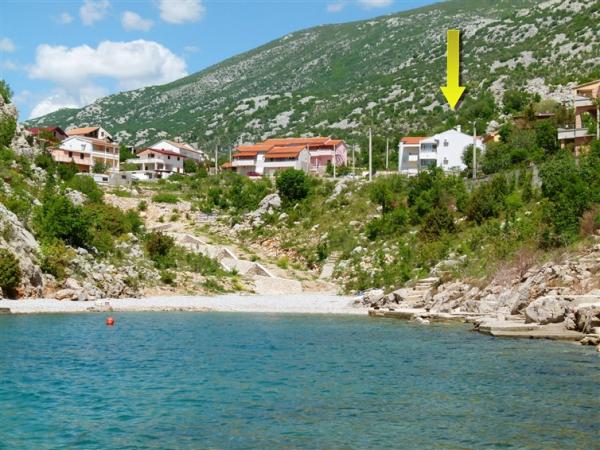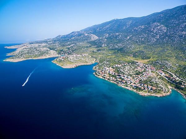 Ribarica 4 km van Karlobag: Modern flatgebouw. In het natuurpark Velebit. Zonnige plek op een helling, 90 m van de zee, 90 m van het strand. Voor medegebruik: zwembad rechthoekig (8 x 4 m, diepte 140 cm, met interne trap, buitendouche, terras, tuinmeubelen, barbecue, kinderspeelterrein, parkeerplaats op het perceel, winkel 350 m, kiezelstrand 90 m.