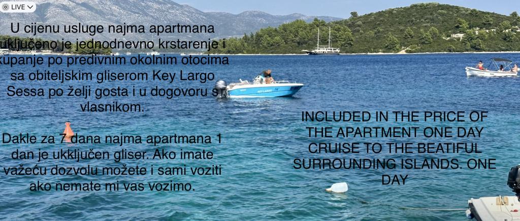 Het volgende is bij de prijs van de accommodatie inbegrepen: De prijs van de huurservice van het appartement omvat een eendaagse cruise en zwemmen op de prachtige omliggende eilanden met de speedboot van de familie Key Largo Sessa, op verzoek van de gast en in overleg met de eigenaar. . Dus voor 7 dagen huur van een appartement, is 1 dag inclusief een speedboot. Indien u over een geldig rijbewijs beschikt kunt u zelf rijden, indien u deze niet heeft rijden wij voor u Water Elektriciteit SUP board Gebruik van airconditioning Gebruik van fietsen Gebruik van kinderhoek met glijbaan en huisje Tafeltennis Wi-fi Gratis parkeren Beddengoed en handdoeken Schoonmaak appartement Toeristenbelasting 1 fles extra vergine olijfolie Moderne ligstoelen met parasol Geen extra kosten...