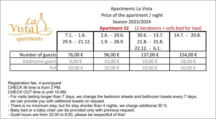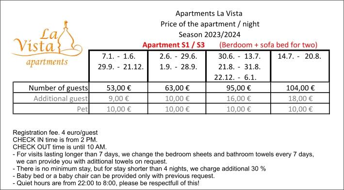 Lees meer Accommodatie eenhedenNeem voor alle vragen en reserveringen contact met ons op via e-mail. Gastregistratie - EUR 4,00 / per persoon. Milieutaks - 0,15 EUR persoon/dag, kinderen tot 12 jaar betalen geen milieutaks. Voor gasten die korter dan 4 nachten blijven, wordt de accommodatieprijs verhoogd met 30%. De eindschoonmaak van het appartement en de verblijfsbelasting (toeristenbelasting) zijn bij de prijs van de accommodatie inbegrepen.