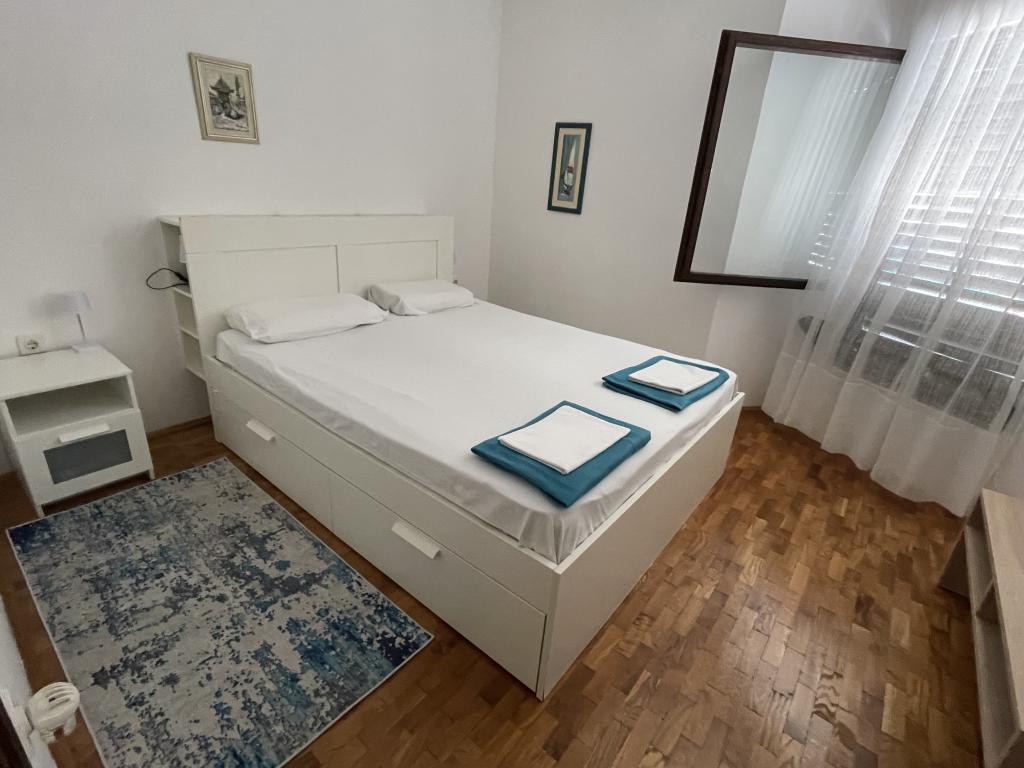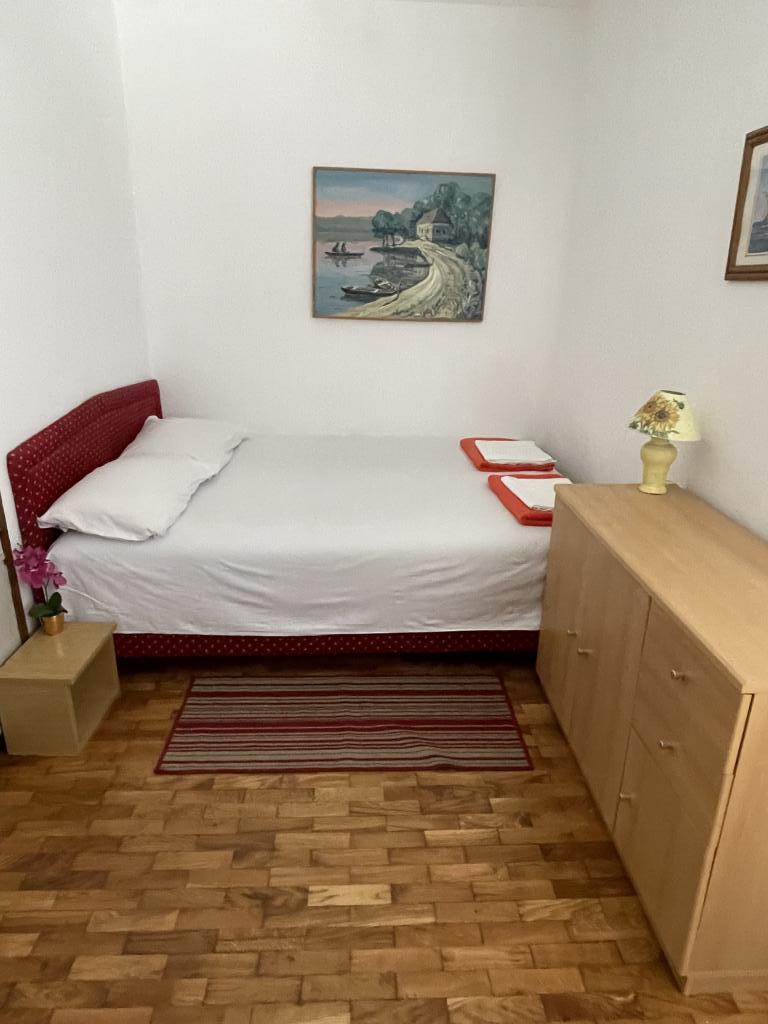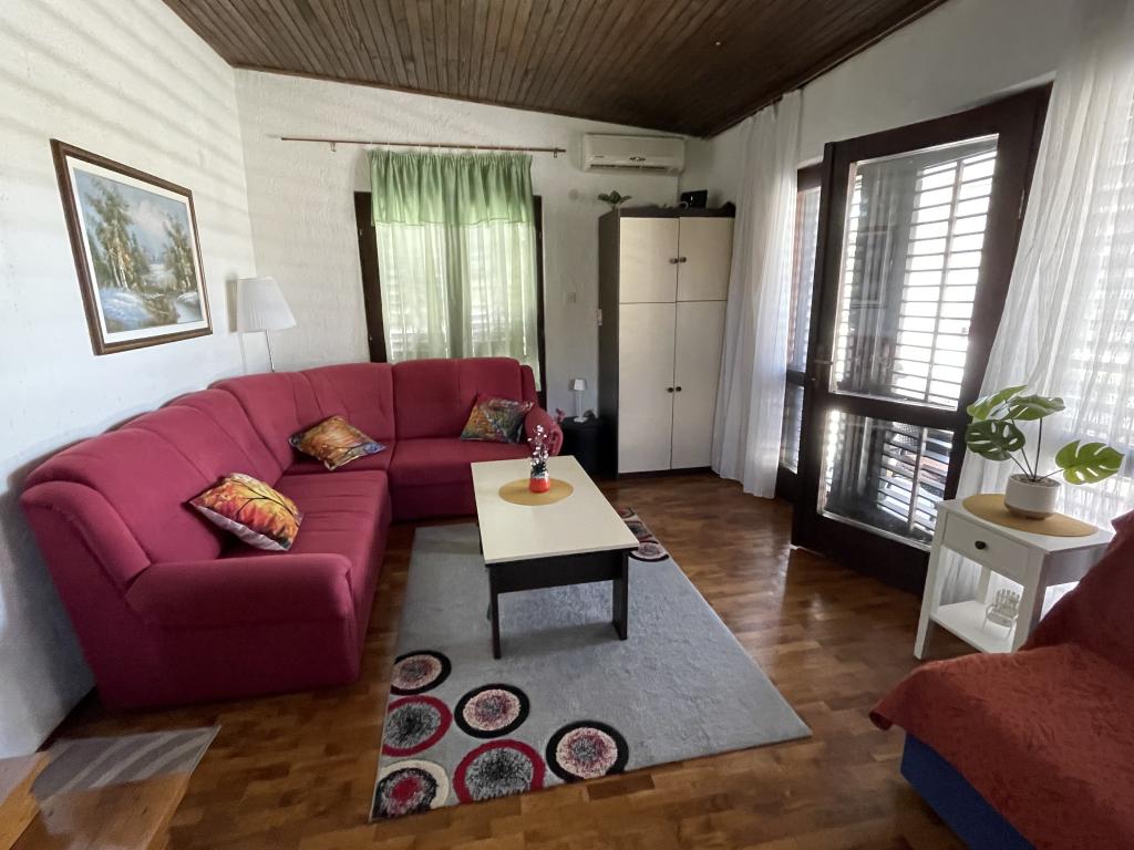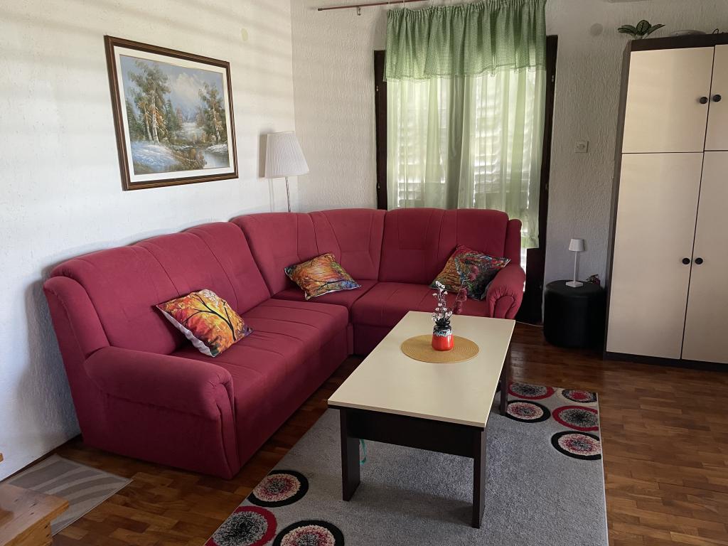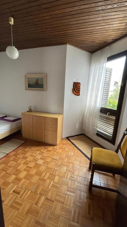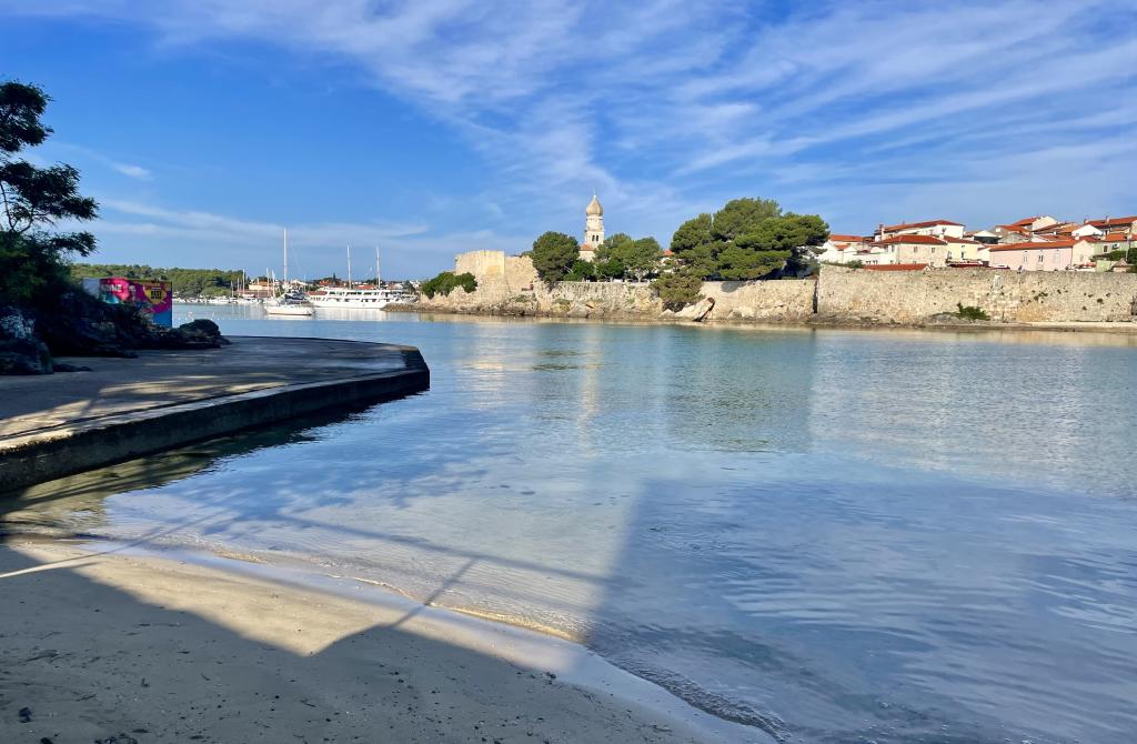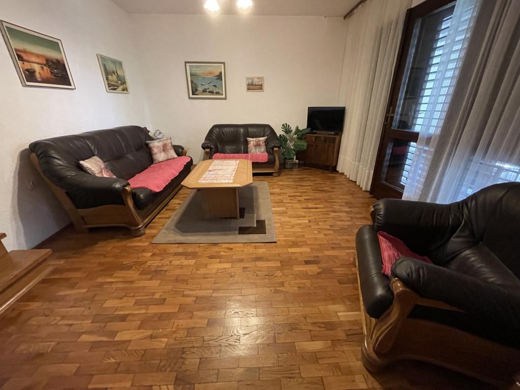 Eengezinswoning met 2 grote appartementen 80m2 omgeven door groen met vriendelijke gastheren. Rustig deel van Krk met gezinswoningen. De familie huurt al meer dan 30 jaar. Het bovenste appartement bevat een groot terras met een prachtig uitzicht, keuken en eetkamer, woonkamer, 2 slaapkamers en een badkamer. Het lager gelegen appartement bevat een terras in de schaduw, keuken en eetkamer, woonkamer, 2 slaapkamers en een badkamer. De faciliteit ligt op 10 minuten lopen naar de zee. Dicht bij winkels, restaurants en benzine ligt op 3 minuten lopen. Priveparkeren. .
