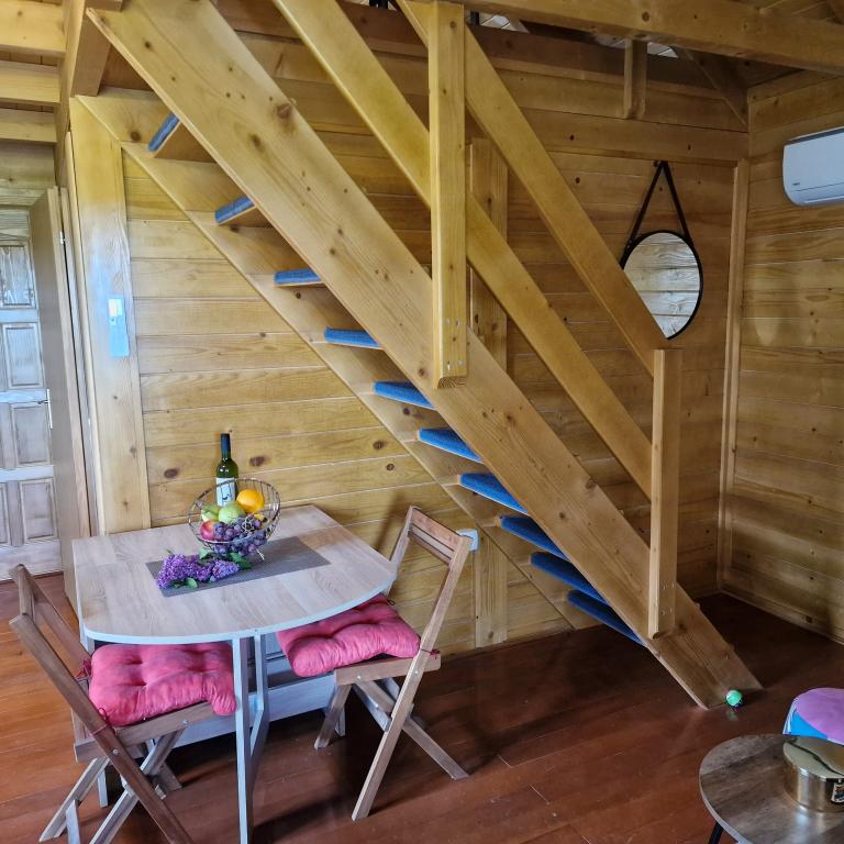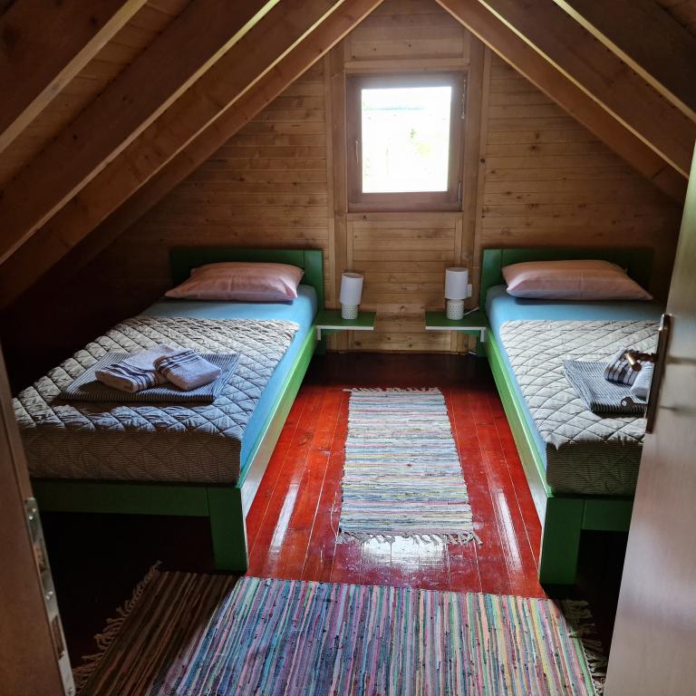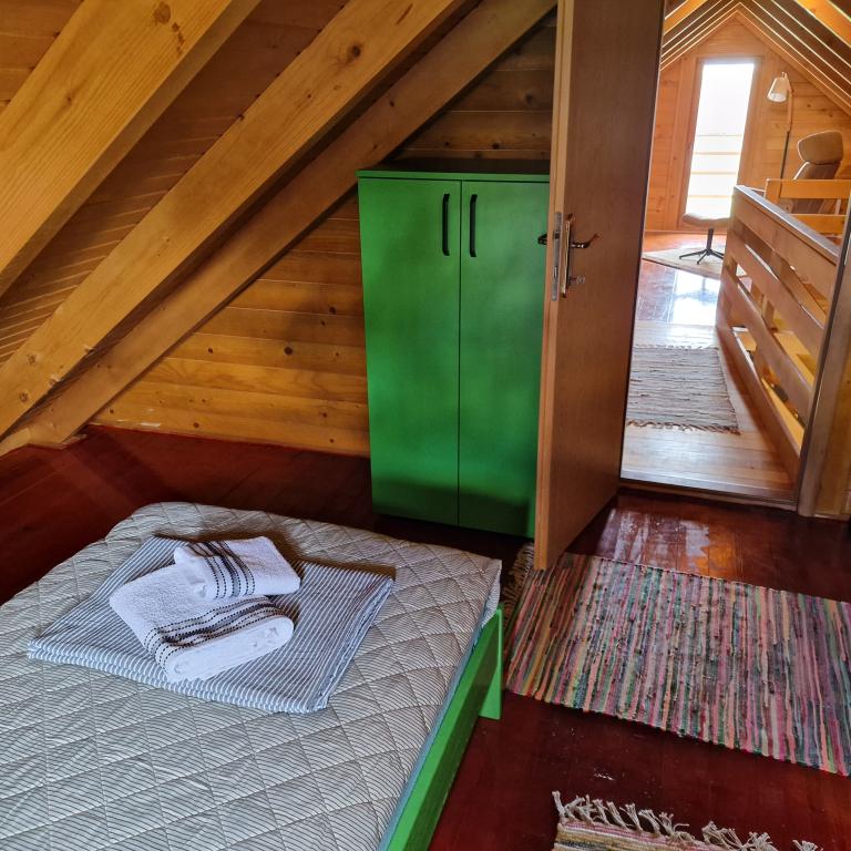Een houten huis voor vakanties in de natuur, gelegen in een klein, dunbevolkt Slavonisch dorp. Ideaal voor een ontsnapping aan de dagelijkse sleur en een echte rust met het gezang van vogels en het dagelijkse bezoek van een verliefd stel. Het huis bestaat uit een begane grond met een slaapkamer, keuken, woonkamer, badkamer en een groot overdekt terras. Op de eerste verdieping is er een open galerij met een ruimte om te lezen en te ontspannen met uitzicht op het meer en een slaapkamer met twee bedden. Het huis heeft ook een gemengde boomgaard met tientallen bomen met verschillende soorten fruit en bessen, die gasten kunnen gebruiken als er iets in de tuin staat (een mogelijke optie is om ze naar eigen behoefte te plukken, zelfgemaakte marmelade te maken van fruit uit de biologische landbouw en neem het mee als souvenir). Kilometers aan natuurpaden openen zich voor de gast, geschikt om te fietsen, wandelen, verkennen. De omliggende bezienswaardigheden zijn gemakkelijk bereikbaar en het huis is een ideaal startpunt om Slavonië te ontdekken.