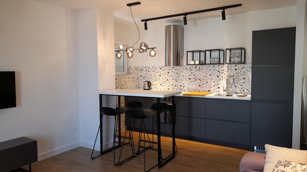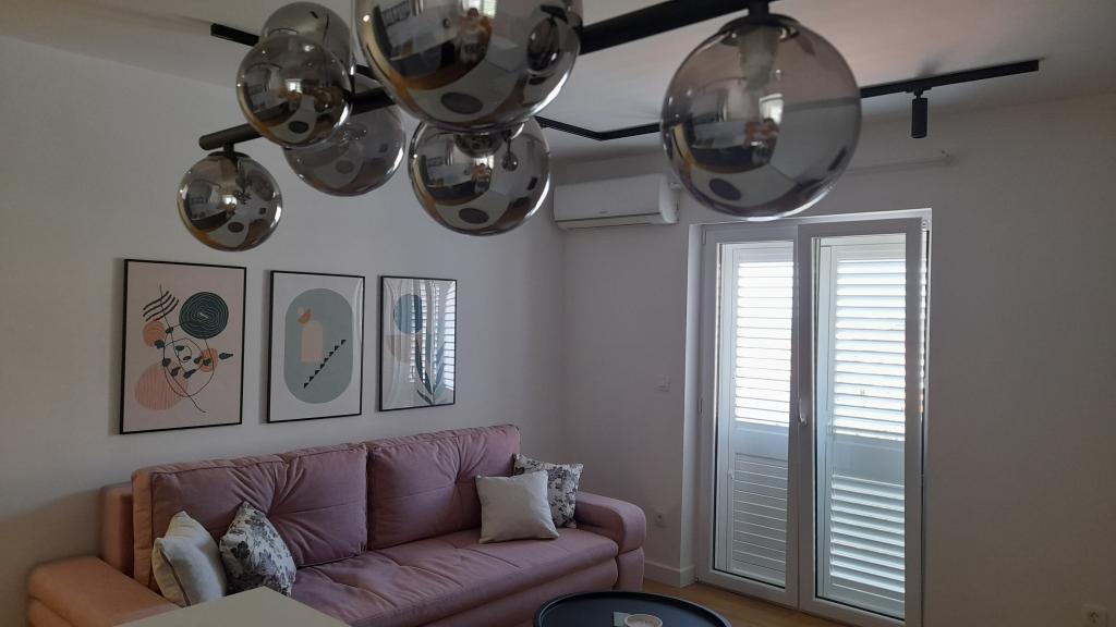 Modern appartement op de derde verdieping van een gebouw met een terras met uitzicht op de zee en de berg Biokovo. Het appartement bestaat uit een keuken, woonkamer met eethoek, slaapkamer en badkamer.
