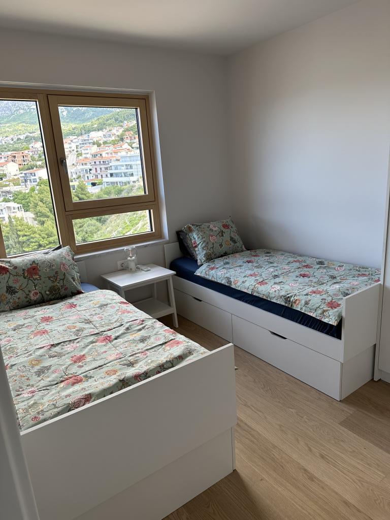 Onlangs gerenoveerd appartement in het centrum van Makarska. Het gebouw is gebouwd volgens de hoogste normen en luxueus ingericht, net als het appartement zelf! Er is een eigen parkeerplaats beschikbaar, buitenparkeerplaats nr. 6 voor auto's op LPG en twee parkeerplaatsen op verdieping -2; nr. 1 en 2. Het appartement bevindt zich op de 3e verdieping en is zuidwest georiënteerd. Het bestaat uit een keuken met eetkamer en een woonkamer in een open-space-model. De keuken is volledig uitgerust, zodat u zelfs tijdens uw jaarlijkse vakantie kunt genieten van het bereiden van uw favoriete maaltijden. Ruime badkamer met inloopdouche en wasmachine. Twee slaapkamers! De hoofdslaapkamer heeft een bed van 160/200, terwijl de andere slaapkamer twee bedden van 90/200 heeft. Het appartement is volledig uitgerust met beddengoed, handdoeken, theedoeken en papieren handdoeken. Vloeibare zeep en afwasmiddel voor de was, toiletpapier en afwasmiddel en tabletten voor de vaatwasser. Een prachtig uitzicht vanaf het overdekte terras strekt zich uit over de stad Makarska en de eilanden Brac en Hvar.