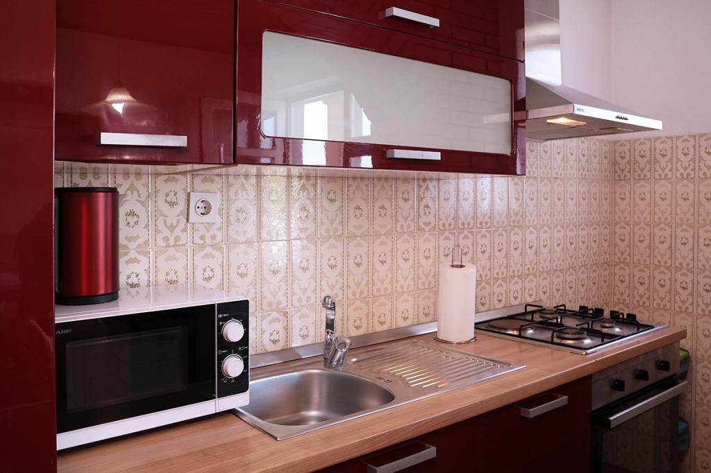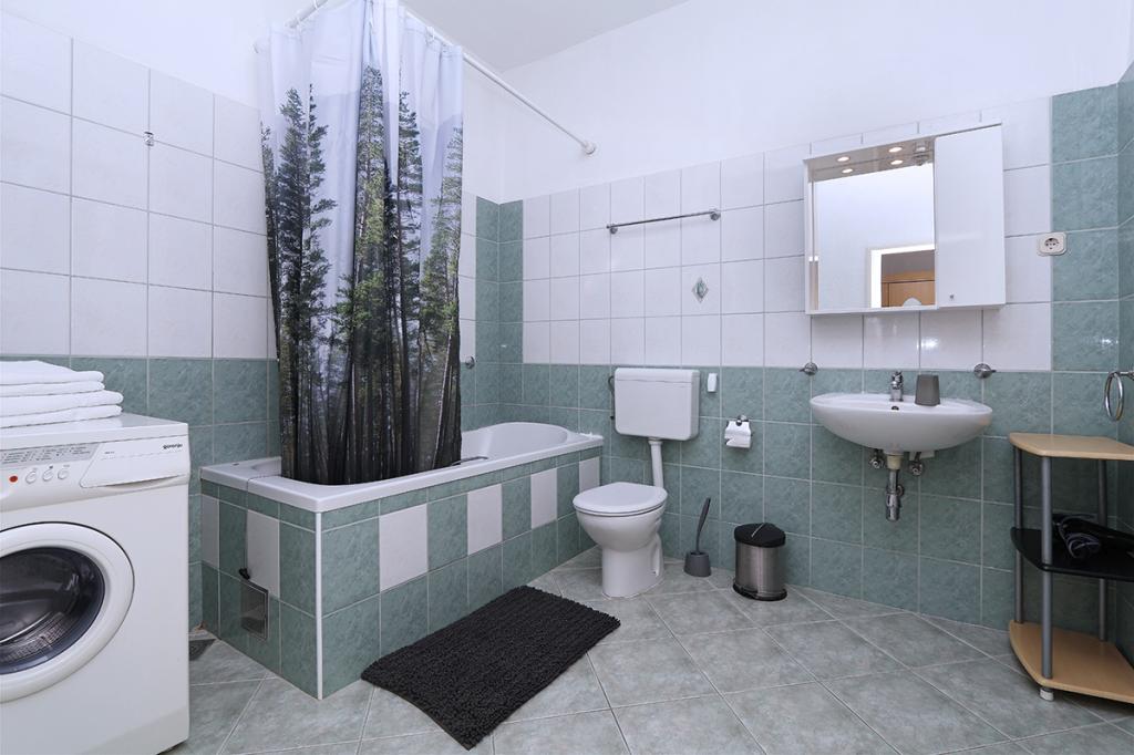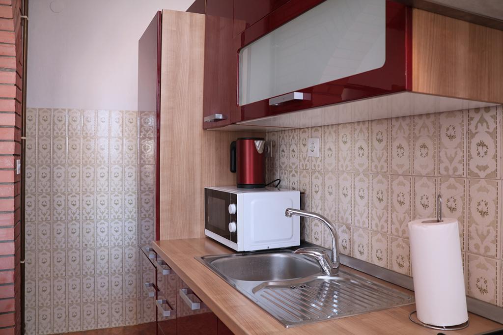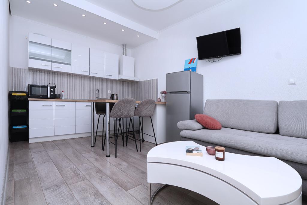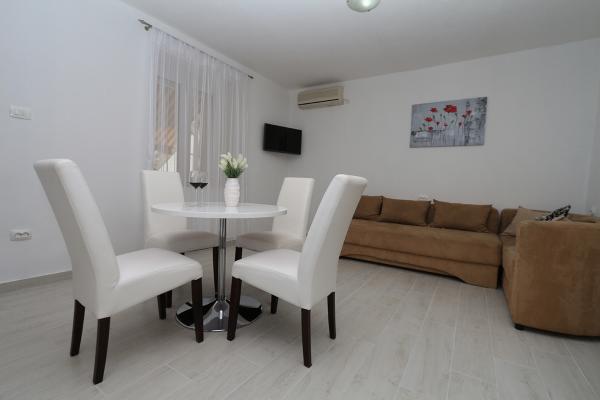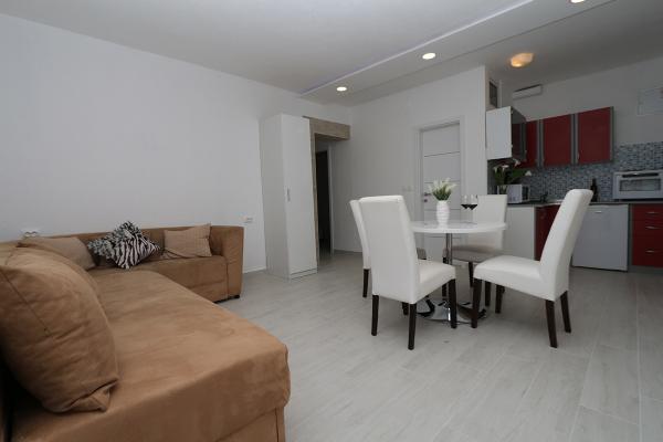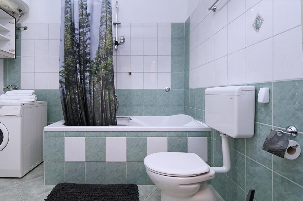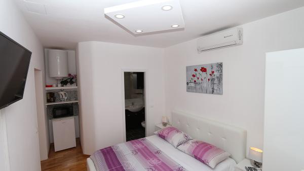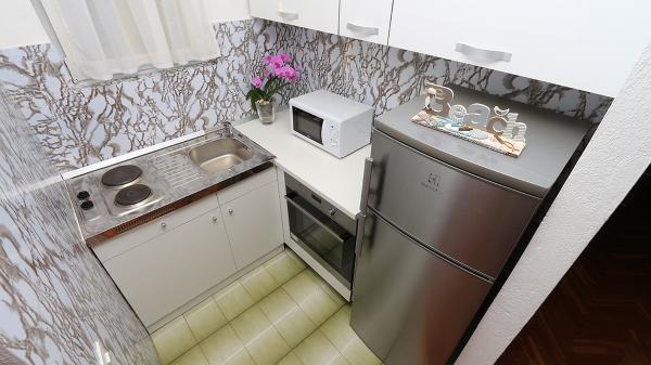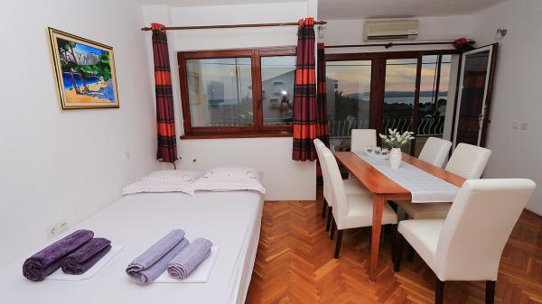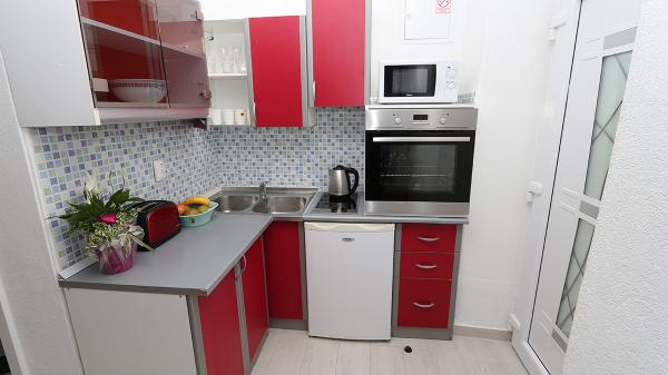 De accommodatie was zeer comfortabel voor ons gezin (2 volwassenen en een 16-jarige zoon), groot genoeg en goed uitgerust. De keuken is modern en bevat alles wat je nodig hebt (fornuis, magnetron, waterkoker, spoelbak en servies), het dient direct als woonkamer met een grote kamer en tegelijkertijd een slaapgedeelte voor onze volwassenen. De slaapkamer wordt als aparte ruimte ter beschikking gesteld - ergonomisch en compact: met een tweepersoonsbed en een kledingkast. De slaapkamer ligt aan de schaduwzijde van het appartement en biedt een koele ruimte. De badkamer is enorm en heeft een groot bad met douche. Er is daar een volledig functionele wasmachine en er is zelfs een föhn. Helaas hebben we maar één minpuntje opgemerkt: de airconditioning werkt niet naar behoren. Deze bevindt zich in de gang en dient het gehele appartement te koelen, alleen ventileren. Het appartement heeft een eigen terras dat prachtig is. In het wooncomplex op de bovenste verdieping is er een groot terras voor alle gasten, dat een geweldig uitzicht biedt op de zee, de oude stad en de stad als geheel. Gewoon erg handig om de zonsondergangen te bewonderen. Wij zijn voor de 5e keer op vakantie in Makarska en kunnen daarmee vergelijken met eerdere accommodaties: dat was een TOP appartement met zeer vriendelijke verhuurders en een mooie centrale ligging in hartje oude stad.