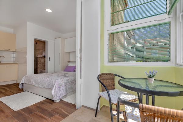 Op slechts een minuut lopen van het strand! Het eerste appartement is het "4+2 appartement" (ID: 58865), voor 4 personen met de mogelijkheid tot een extra bed voor twee personen. De totale oppervlakte bedraagt 85 m² en bestaat uit twee slaapkamers, een grote woonkamer met keuken, twee badkamers en een extra toilet. Het appartement heeft een eigen balkon met uitzicht op zee. Het tweede appartement is op dezelfde verdieping: Studio "Up!" (ID: 58866) voor twee personen met een eigen terras voor twee personen. Het derde "3+2 appartement" (ID: 63762) van 65 m² biedt accommodatie op de begane grond voor maximaal 5 personen, en de vierde Studio "Olive Tree" (ID: 65589) voor twee personen bevindt zich eveneens op de begane grond van het huis.
