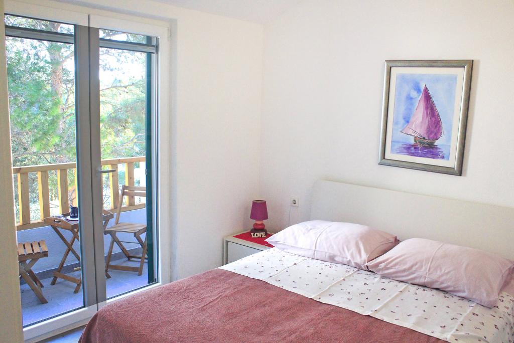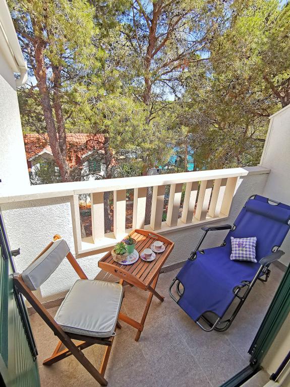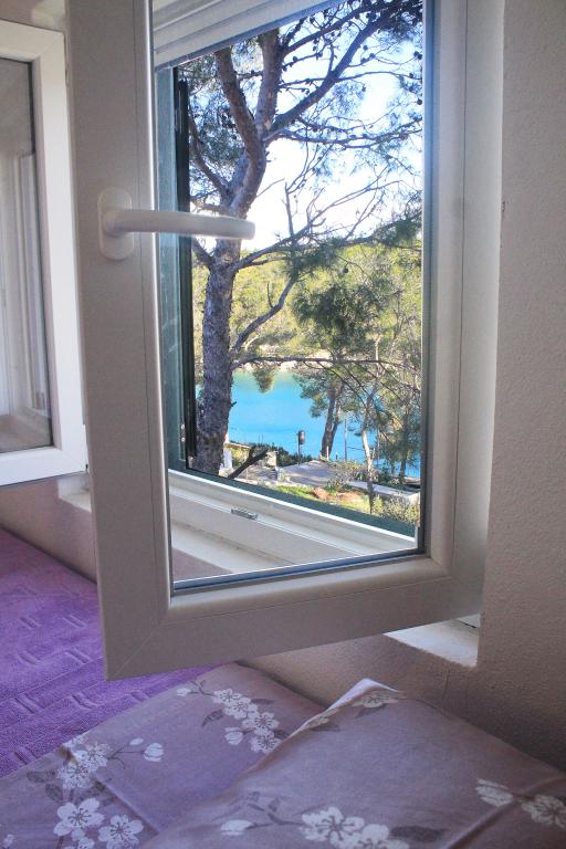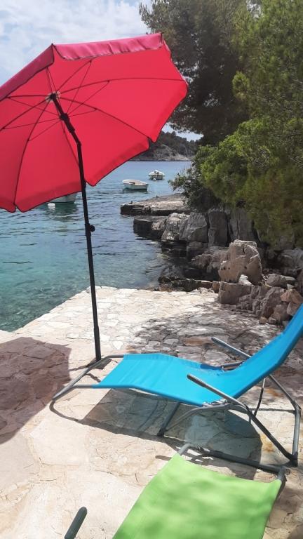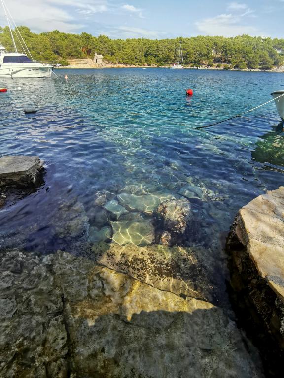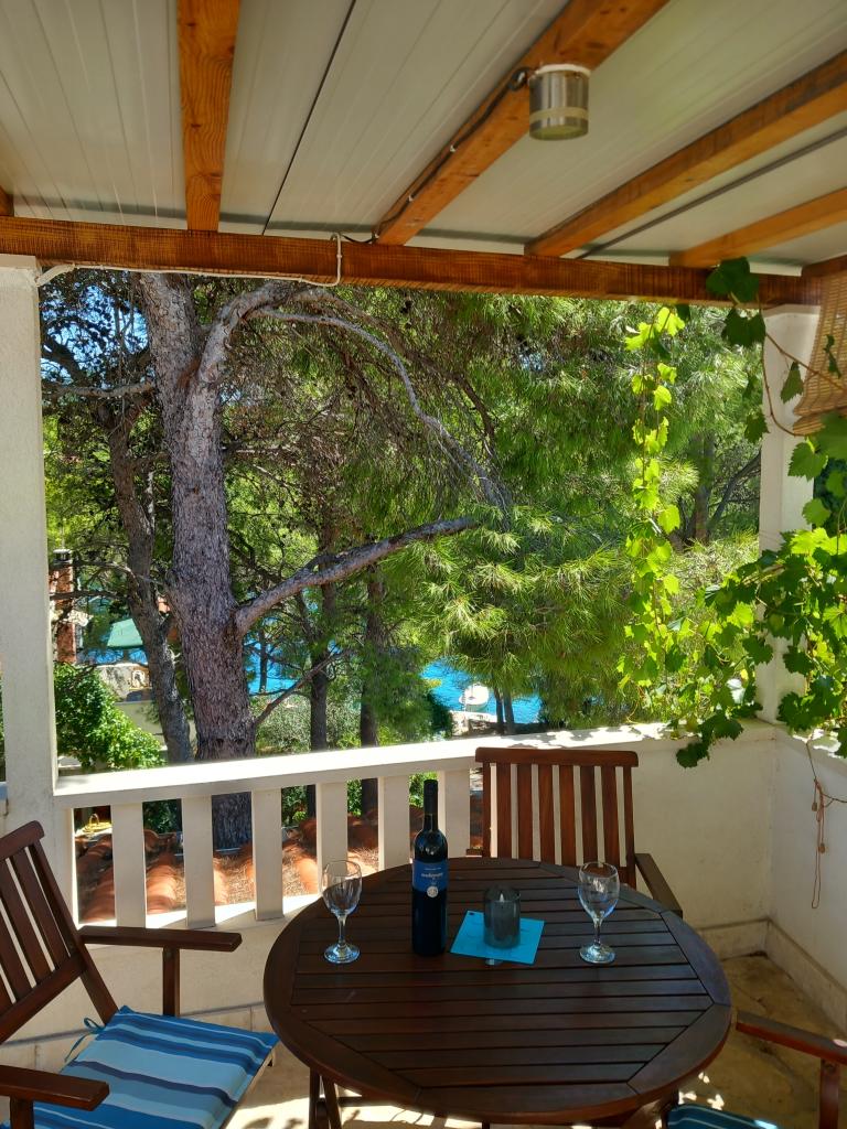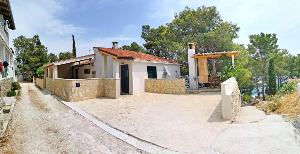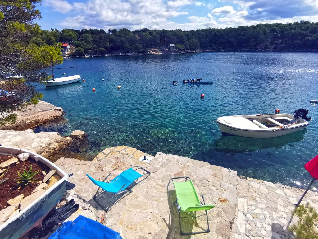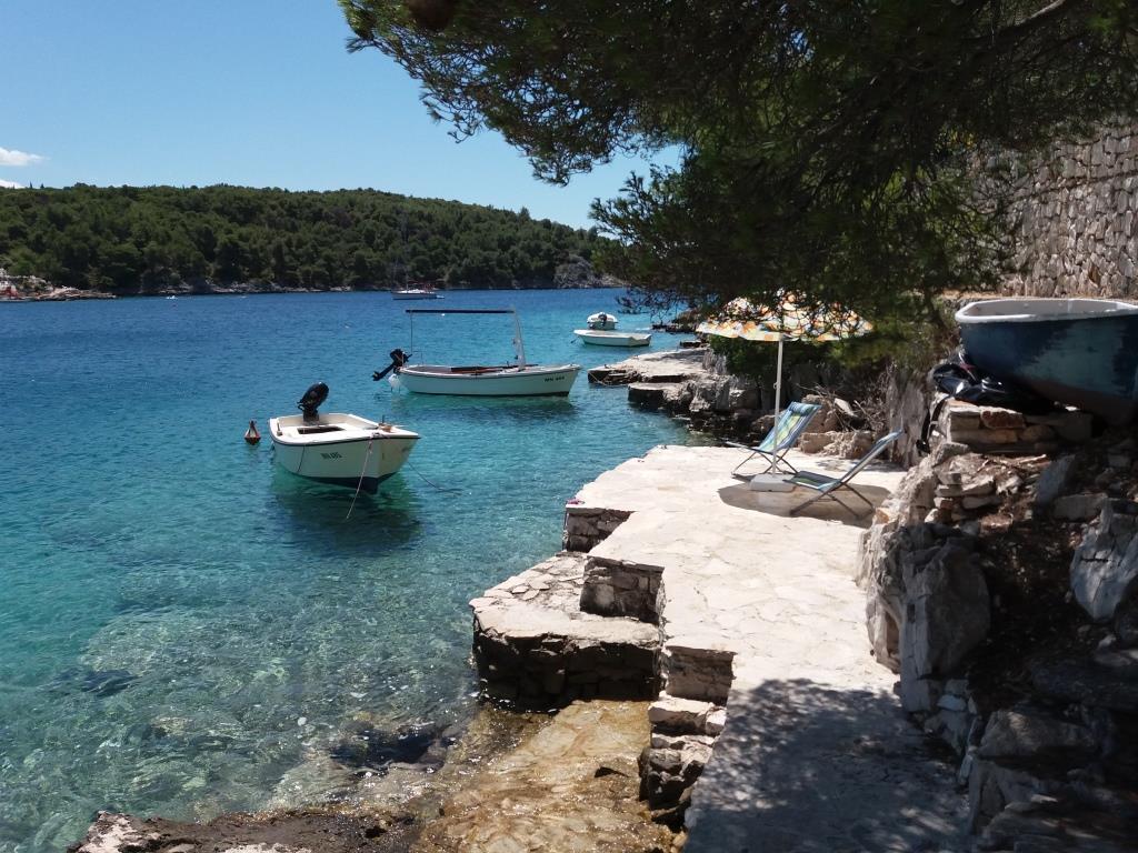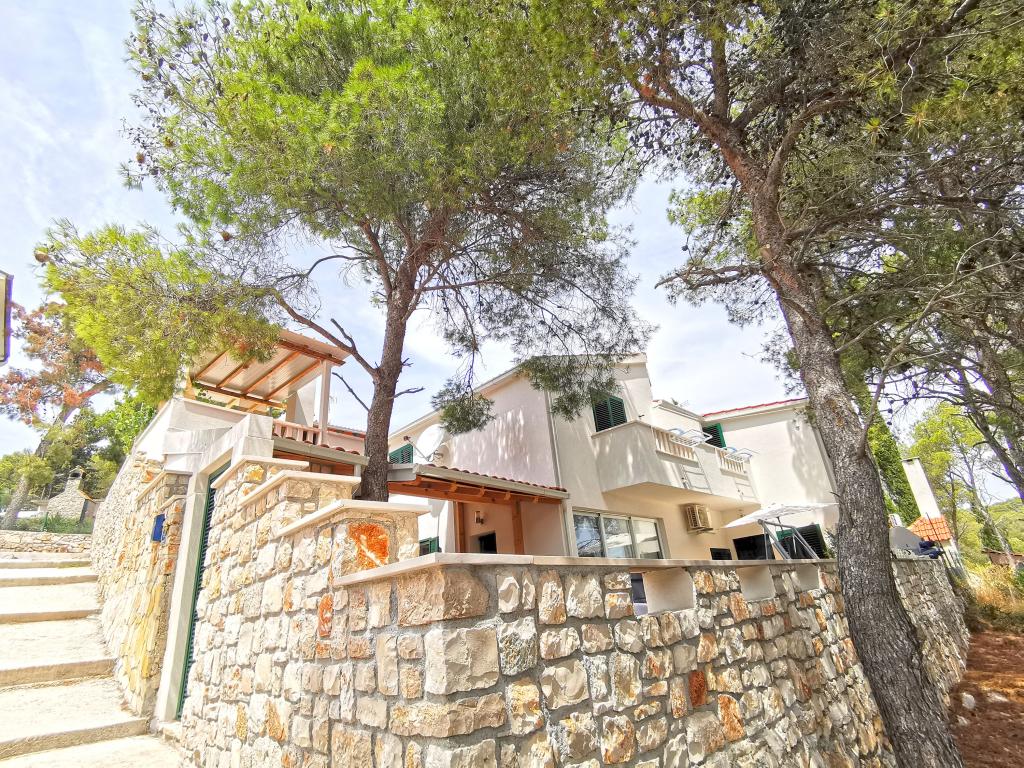 Twee appartementen modern uitgerust en voorzien van airconditioning, gelegen in een prachtige grenen bossen, baaien smiještenena in het zuidwesten van het eiland, op 30 m van de zee, die ook en het strand. De appartementen bestaan uit een keuken, woonkamer, slaapkamer en badkamer. Elk appartement heeft een eigen terras en een parkeerplaats. De dichtstbijzijnde stad van Milna, gelegen op 1500 meter afstand, dat wil zeggen, 15 min lopen.
