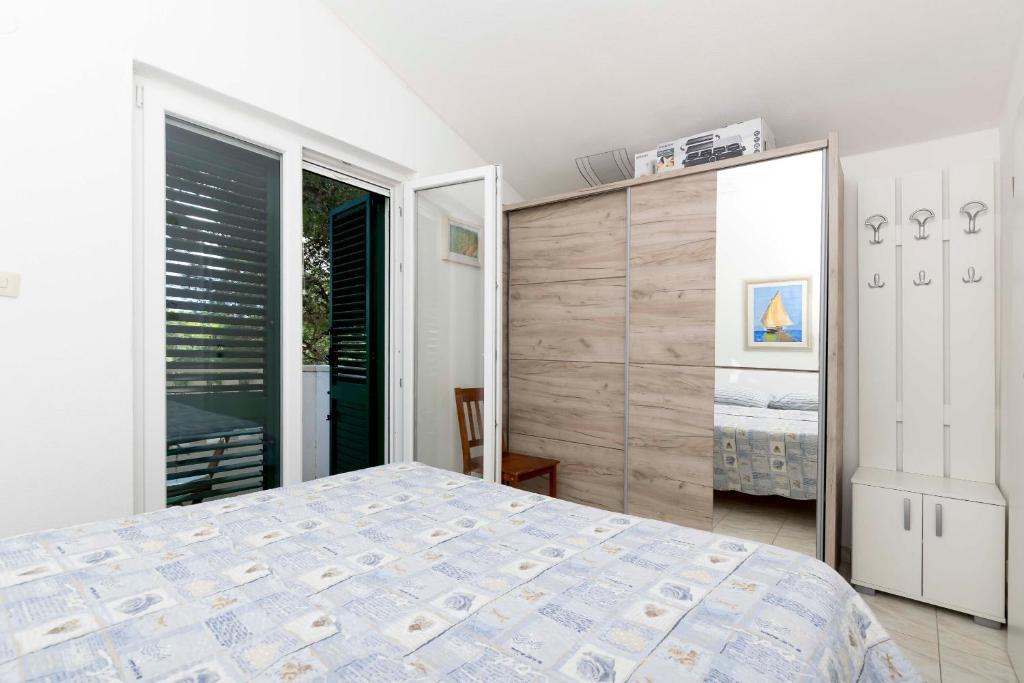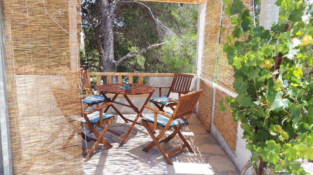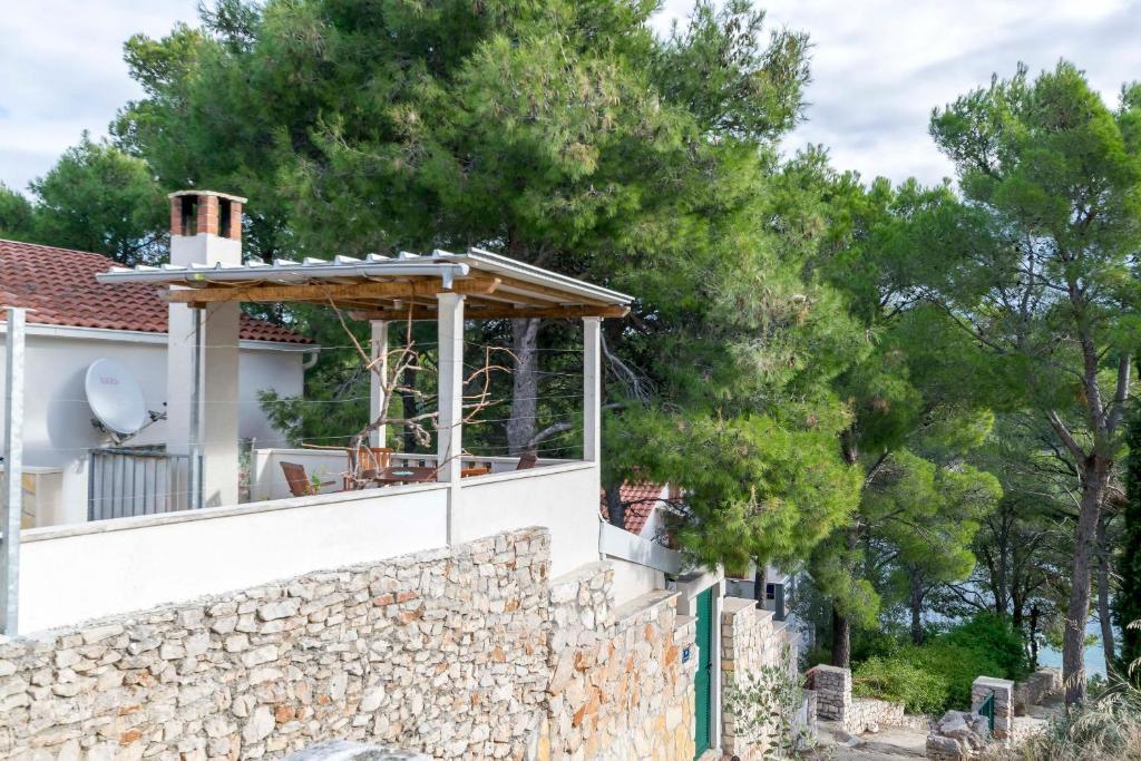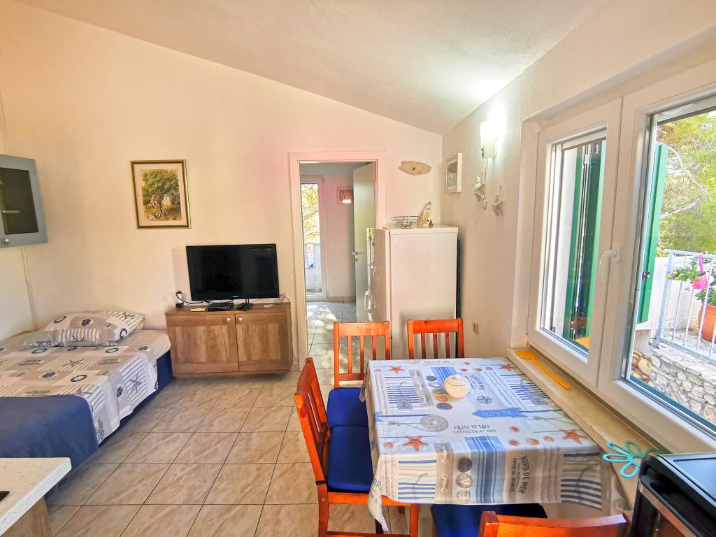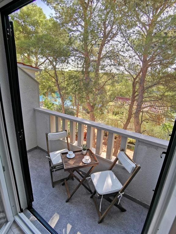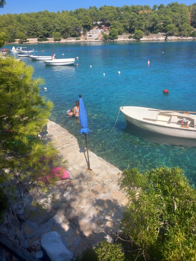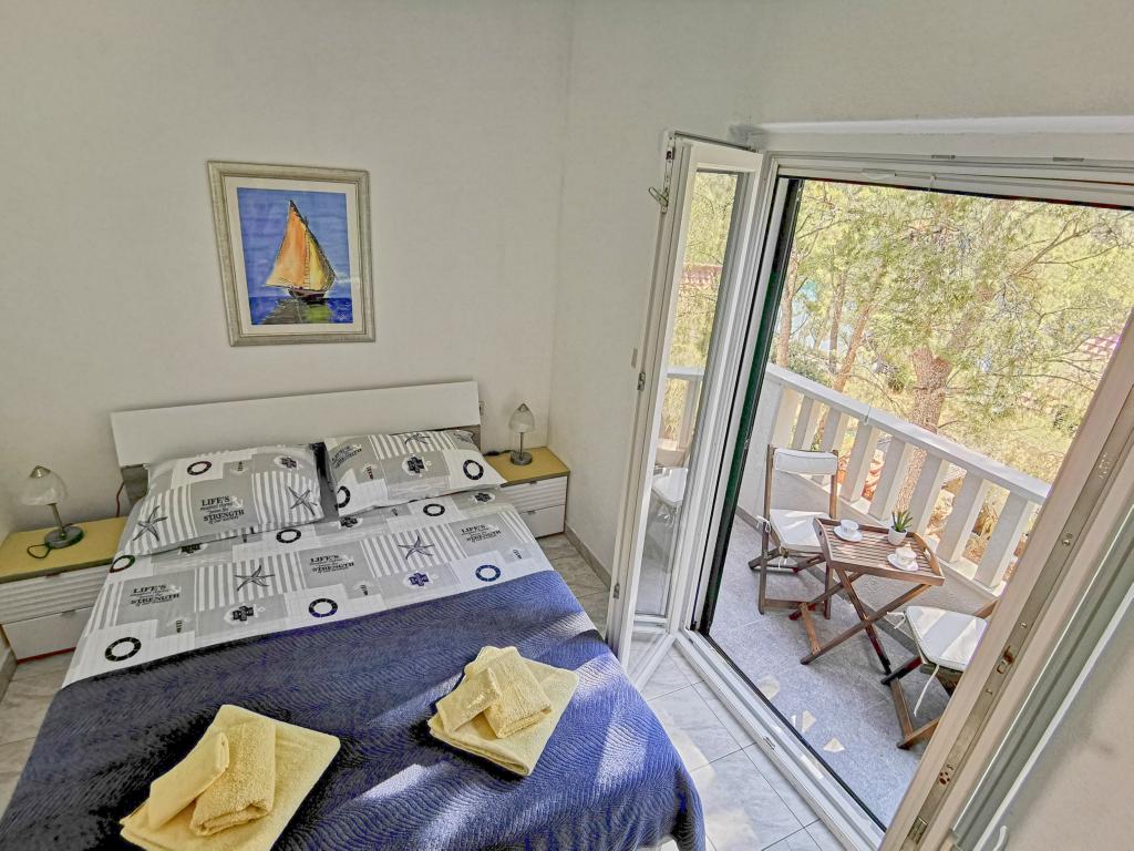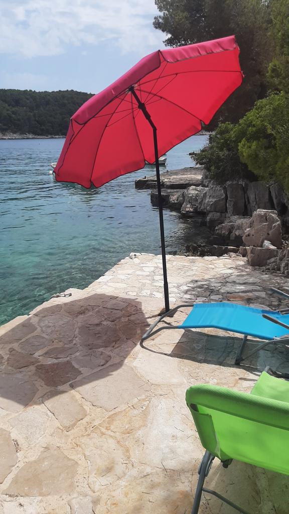 Twee appartementen modern uitgerust en voorzien van airconditioning, gelegen in een prachtige grenen bossen, baaien smiještenena in het zuidwesten van het eiland, op 30 m van de zee, die ook en het strand. De appartementen bestaan uit een keuken, woonkamer, slaapkamer en badkamer. Elk appartement heeft een eigen terras en een parkeerplaats. De dichtstbijzijnde stad van Milna, gelegen op 1500 meter afstand, dat wil zeggen, 15 min lopen.