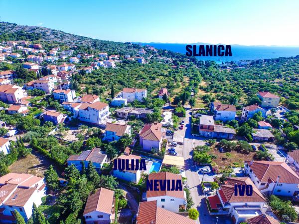 Niet ver van het zandstrand Slanica, dat bereikbaar is via een voetgangersgebied, bieden wij accommodatie in twee appartementen en een huis met zwembad. Ideaal voor gezinnen met kinderen. In huis NEVIJA zijn twee appartementen met twee slaapkamers beschikbaar voor elk vier personen. De appartementen bevinden zich op de eerste verdieping. Elk appartement heeft een eigen balkon. Parkeergelegenheid, airconditioning, tv en wifi zijn aanwezig. Het huis met zwembad JULIJA is een prachtig en modern ingericht vakantiehuis bestaande uit twee verdiepingen, elk met een volledig uitgeruste wooneenheid. Aan de voorzijde van het huis bevindt zich de ruimte waar u de meeste tijd zult doorbrengen: bij het zwembad, de barbecue, het terras en bij het gezellige samenzijn. Let op: het gebruik van het zwembad is uitsluitend voorbehouden aan gasten van huis JULIJA.