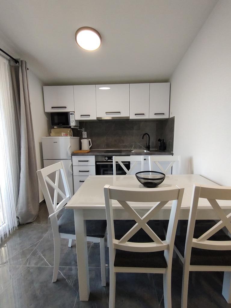 De studio, het A2+2 appartement en het A4+2 appartement bevinden zich in een nieuw gebouw. Ze zijn volledig uitgerust. Ze liggen in een rustige buurt van het dorp, wat garant staat voor een kwaliteitsvolle vakantie. De terrassen van alle appartementen bieden uitzicht op zee. De ramen en balkondeuren zijn voorzien van ingebouwde horren. Op de binnenplaats van het gebouw bevindt zich een grote tuin met schommels voor kinderen. In de buurt zijn stranden voor elke smaak: zandstrand, rotsstrand, strand bij het dennenbos, kiezelstrand en betonnen strand met douches, kleedkamers, parasols, een beachvolleybalveld, een speeltuin, fitnessapparatuur en waterfietsen.