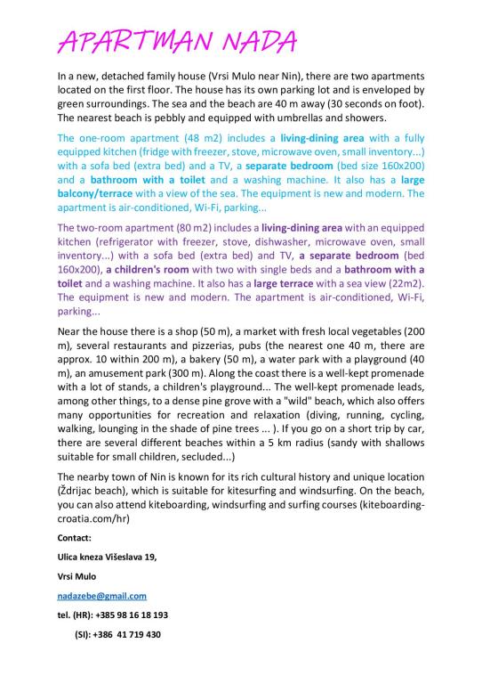 Wij kunnen Appartement Nada van harte aanbevelen. Mooi nieuw, schoon, goed uitgerust appartement, dicht bij de zee, prachtige tuin. Schoon strand en zee. Er zijn winkels, een bakker en restaurants in de buurt. Zeer aardige, vriendelijke, behulpzame eigenaren. Goede locatie voor uitstapjes naar de omgeving van Nin, Vir, Zadar, omliggende stranden. Op korte afstand van het appartement ligt een dennenbos, geschikt voor een wandeling. Bedankt voor een mooi lang weekend.