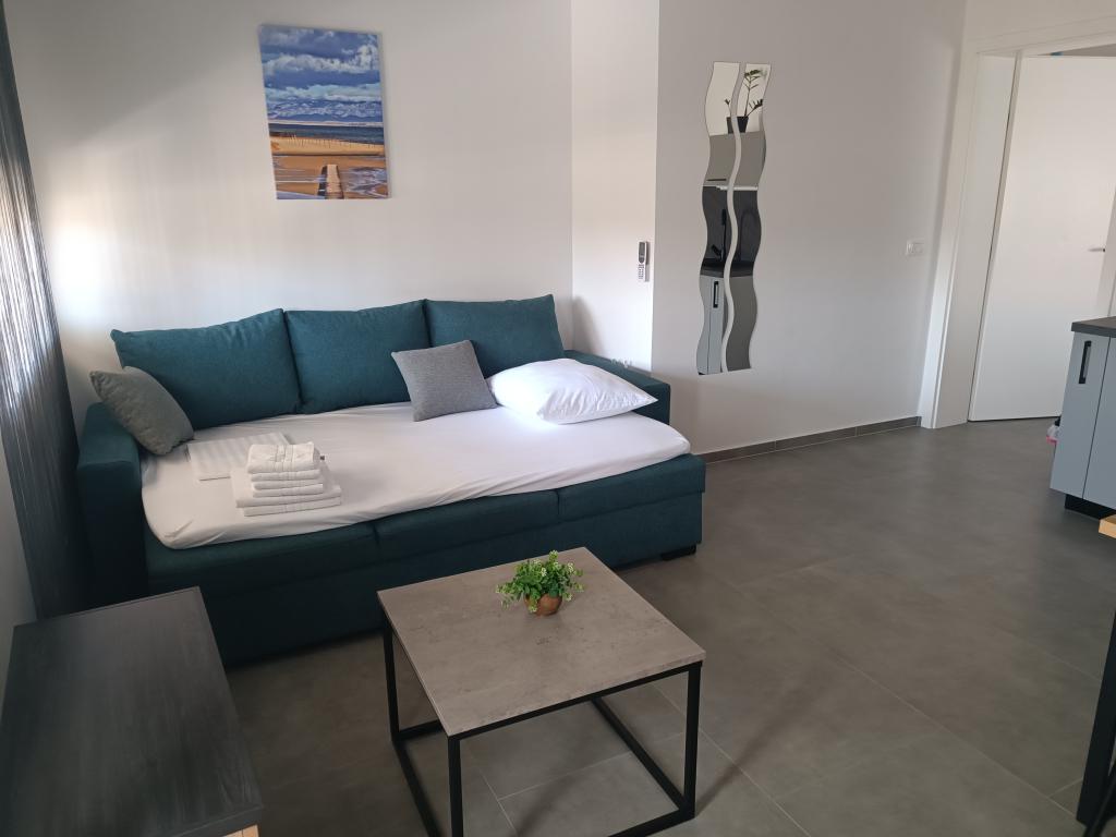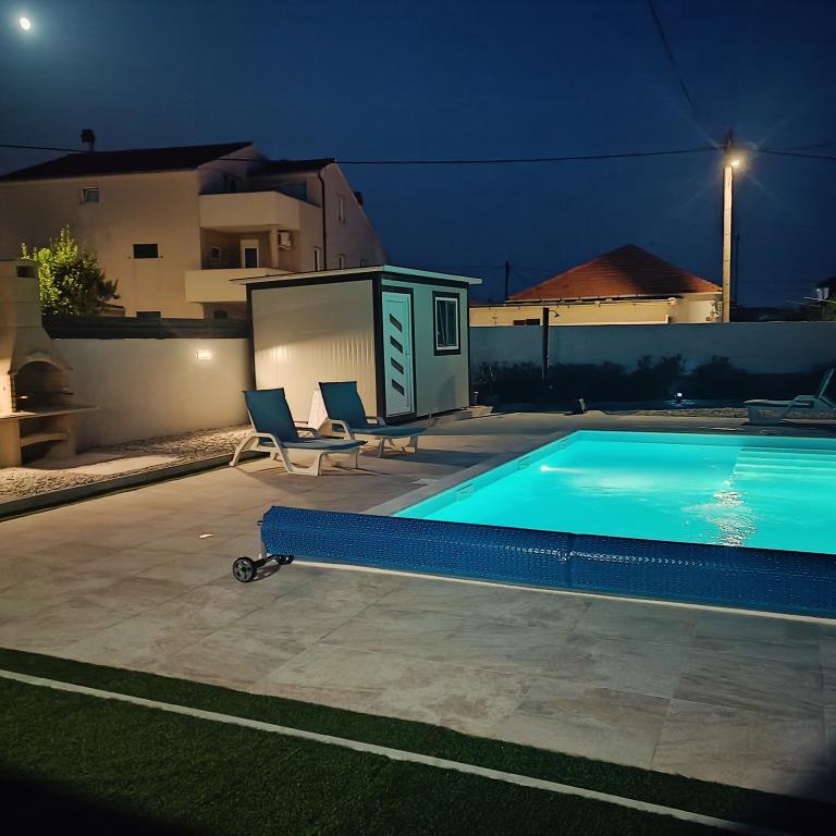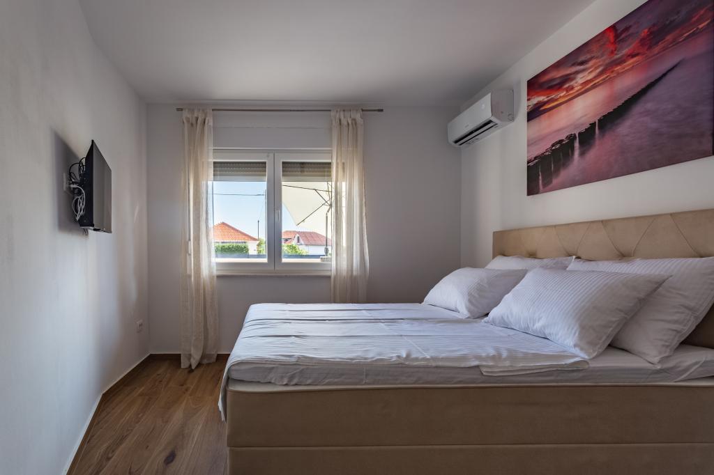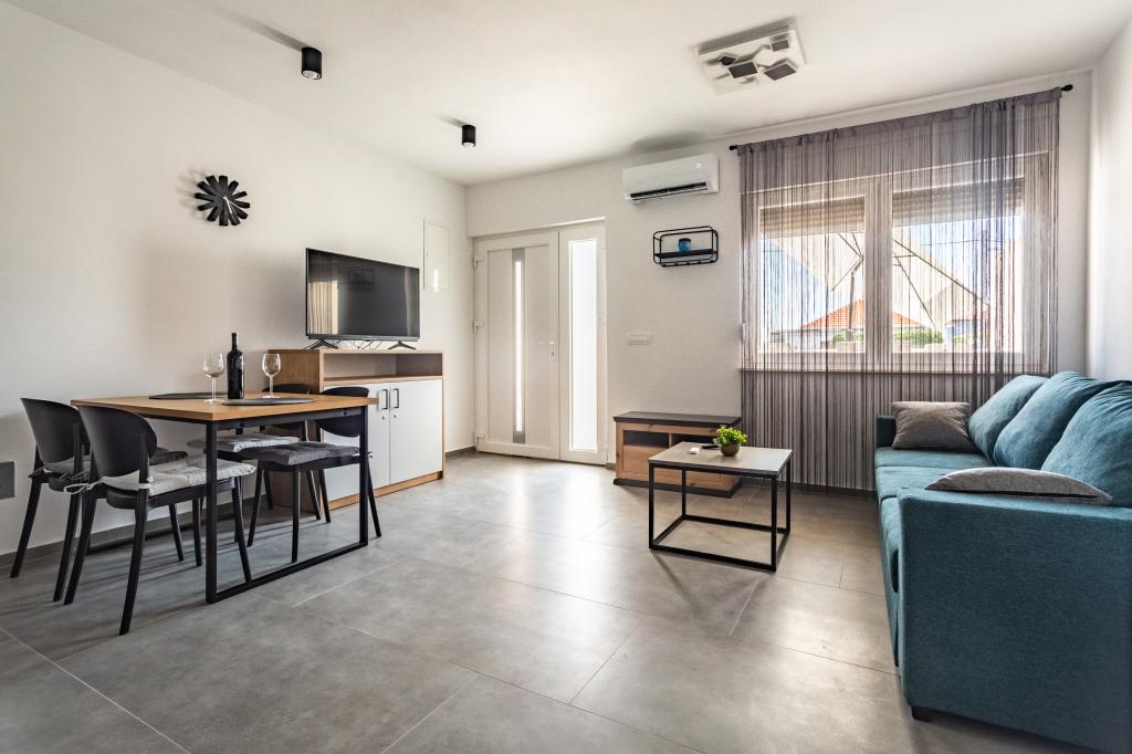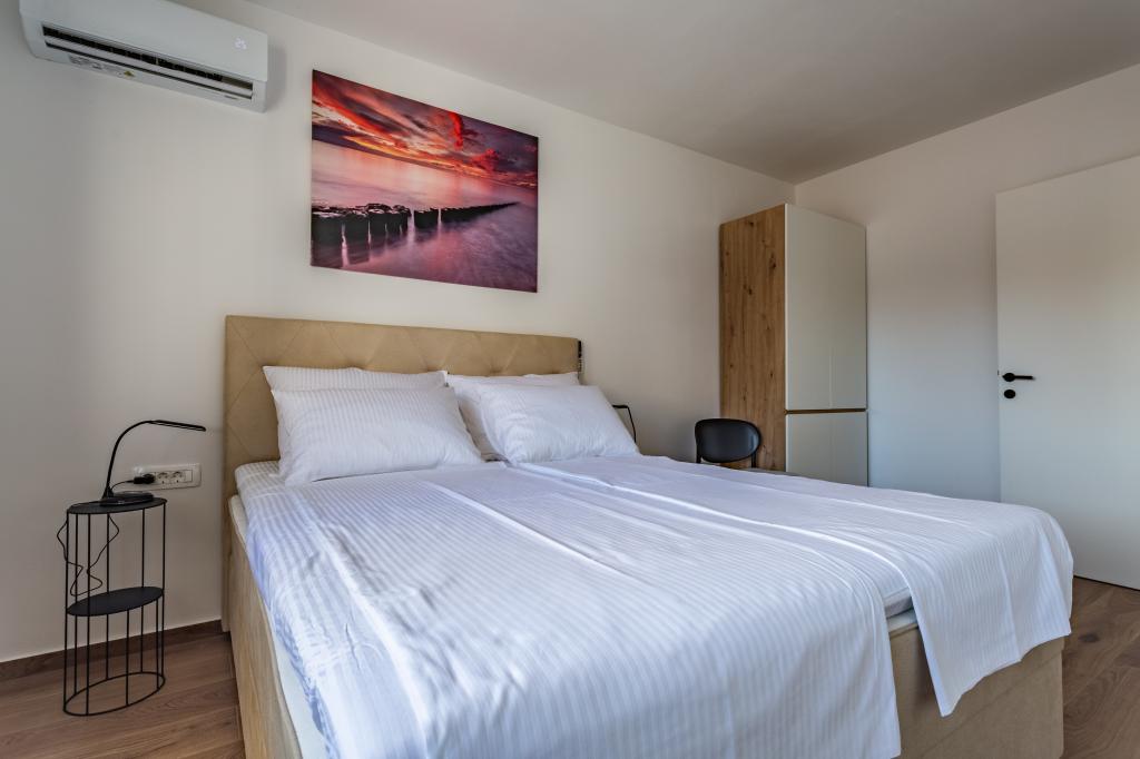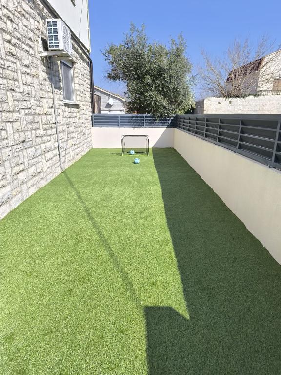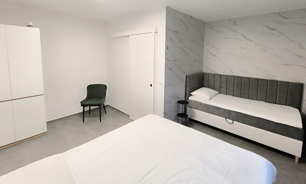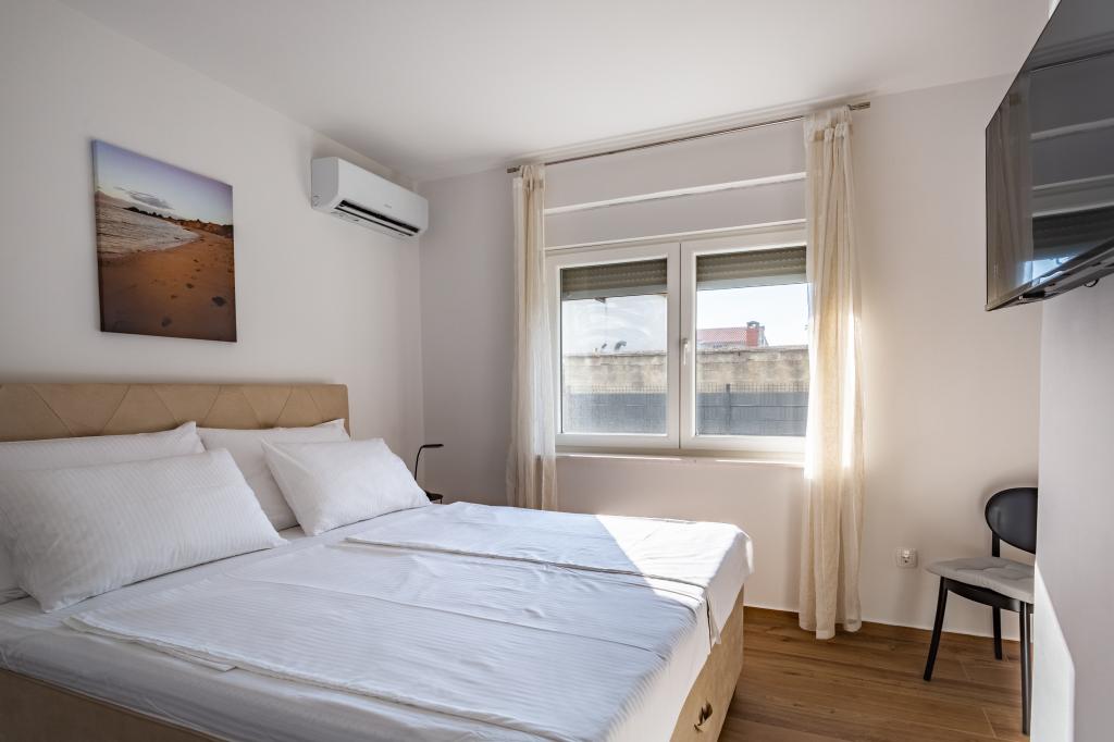Verwarmd zwembad (gesloten van 15.10.2025 tot 1.5.2026) Welkom bij Royal Place Apartments, appartementen gelegen in het charmante koninklijke stadje Nin, op slechts 16 km van de historische stad Zadar. We bieden twee luxe appartementen aan. Een appartement met één slaapkamer (familiekamer, tweepersoonsbed + eenpersoonsbed) en een appartement met twee slaapkamers op de begane grond, op een rustige locatie, op slechts 200 meter van de pittoreske boulevard, lokale restaurants en het stadscentrum. Het strand ligt op 700 meter afstand. De grote verdieping van het gebouw omvat een rustige, omheinde binnenplaats vol weelderige mediterrane planten. Daarnaast is er een verwarmd zoutwaterzwembad, een zonneterras met ligstoelen en parasols, een buitendouche en een barbecue. De bovenverdieping van het gebouw is niet toegankelijk.