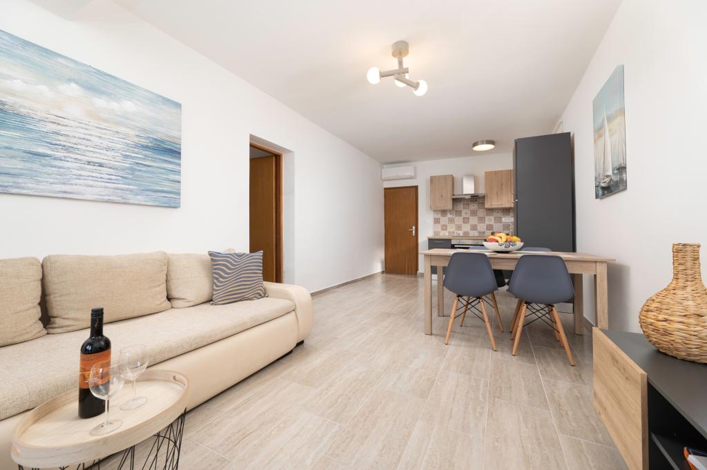 Het appartement ligt op 200 meter van de zee. In 2025 is het volledig gerenoveerd en voorzien van nieuw meubilair. Het appartement heeft twee eigen ingangen, twee slaapkamers, twee badkamers, een woonkamer met open keuken en eethoek, en een overdekt en een onoverdekt terras. Er is een extra bed beschikbaar voor kinderen tot 18 jaar. De totale oppervlakte bedraagt 64 m². Er is parkeergelegenheid voor drie auto's in het gebouw, die gratis is. Huisdieren zijn toegestaan na voorafgaande afspraak en onder constant toezicht van de eigenaar. Er kunnen extra kosten aan verbonden zijn.