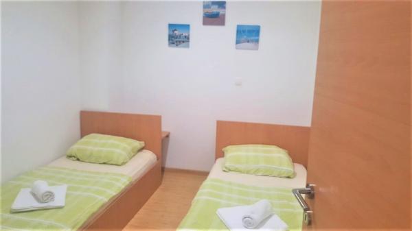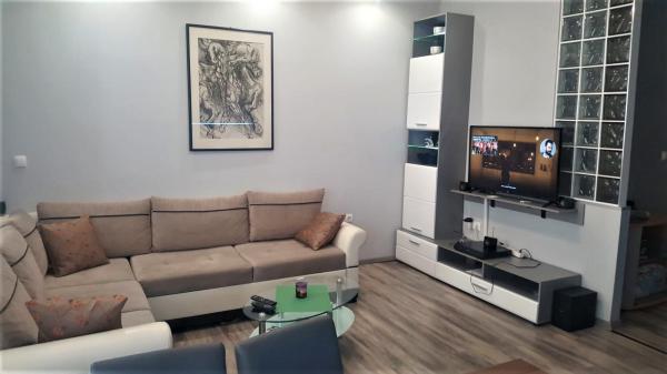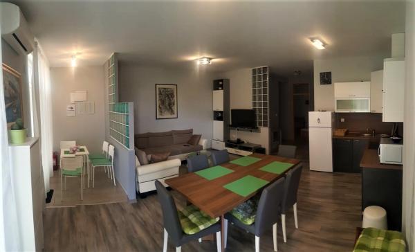 Inlusief wel Toeristenbelasting.Een welkomstdrankje is bij de prijs inbegrepen. Het appartement is voorzien van airconditioning en uitgerust met een SMART TV en home cinema in de woonkamer, verbonden met WIFI, en een moderne keuken. De aaneengesloten ruimte van 35 m², zonder tussenwanden, bestaande uit een woonkamer, keuken met eethoek, loggia en hal, biedt comfort aan maximaal 6 personen tegelijk. De slaapkamer is uitgerust met een groot bed en een kledingkast, en de kinderkamer met twee aparte bedden en een tv. De set in de woonkamer biedt, nadat deze is uitgetrokken, slaapplaats aan twee personen. De badkamer is voorzien van een wasmachine, een boiler en een moderne doorstroomboiler, waardoor het mogelijk is om meerdere personen achter elkaar te douchen. Naast dit alles is er ook een berging van 4 m² voor het opbergen van overtollige spullen.