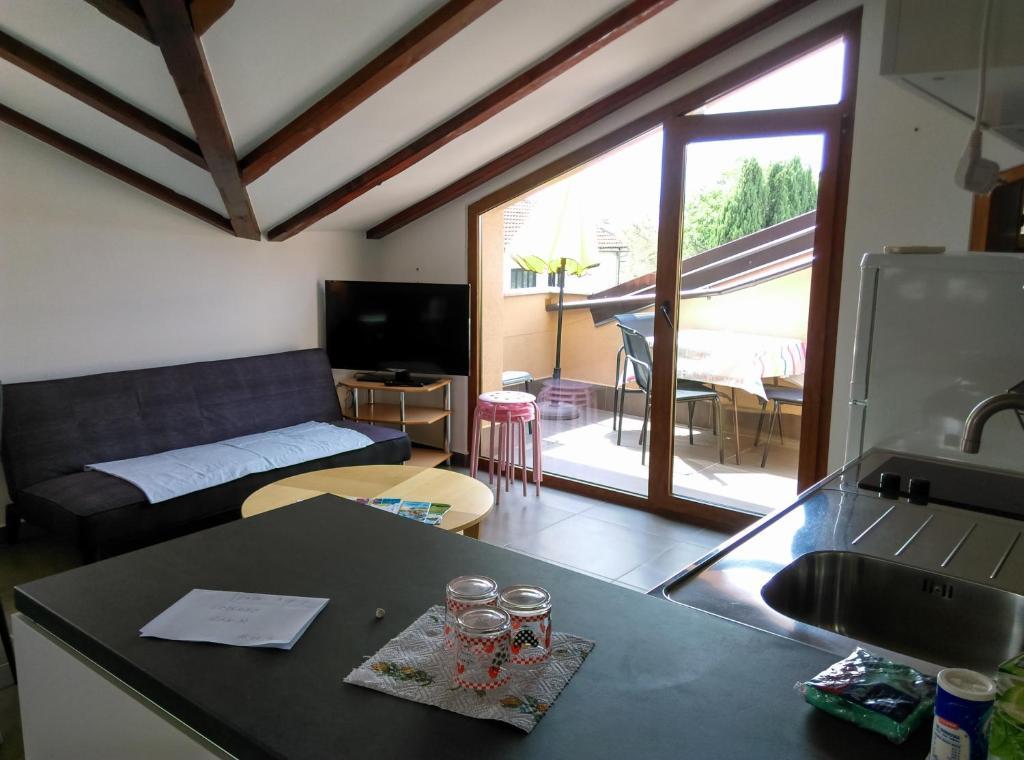 Appartement met twee slaapkamers, de eerste met een tweepersoonsbed 160X200 en een terras, de tweede met twee bedden 90x200, en een extra bed in de woonkamer. Woonkamer en keuken met nog een terras met uitzicht op de tuin. Badkamer, wifi, gratis parkeren. Het bevindt zich op de eerste verdieping in een gebouw met andere appartementen. 200 meter van het strand, 5 minuten lopen. Het is gelegen op een rustige plek, Tourist Village DAJLA, een buitenwijk van Novigrad in Istrië, 3,5-4 km van het centrum. Er is een winkel op 100 meter afstand, een bakker en een restaurant op 80 meter afstand. Het is ideaal voor een rustige vakantie voor een gezin met kinderen of volwassenen. Huisdieren, roken, besloten feestjes en het maken van lawaai zijn niet toegestaan. Op aanvraag is het mogelijk om nog een extra bed toe te voegen, alleen bij een verblijf van meer dan 4 nachten, tegen een toeslag.