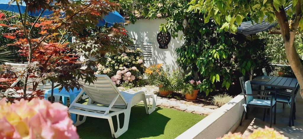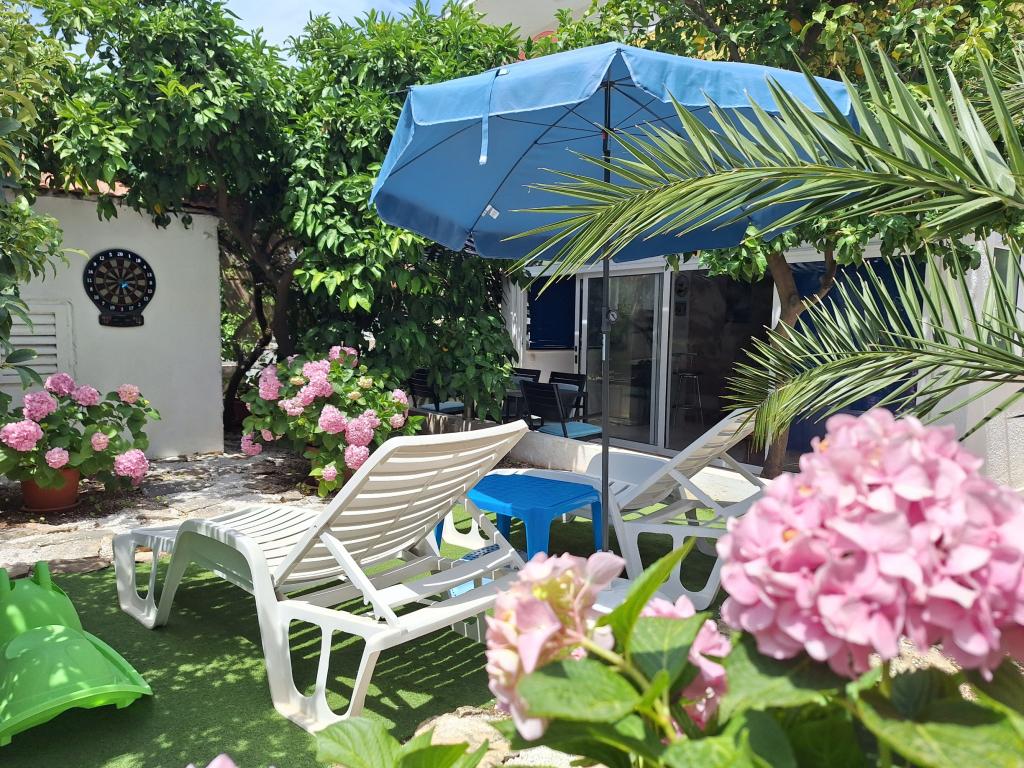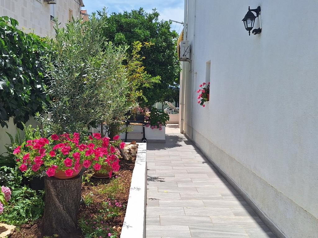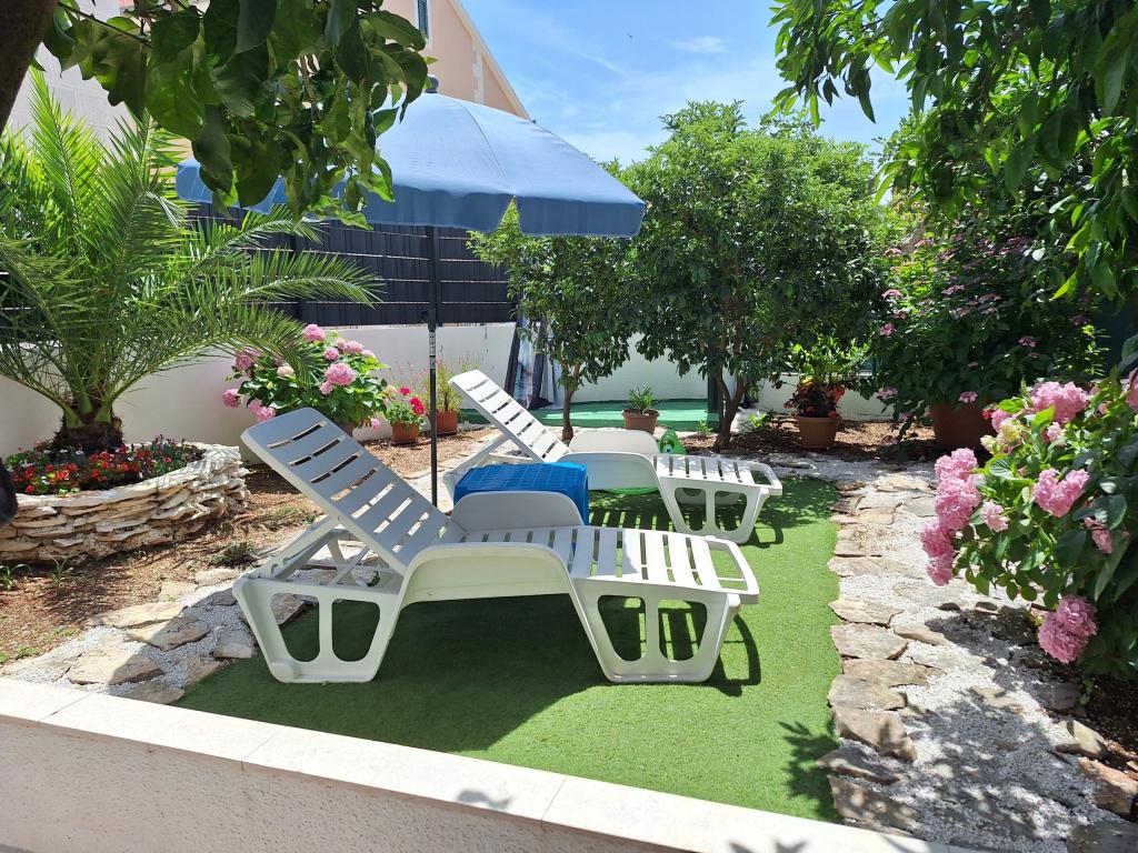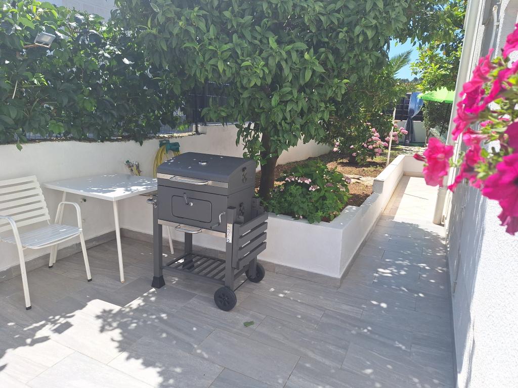 Uitstekend uitgerust (alles inbegrepen in de prijs, evenals de toeristenbelasting), ruim appartement Gizella, op de begane grond van een gezinswoning, met een terras, tuin en parkeerplaats, de locatie biedt een rustige, ontspannende familievakantie in de schaduw van sinaasappel-, citroen-, mandarijn- en prachtige dennenbossen, die uittorenen boven de kristalheldere zee, met de mogelijkheid om te wandelen en fietsen naast olijfgaarden en mediterrane geneeskrachtige planten. U bent de enige gasten in de faciliteit en u heeft een aparte ingang. Kiezel-, rots- en betonstranden, met parkeergelegenheid, winkels, cafés, restaurants, fastfoodrestaurants, kinder- en sportspeelplaatsen, bus en geldautomaat liggen op vijf tot zes minuten lopen. Tegelijkertijd, op slechts 8 km afstand, bieden de oude stad Trogir, onder de bescherming van UNESCO, verbonden door bruggen, dicht bij het Krka Nationaal Park, de eilanden Šolta en Brač, dynamische excursies en entertainment. De nabijheid van de luchthaven maakt uw aankomst gemakkelijker en het is mogelijk om een transfer te regelen. De plaats is klein, rustig en mooi. Wij wachten u vriendelijk op met een welkomstdrankje