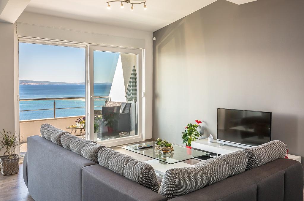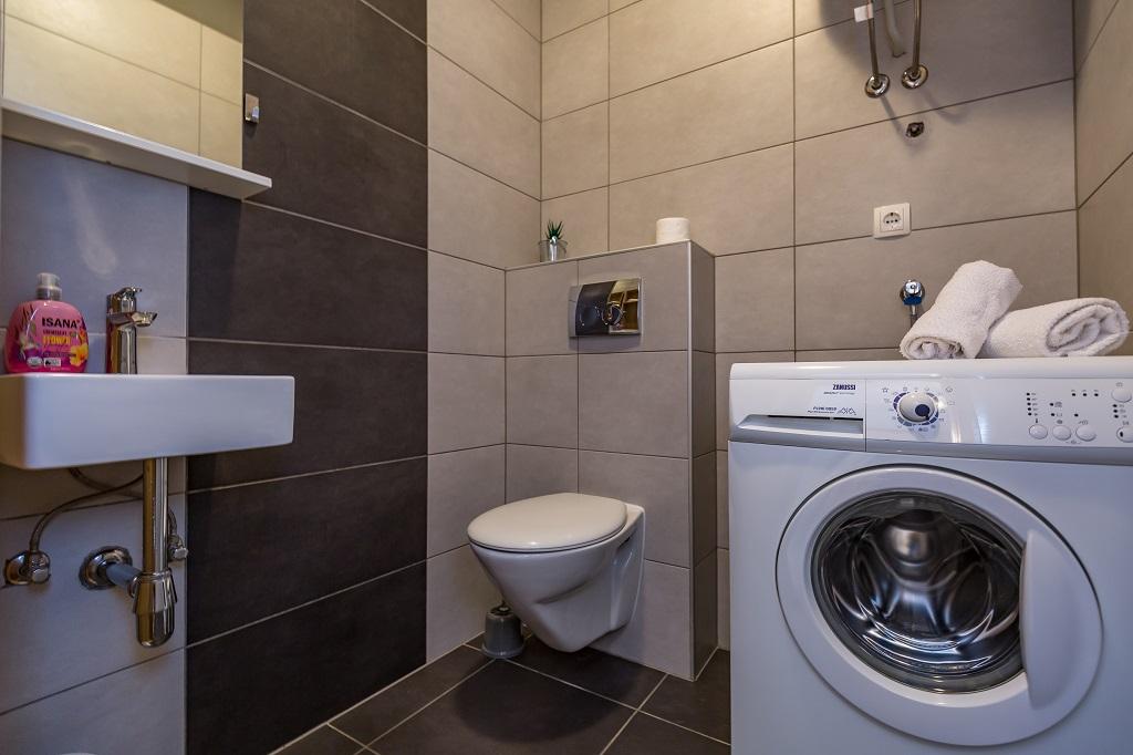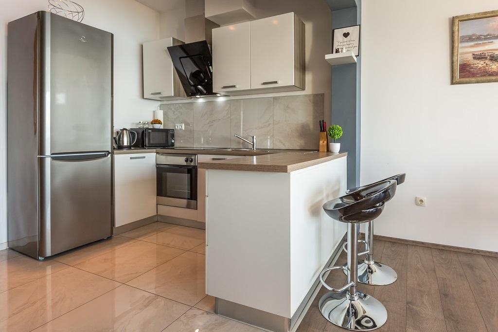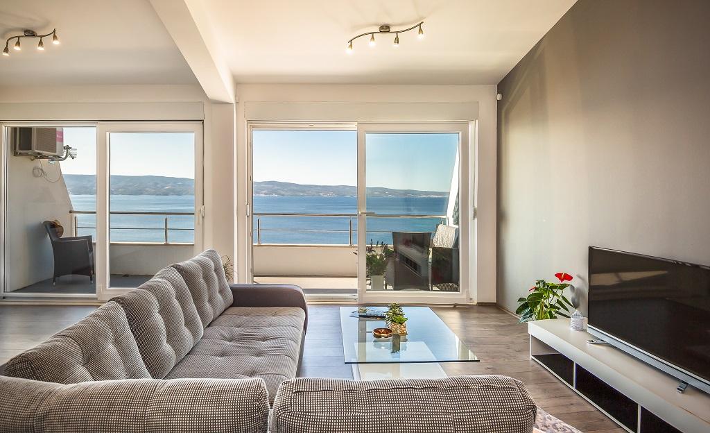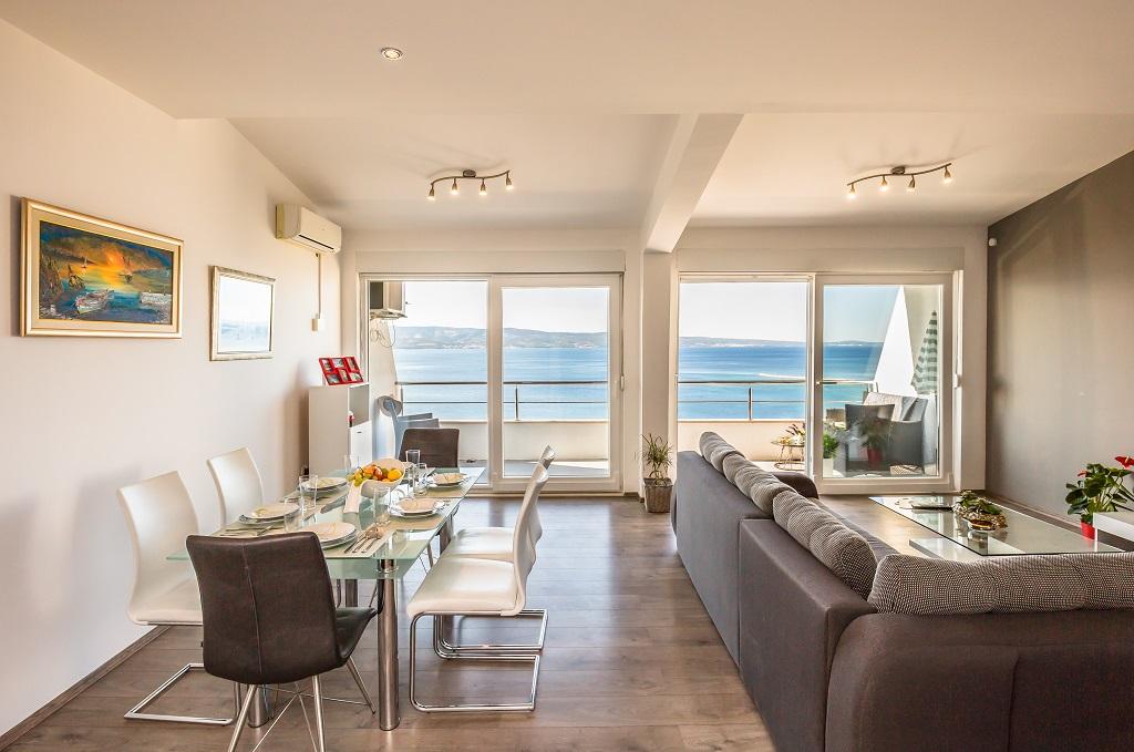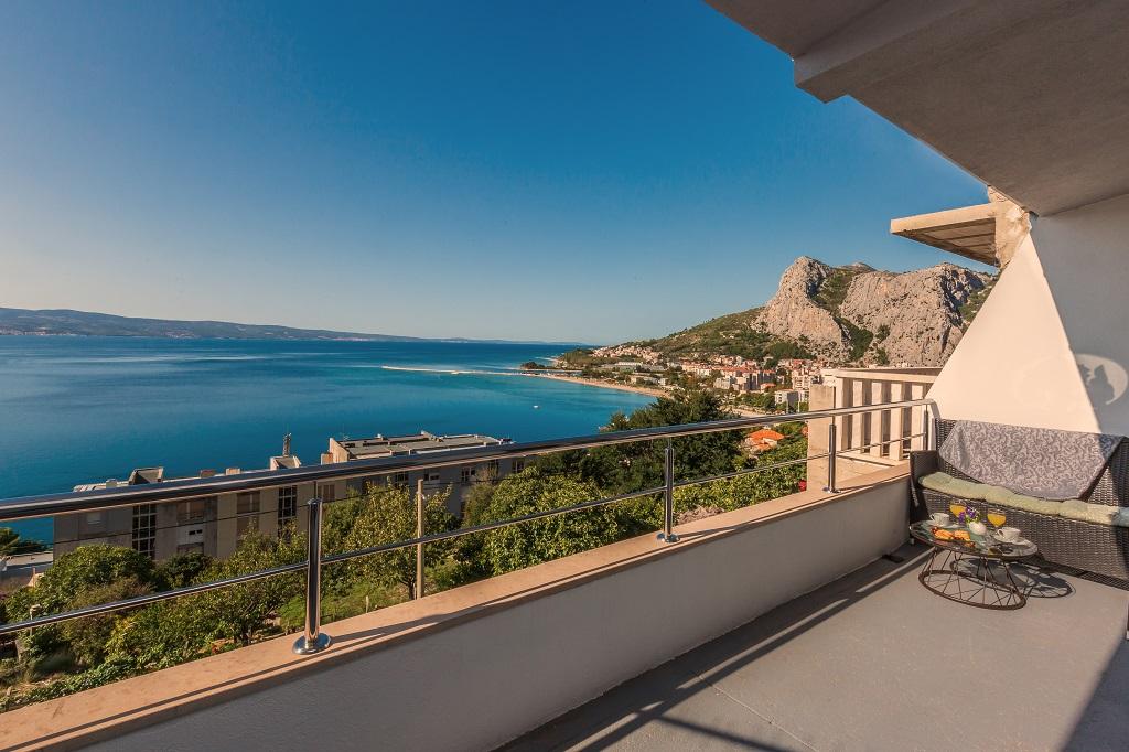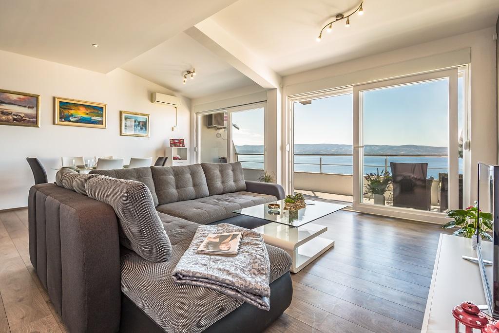 NIEUW EN MODERN APPARTEMENT. Het appartement bevindt zich in een privégezinswoning met uitzicht op de zee, de eilanden en de plaatselijke stranden. Dichtbij het centrum van Omiš, op slechts 500 meter afstand. Alles is gloednieuw. Het appartement heeft 95 m2. Het heeft 3 slaapkamers, een woonkamer, een keuken met een eetkamer, een toilet en een extra badkamer, een balkon en een parkeerplaats in de garage. Slaapkamers: Een kamer heeft een groot bed (180 x 190) voor 2 personen. De tweede kamer heeft een Frans bed (160 x 190) voor 2 personen. De derde kamer heeft een eenpersoonsbed (90 x 190) voor 1 persoon. Badkamer met wastafel en douche. WC met wastafel en wasmachine. De keuken is volledig uitgerust. De woonkamer is ruim. Groot balkon met zitje.