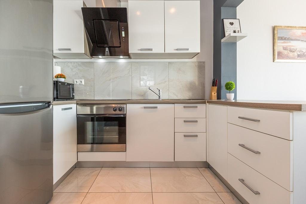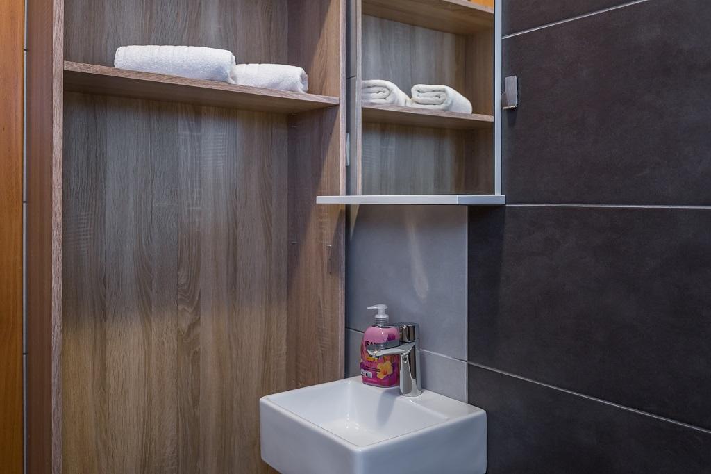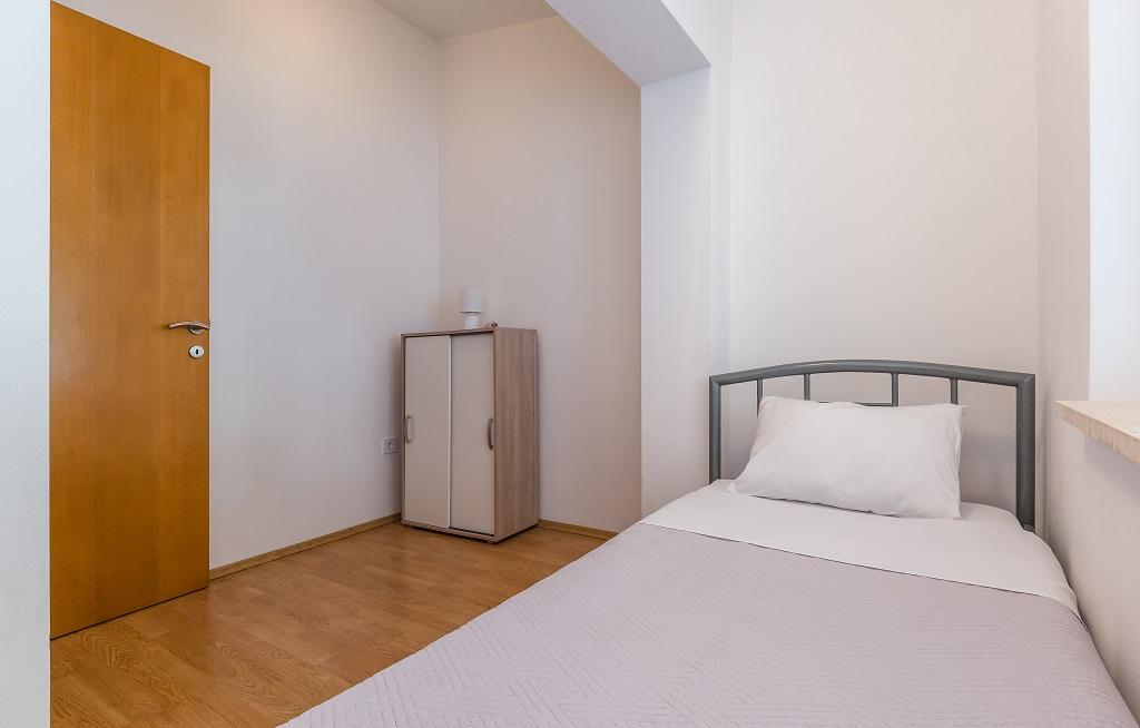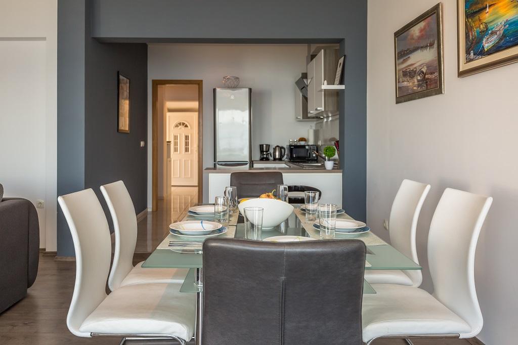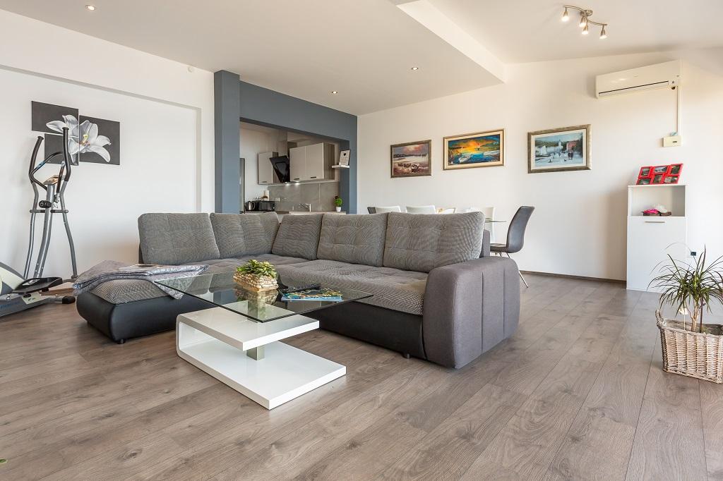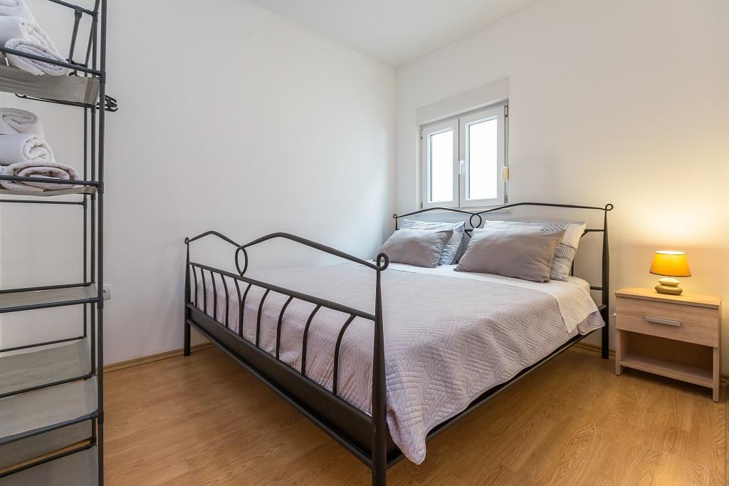 NIEUW EN MODERN APPARTEMENT. Het appartement bevindt zich in een privégezinswoning met uitzicht op de zee, de eilanden en de plaatselijke stranden. Dichtbij het centrum van Omiš, op slechts 500 meter afstand. Alles is gloednieuw. Het appartement heeft 95 m2. Het heeft 3 slaapkamers, een woonkamer, een keuken met een eetkamer, een toilet en een extra badkamer, een balkon en een parkeerplaats in de garage. Slaapkamers: Een kamer heeft een groot bed (180 x 190) voor 2 personen. De tweede kamer heeft een Frans bed (160 x 190) voor 2 personen. De derde kamer heeft een eenpersoonsbed (90 x 190) voor 1 persoon. Badkamer met wastafel en douche. WC met wastafel en wasmachine. De keuken is volledig uitgerust. De woonkamer is ruim. Groot balkon met zitje.