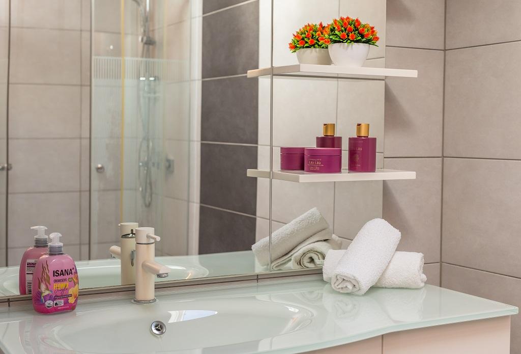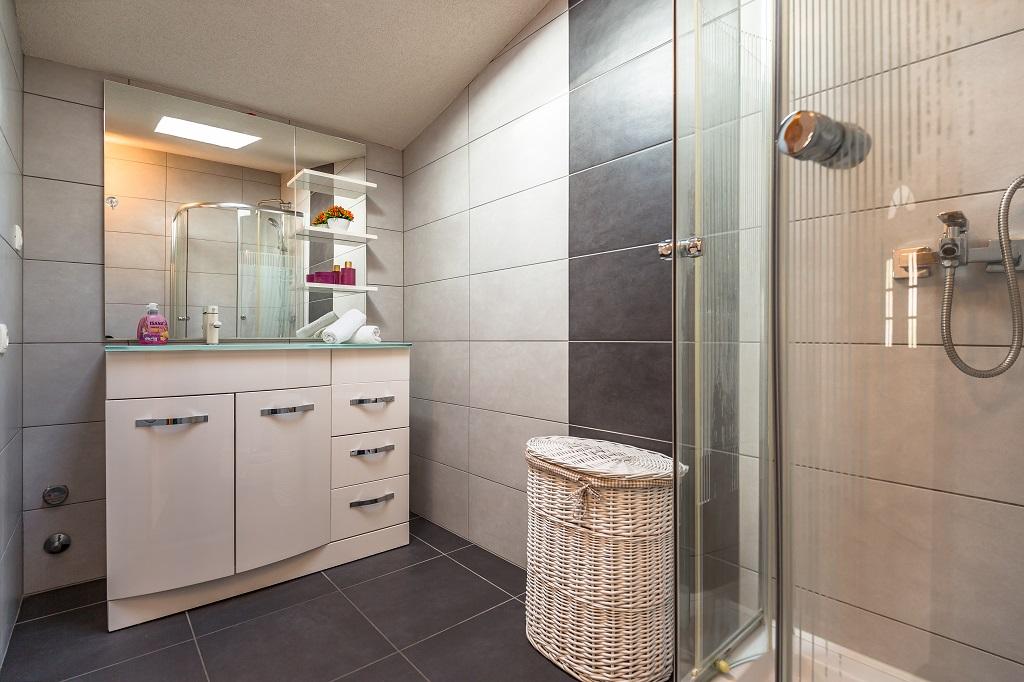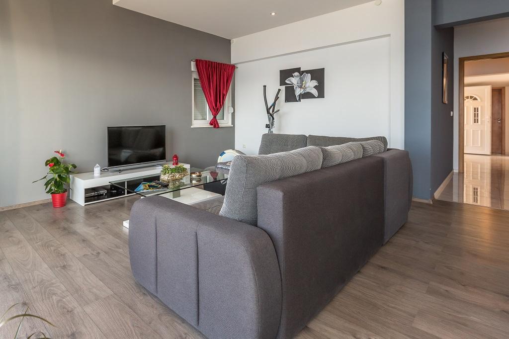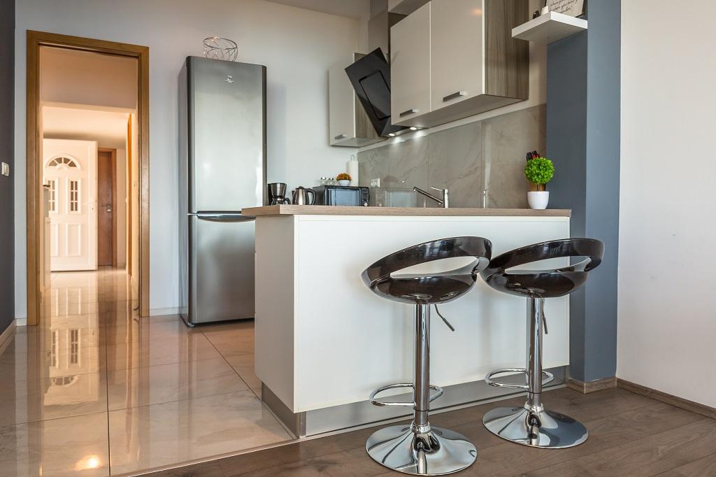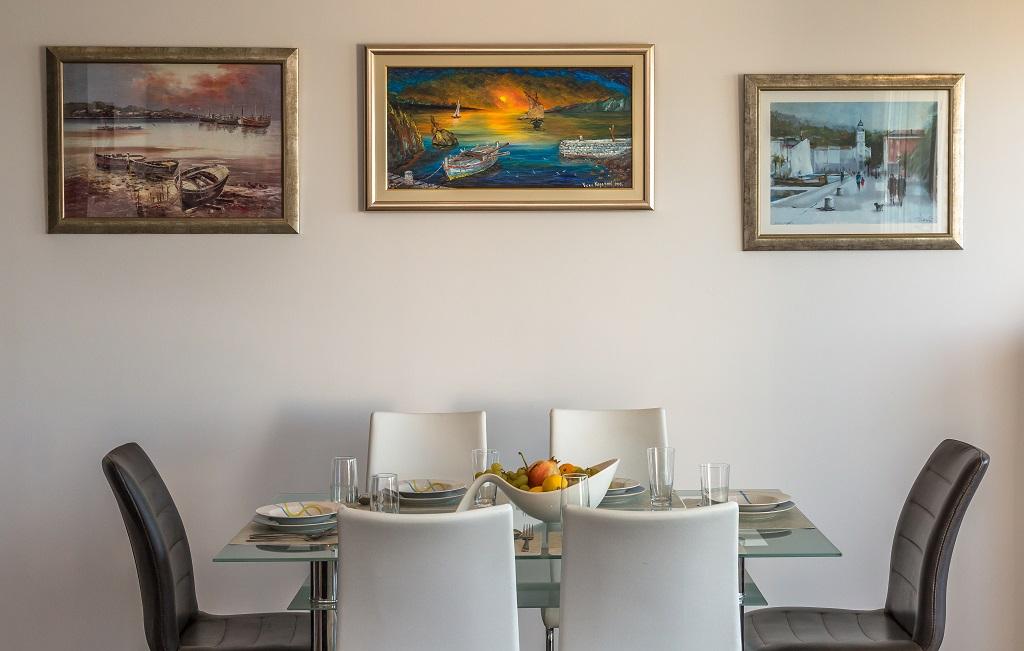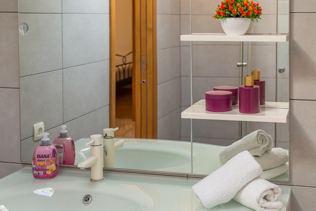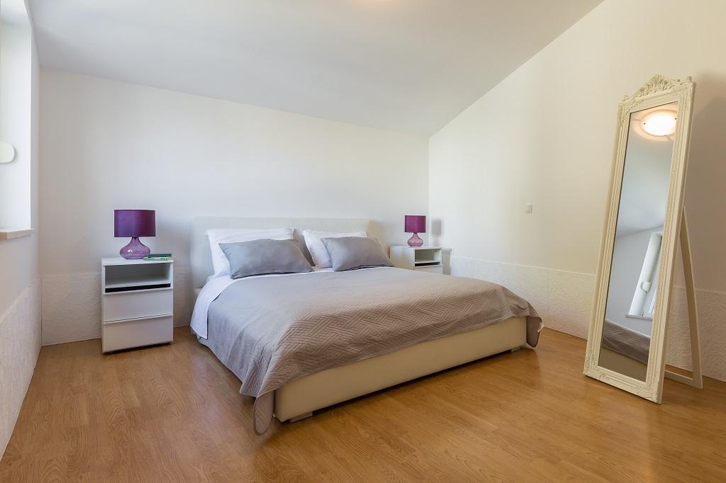 NIEUW EN MODERN APPARTEMENT. Het appartement bevindt zich in een privégezinswoning met uitzicht op de zee, de eilanden en de plaatselijke stranden. Dichtbij het centrum van Omiš, op slechts 500 meter afstand. Alles is gloednieuw. Het appartement heeft 95 m2. Het heeft 3 slaapkamers, een woonkamer, een keuken met een eetkamer, een toilet en een extra badkamer, een balkon en een parkeerplaats in de garage. Slaapkamers: Een kamer heeft een groot bed (180 x 190) voor 2 personen. De tweede kamer heeft een Frans bed (160 x 190) voor 2 personen. De derde kamer heeft een eenpersoonsbed (90 x 190) voor 1 persoon. Badkamer met wastafel en douche. WC met wastafel en wasmachine. De keuken is volledig uitgerust. De woonkamer is ruim. Groot balkon met zitje.