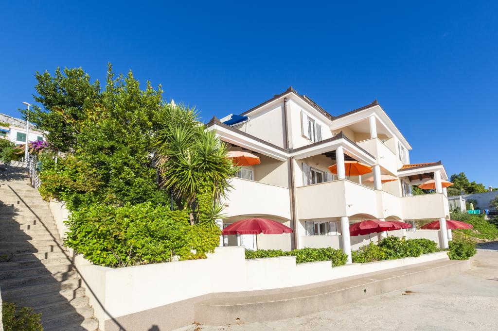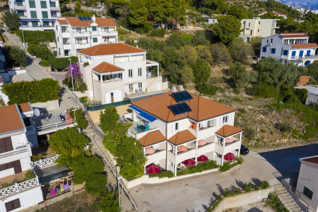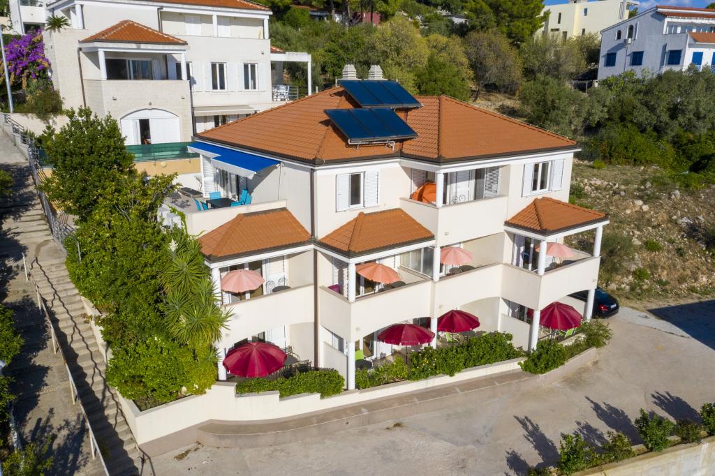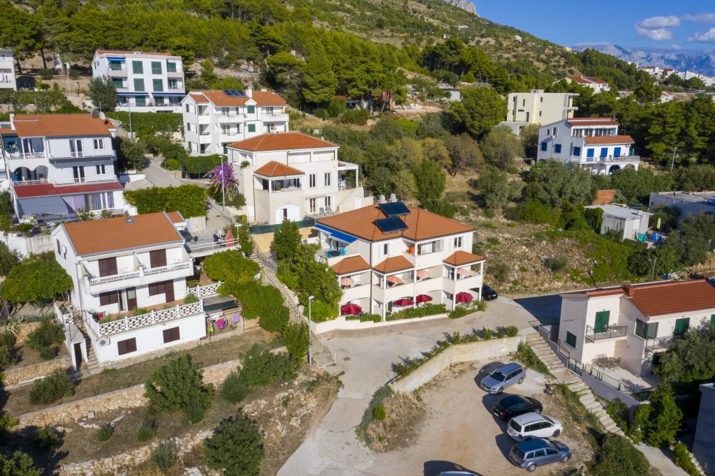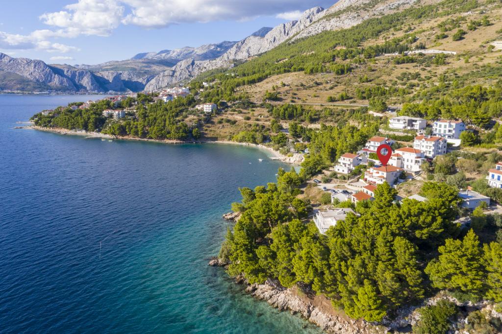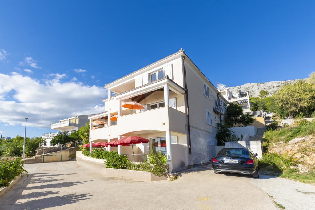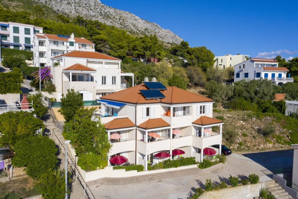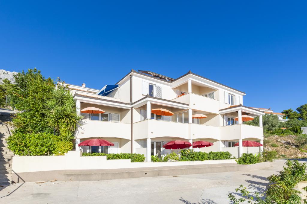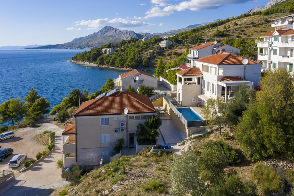 Accommodatie in nieuw gebouwde, uiterst comfortabele en uitstekend uitgeruste appartementen. De accommodatie ligt op 3 km van het centrum van Omiš. In totaal acht appartementen, direct aan zee gelegen. Alle appartementen hebben grote terrassen met uitzicht op zee en het eiland Brač. Parkeerplaatsen direct naast de villa. De appartementen liggen 300 meter onder de hoofdweg, direct aan zee en een groot kiezelstrand. Er zijn vier typen appartementen: -- type 2+2 met een aparte slaapkamer met tweepersoonsbed en een woonkamer met twee eenpersoonsbedden, -- appartementen type 2+2 grote studio, -- grote luxe appartementen, -- type 4+2 met twee slaapkamers met tweepersoonsbedden en een grote woonkamer met twee slaapbanken en -- grote de luxe appartementen. Appartement, type 14+2, in werkelijkheid een villa van drie verdiepingen, 300 m² groot, met een verwarmd zwembad van 9 x 4 meter, zeven tweepersoonsslaapkamers, twee grote woonkamers met balkons en terrassen, vier badkamers, een apart toilet, een buitenbarbecue, een sauna en een fitnessruimte, enz. Het zwembad is exclusief voor appartement A 14+2. De andere appartementen hebben er geen toegang toe.