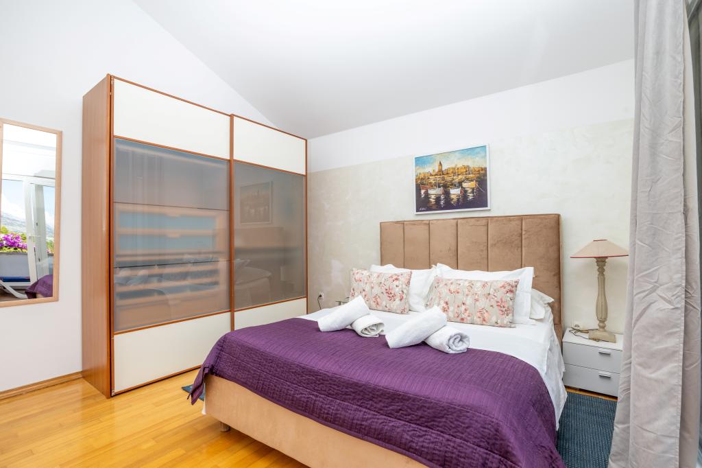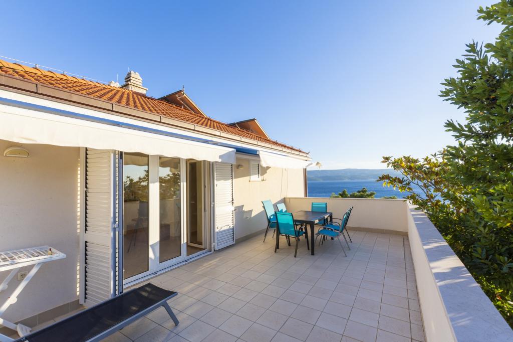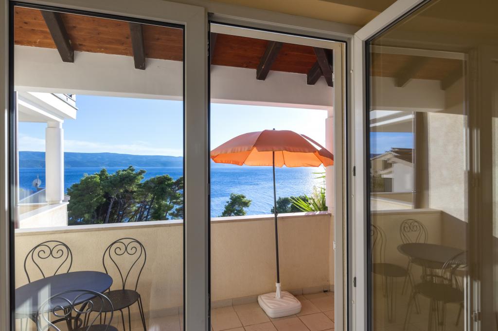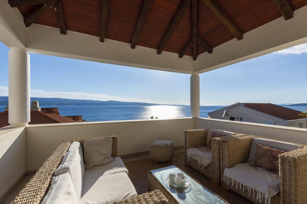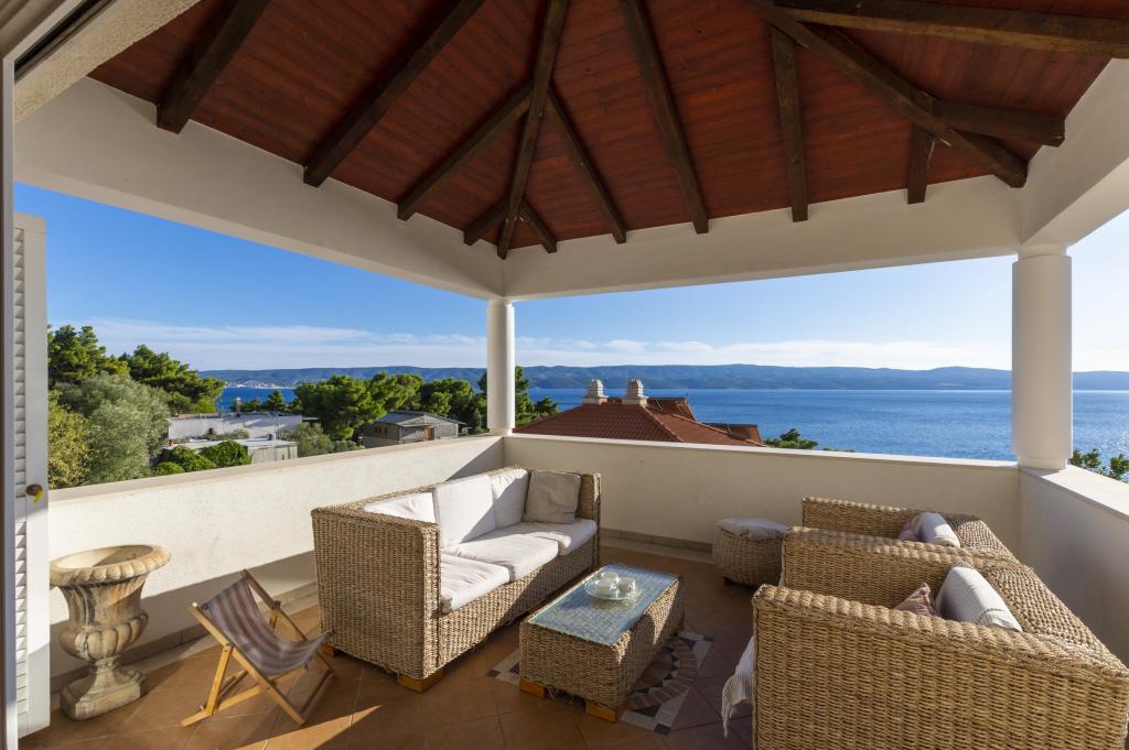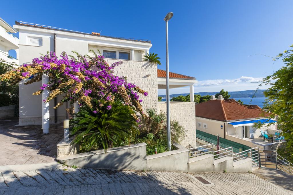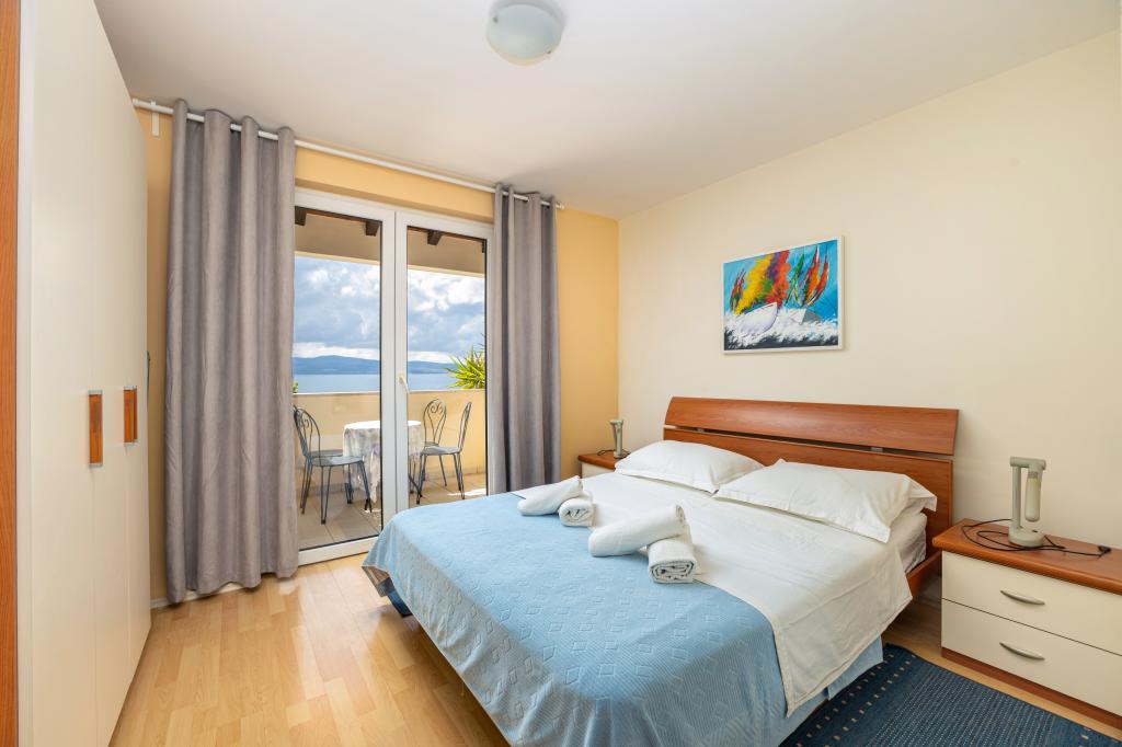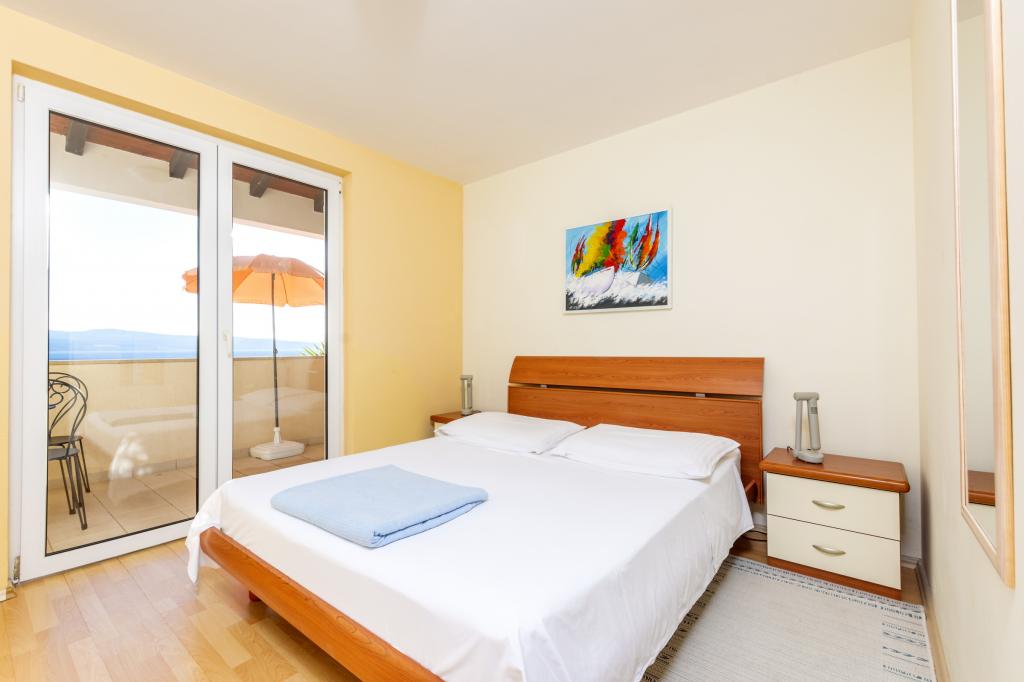 Accommodatie in nieuw gebouwde, uiterst comfortabele en uitstekend uitgeruste appartementen. De accommodatie ligt op 3 km van het centrum van Omiš. In totaal acht appartementen, direct aan zee gelegen. Alle appartementen hebben grote terrassen met uitzicht op zee en het eiland Brač. Parkeerplaatsen direct naast de villa. De appartementen liggen 300 meter onder de hoofdweg, direct aan zee en een groot kiezelstrand. Er zijn vier typen appartementen: -- type 2+2 met een aparte slaapkamer met tweepersoonsbed en een woonkamer met twee eenpersoonsbedden, -- appartementen type 2+2 grote studio, -- grote luxe appartementen, -- type 4+2 met twee slaapkamers met tweepersoonsbedden en een grote woonkamer met twee slaapbanken en -- grote de luxe appartementen. Appartement, type 14+2, in werkelijkheid een villa van drie verdiepingen, 300 m² groot, met een verwarmd zwembad van 9 x 4 meter, zeven tweepersoonsslaapkamers, twee grote woonkamers met balkons en terrassen, vier badkamers, een apart toilet, een buitenbarbecue, een sauna en een fitnessruimte, enz. Het zwembad is exclusief voor appartement A 14+2. De andere appartementen hebben er geen toegang toe.