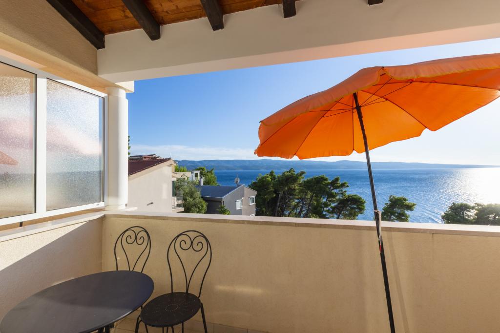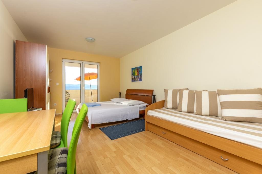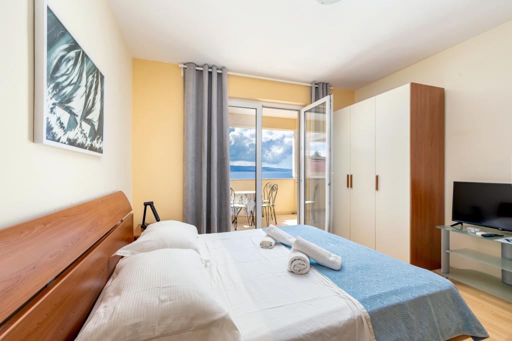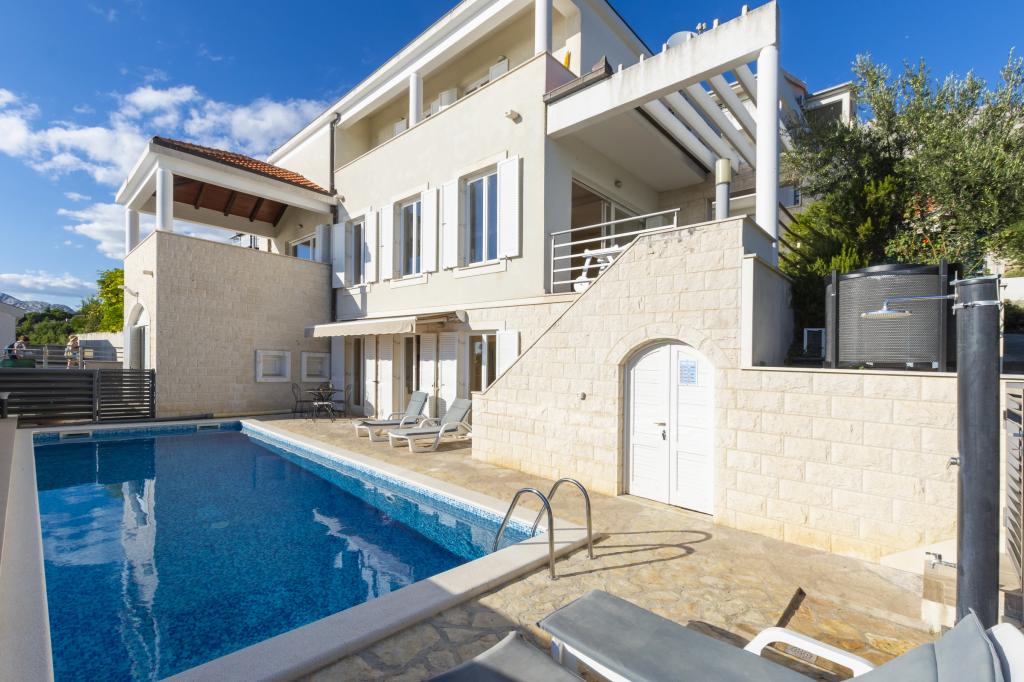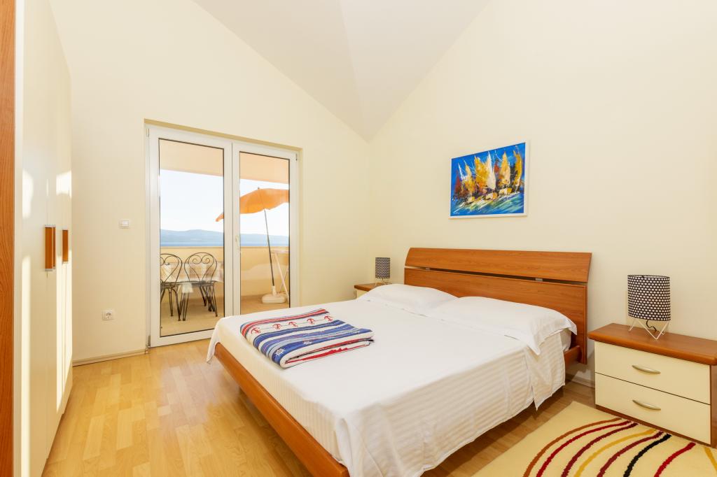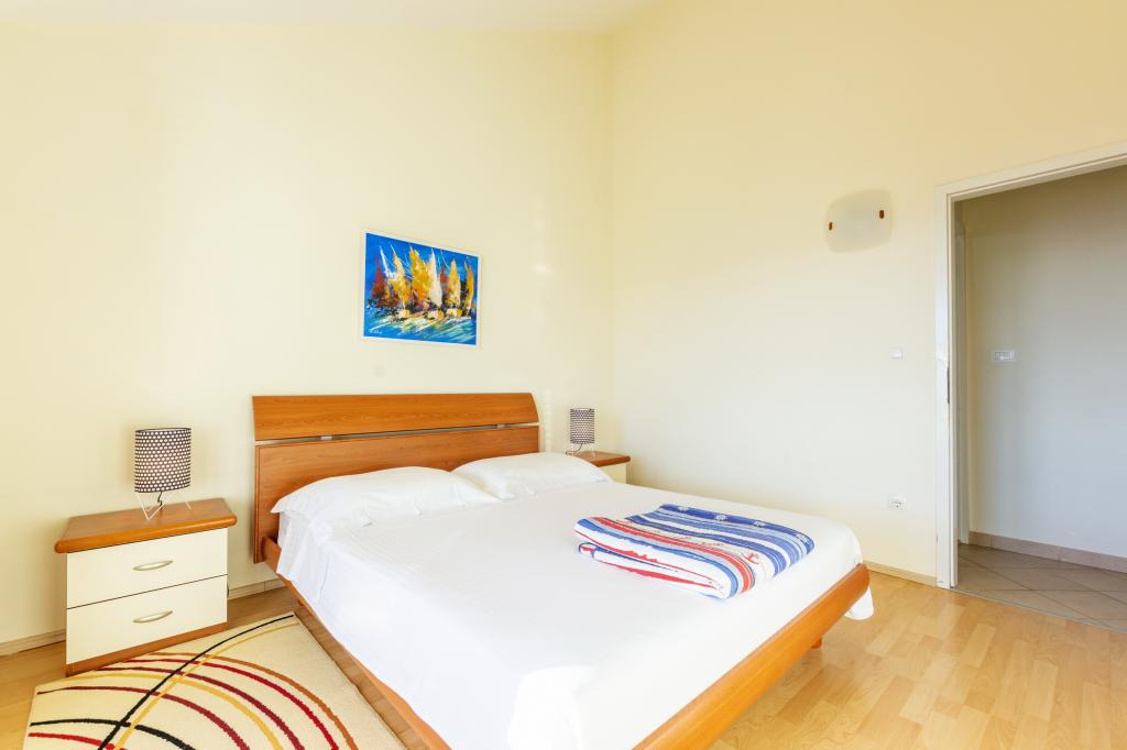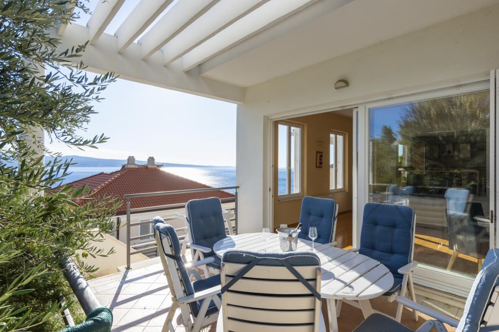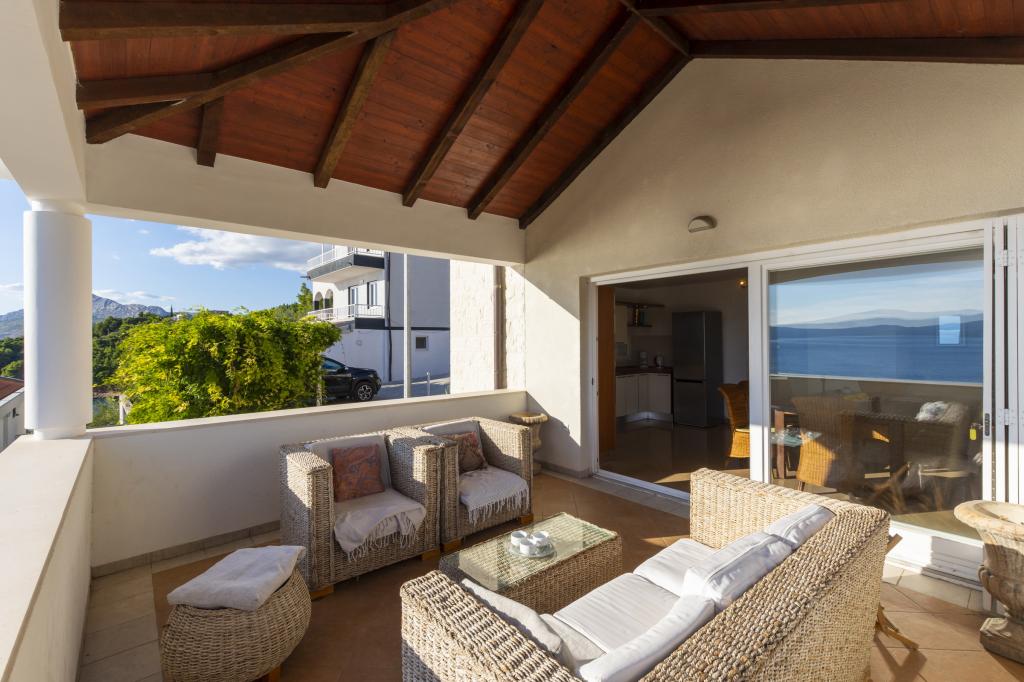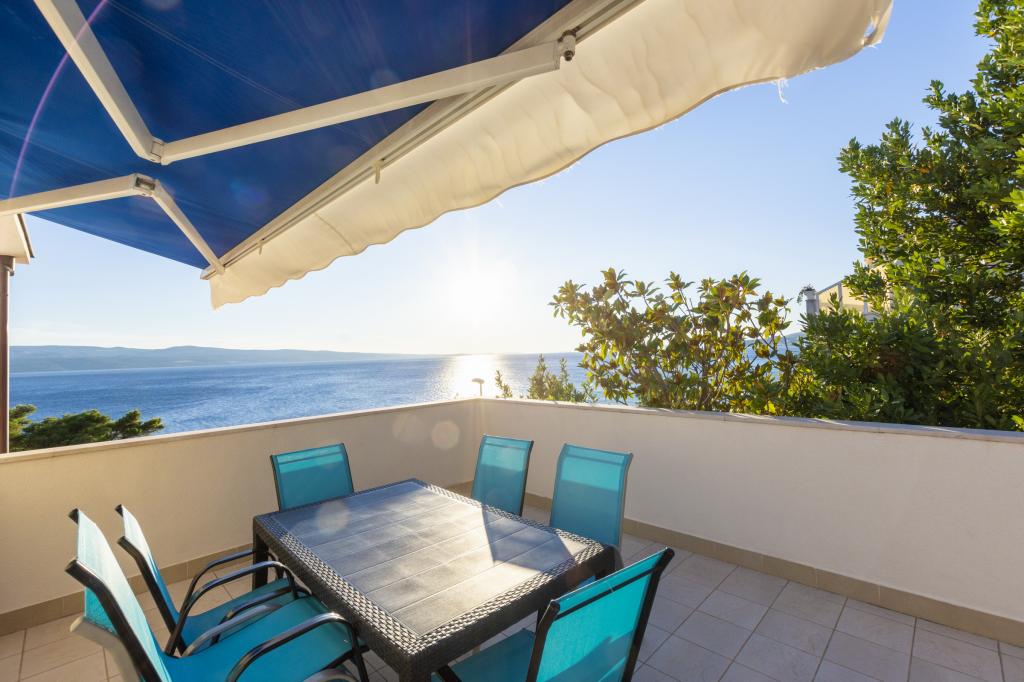 Accommodatie in nieuw gebouwde, uiterst comfortabele en uitstekend uitgeruste appartementen. De accommodatie ligt op 3 km van het centrum van Omiš. In totaal acht appartementen, direct aan zee gelegen. Alle appartementen hebben grote terrassen met uitzicht op zee en het eiland Brač. Parkeerplaatsen direct naast de villa. De appartementen liggen 300 meter onder de hoofdweg, direct aan zee en een groot kiezelstrand. Er zijn vier typen appartementen: -- type 2+2 met een aparte slaapkamer met tweepersoonsbed en een woonkamer met twee eenpersoonsbedden, -- appartementen type 2+2 grote studio, -- grote luxe appartementen, -- type 4+2 met twee slaapkamers met tweepersoonsbedden en een grote woonkamer met twee slaapbanken en -- grote de luxe appartementen. Appartement, type 14+2, in werkelijkheid een villa van drie verdiepingen, 300 m² groot, met een verwarmd zwembad van 9 x 4 meter, zeven tweepersoonsslaapkamers, twee grote woonkamers met balkons en terrassen, vier badkamers, een apart toilet, een buitenbarbecue, een sauna en een fitnessruimte, enz. Het zwembad is exclusief voor appartement A 14+2. De andere appartementen hebben er geen toegang toe.