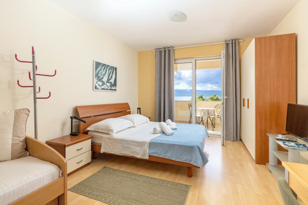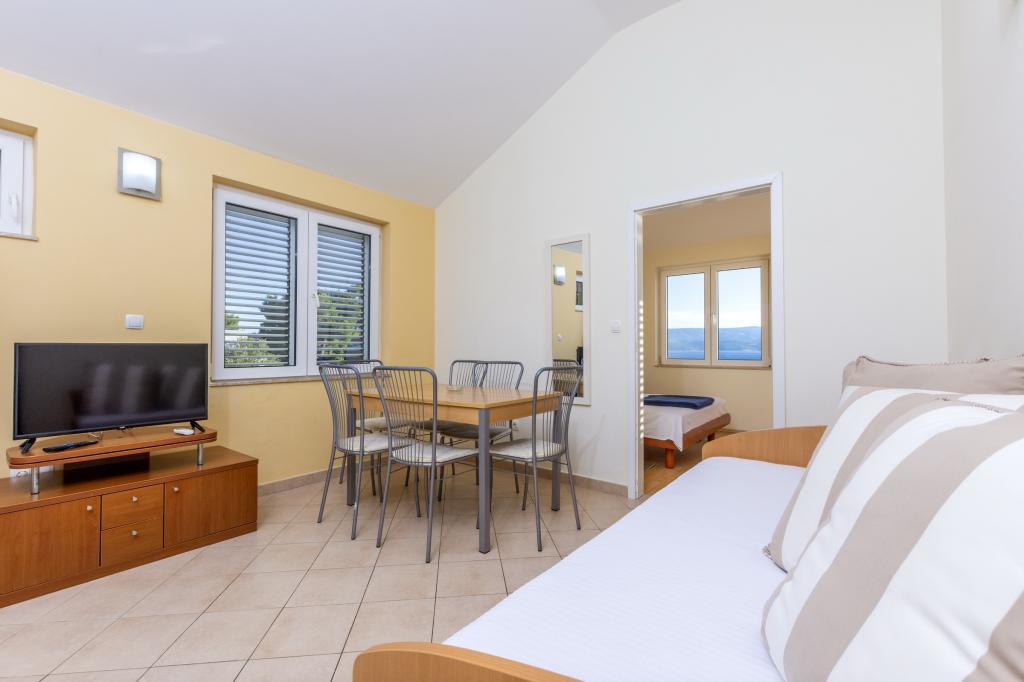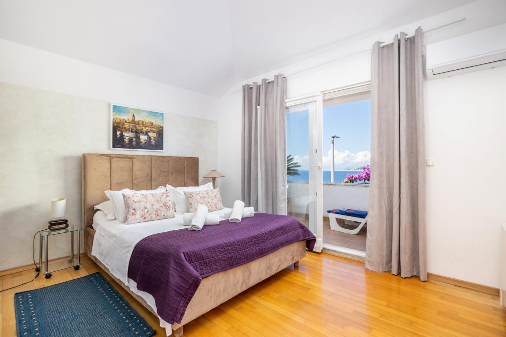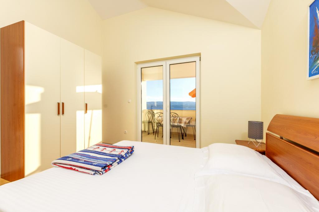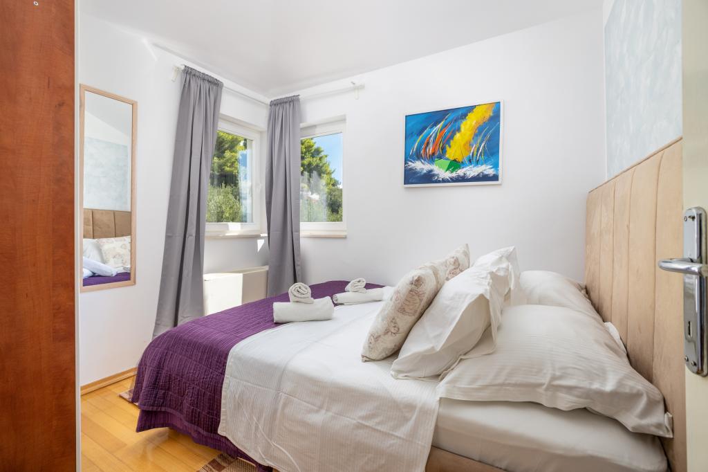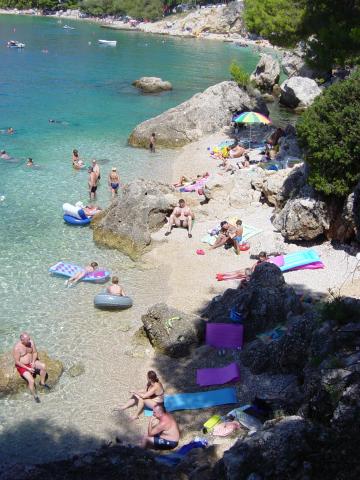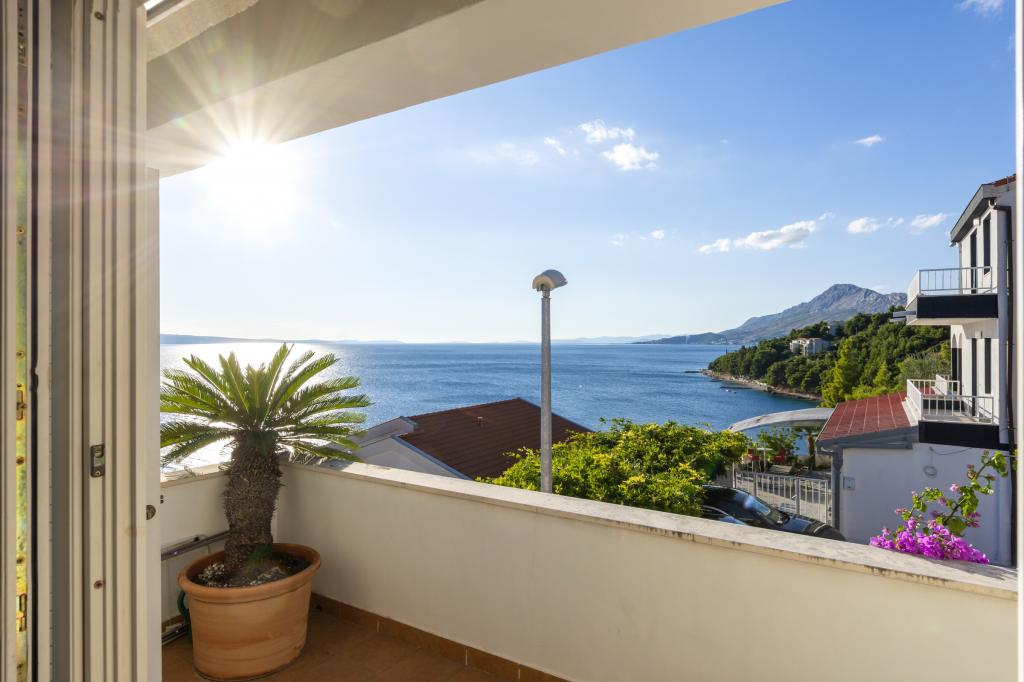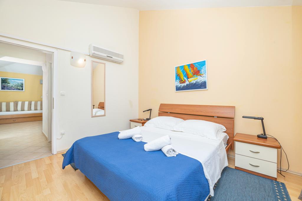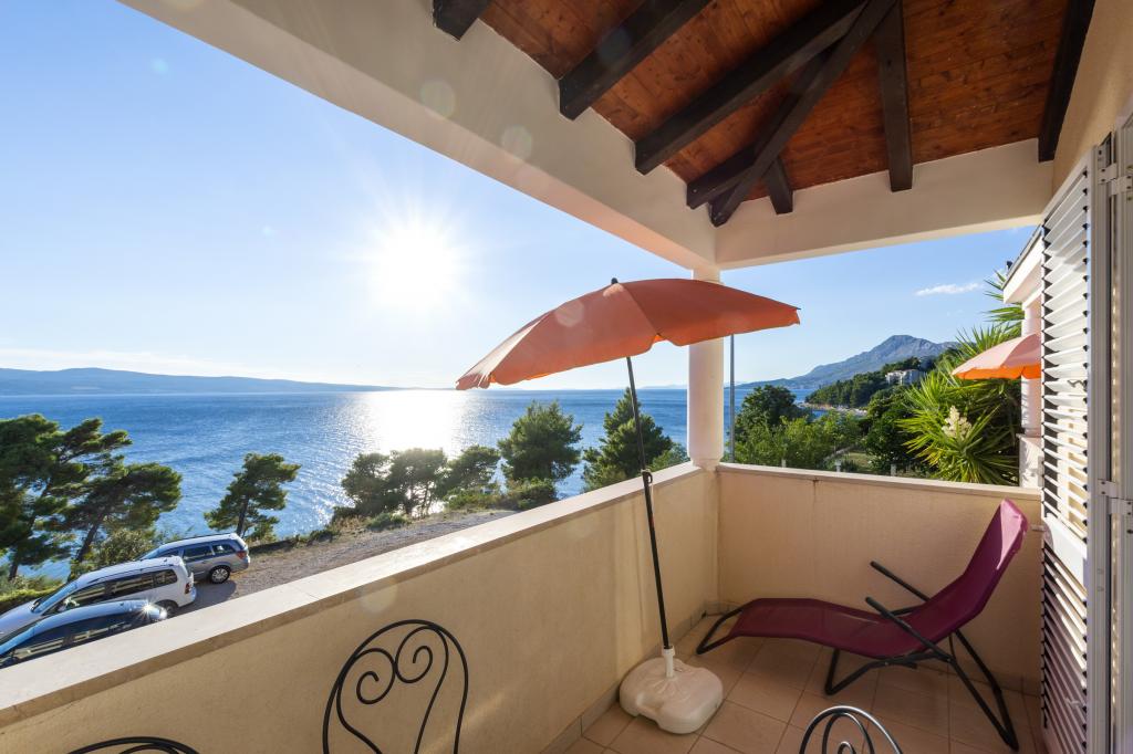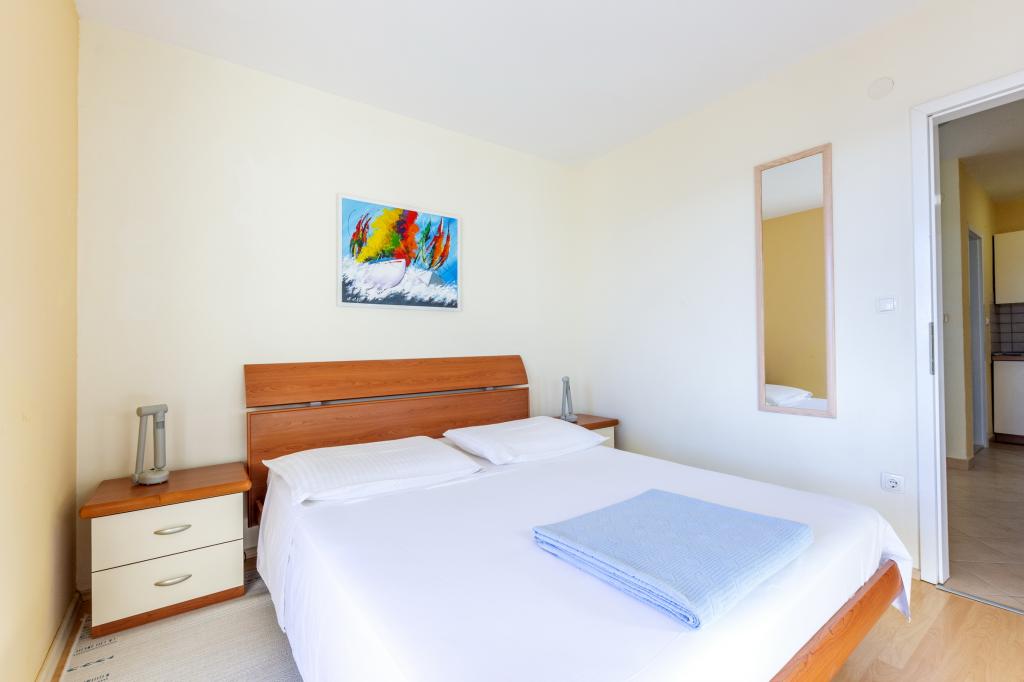 Accommodatie in nieuw gebouwde, uiterst comfortabele en uitstekend uitgeruste appartementen. De accommodatie ligt op 3 km van het centrum van Omiš. In totaal acht appartementen, direct aan zee gelegen. Alle appartementen hebben grote terrassen met uitzicht op zee en het eiland Brač. Parkeerplaatsen direct naast de villa. De appartementen liggen 300 meter onder de hoofdweg, direct aan zee en een groot kiezelstrand. Er zijn vier typen appartementen: -- type 2+2 met een aparte slaapkamer met tweepersoonsbed en een woonkamer met twee eenpersoonsbedden, -- appartementen type 2+2 grote studio, -- grote luxe appartementen, -- type 4+2 met twee slaapkamers met tweepersoonsbedden en een grote woonkamer met twee slaapbanken en -- grote de luxe appartementen. Appartement, type 14+2, in werkelijkheid een villa van drie verdiepingen, 300 m² groot, met een verwarmd zwembad van 9 x 4 meter, zeven tweepersoonsslaapkamers, twee grote woonkamers met balkons en terrassen, vier badkamers, een apart toilet, een buitenbarbecue, een sauna en een fitnessruimte, enz. Het zwembad is exclusief voor appartement A 14+2. De andere appartementen hebben er geen toegang toe.