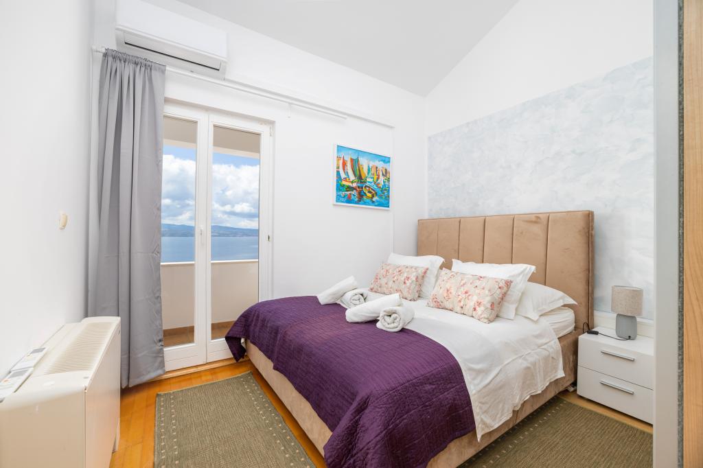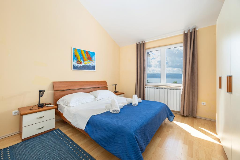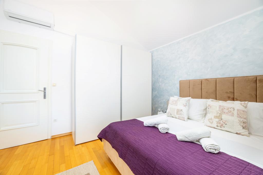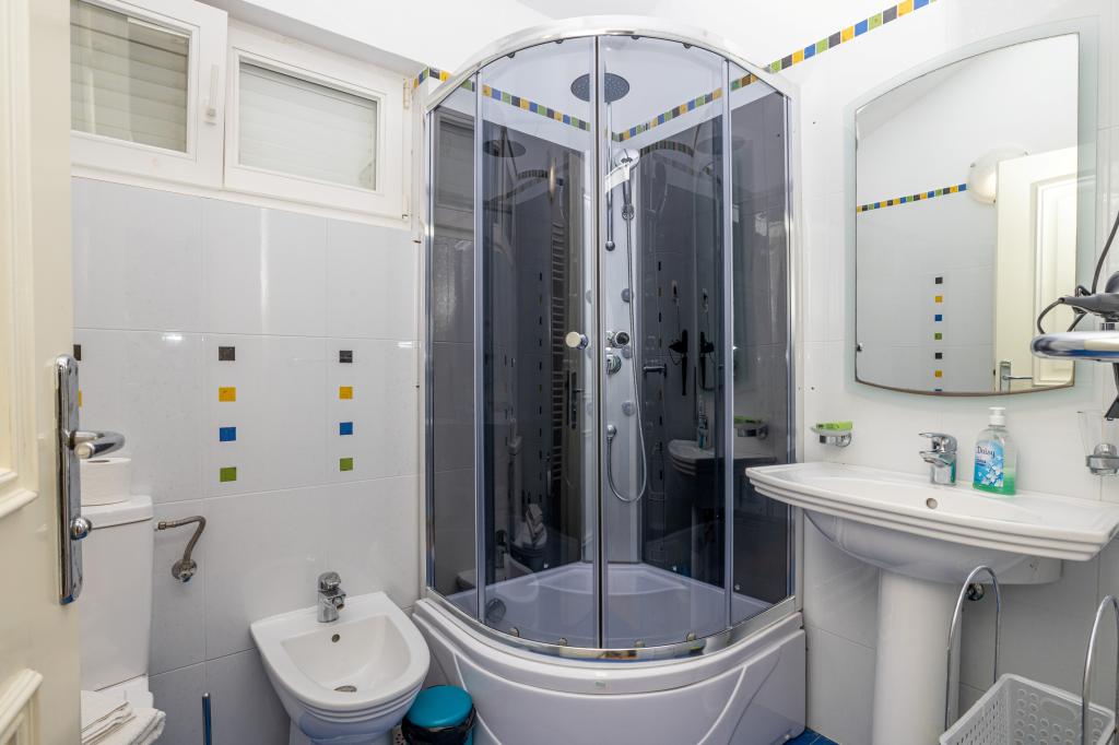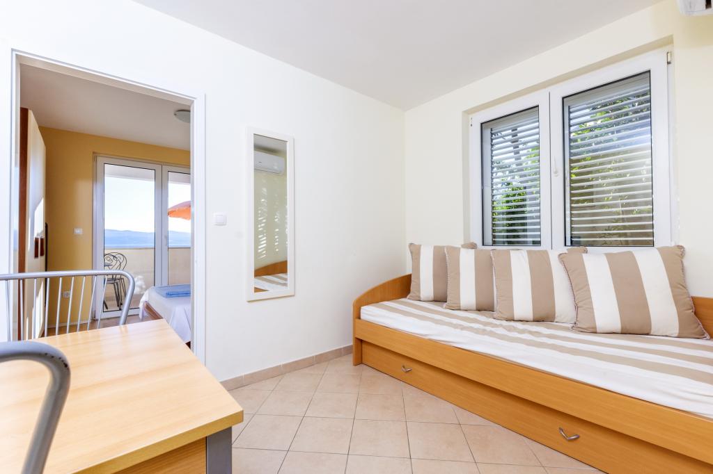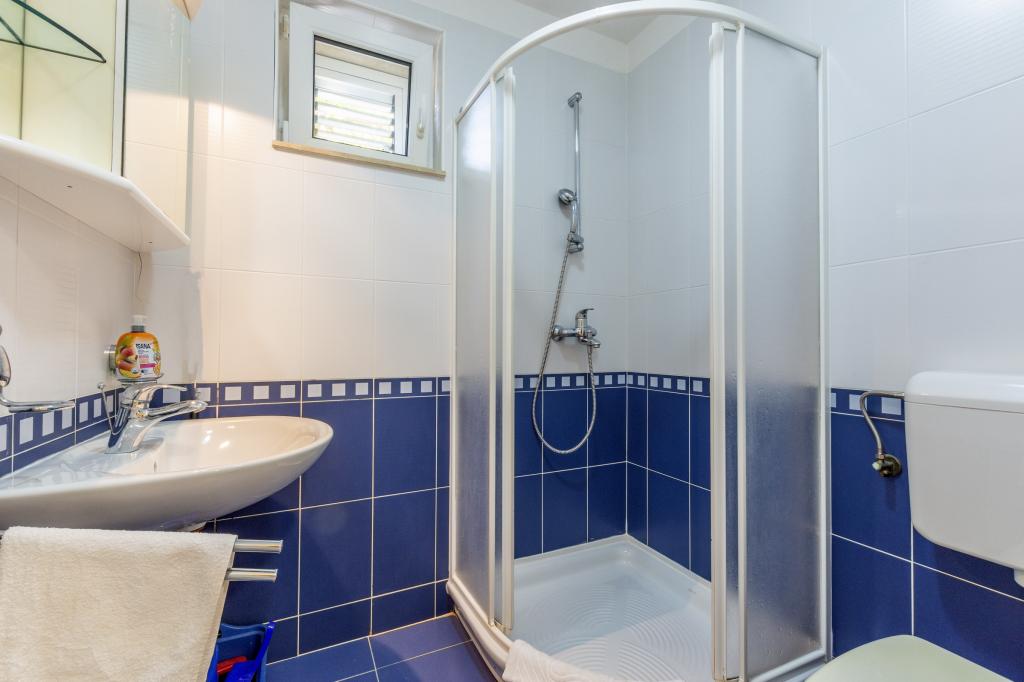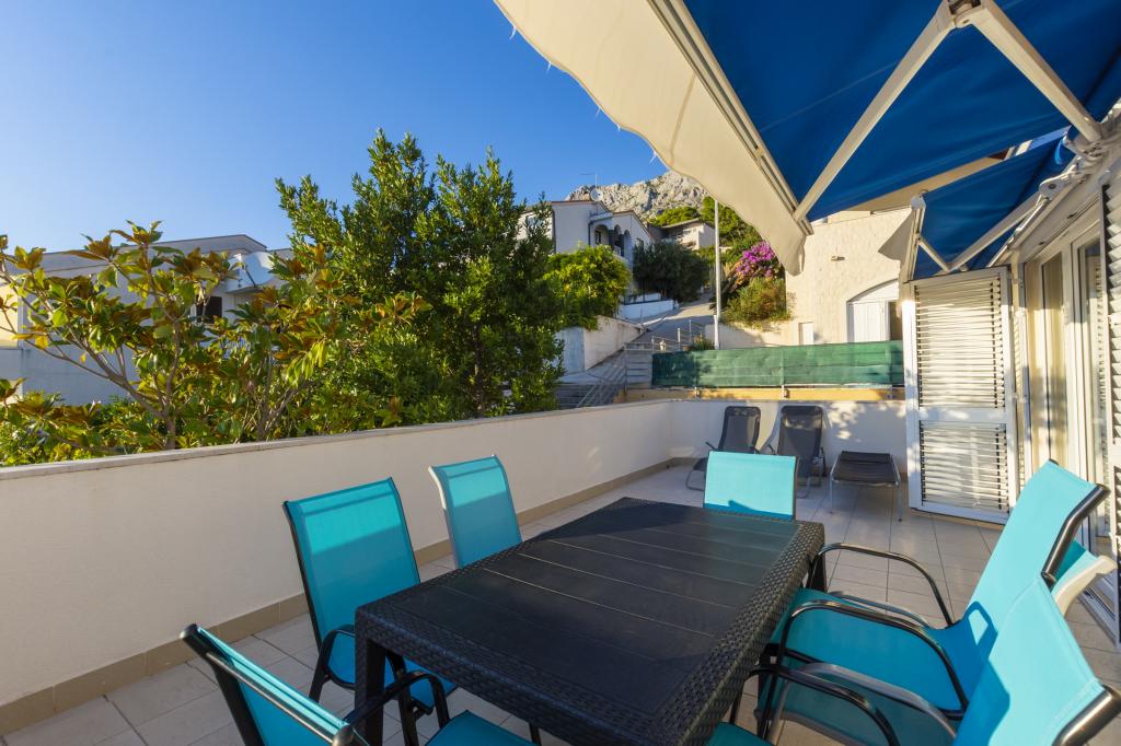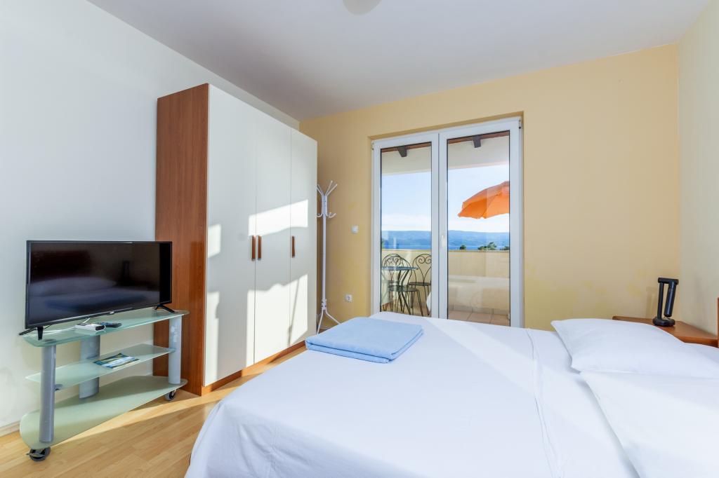 Accommodatie in nieuw gebouwde, uiterst comfortabele en uitstekend uitgeruste appartementen. De accommodatie ligt op 3 km van het centrum van Omiš. In totaal acht appartementen, direct aan zee gelegen. Alle appartementen hebben grote terrassen met uitzicht op zee en het eiland Brač. Parkeerplaatsen direct naast de villa. De appartementen liggen 300 meter onder de hoofdweg, direct aan zee en een groot kiezelstrand. Er zijn vier typen appartementen: -- type 2+2 met een aparte slaapkamer met tweepersoonsbed en een woonkamer met twee eenpersoonsbedden, -- appartementen type 2+2 grote studio, -- grote luxe appartementen, -- type 4+2 met twee slaapkamers met tweepersoonsbedden en een grote woonkamer met twee slaapbanken en -- grote de luxe appartementen. Appartement, type 14+2, in werkelijkheid een villa van drie verdiepingen, 300 m² groot, met een verwarmd zwembad van 9 x 4 meter, zeven tweepersoonsslaapkamers, twee grote woonkamers met balkons en terrassen, vier badkamers, een apart toilet, een buitenbarbecue, een sauna en een fitnessruimte, enz. Het zwembad is exclusief voor appartement A 14+2. De andere appartementen hebben er geen toegang toe.