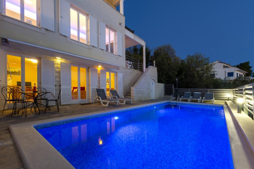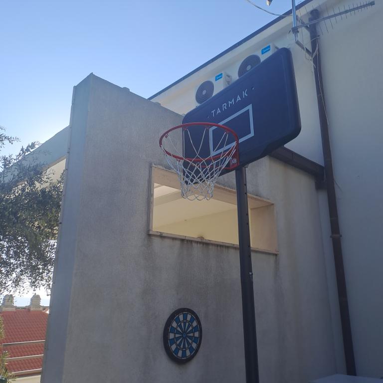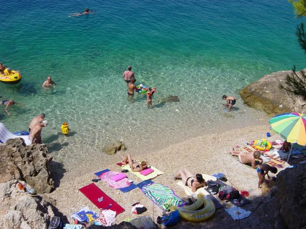 Inlusief wel Toeristenbelasting.Elke gast wordt bij aankomst verwelkomd met een drankje. We kunnen ook een boot of speedboot voor al onze gasten huren, raften op de Cetina-rivier organiseren, excursies naar het eiland Brač, enz. Alle appartementen kunnen gebruikmaken van de buitenbarbecue. Parkeergelegenheid is direct naast de villa beschikbaar voor alle appartementen. Prachtige kiezelstranden liggen op 30 meter van de villa. Het zwembad is exclusief bestemd voor gebruik door het grote luxe appartement type A 14 +2 (villa - apart gebouw), andere appartementen hebben geen toegang tot het zwembad. Het zwembad wordt dus uitsluitend en alleen gebruikt door het grote luxe appartement (villa), andere appartementen niet. De villa met zwembad (groot appartement type A 14 +2) is een apart gebouw. De villa met zwembad heeft zeven tweepersoonsslaapkamers, vier badkamers met toilet, een apart toilet, twee woonkamers, een fitnessruimte met sauna, dartbord, basketbalring, enz. Alle andere appartementen (type A 2 +2, Studio +2 en A 4 +2) bevinden zich in een ander apart gebouw, op 6 meter afstand van de villa met zwembad.