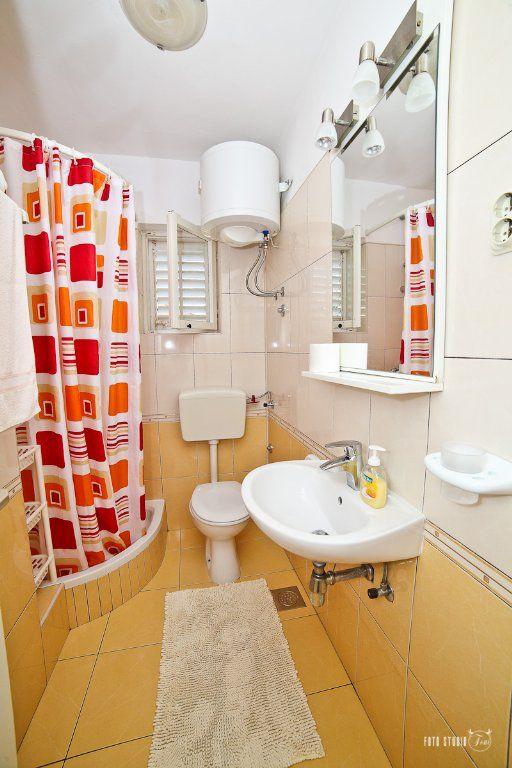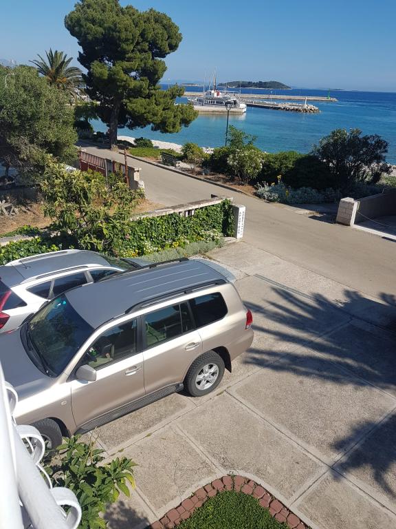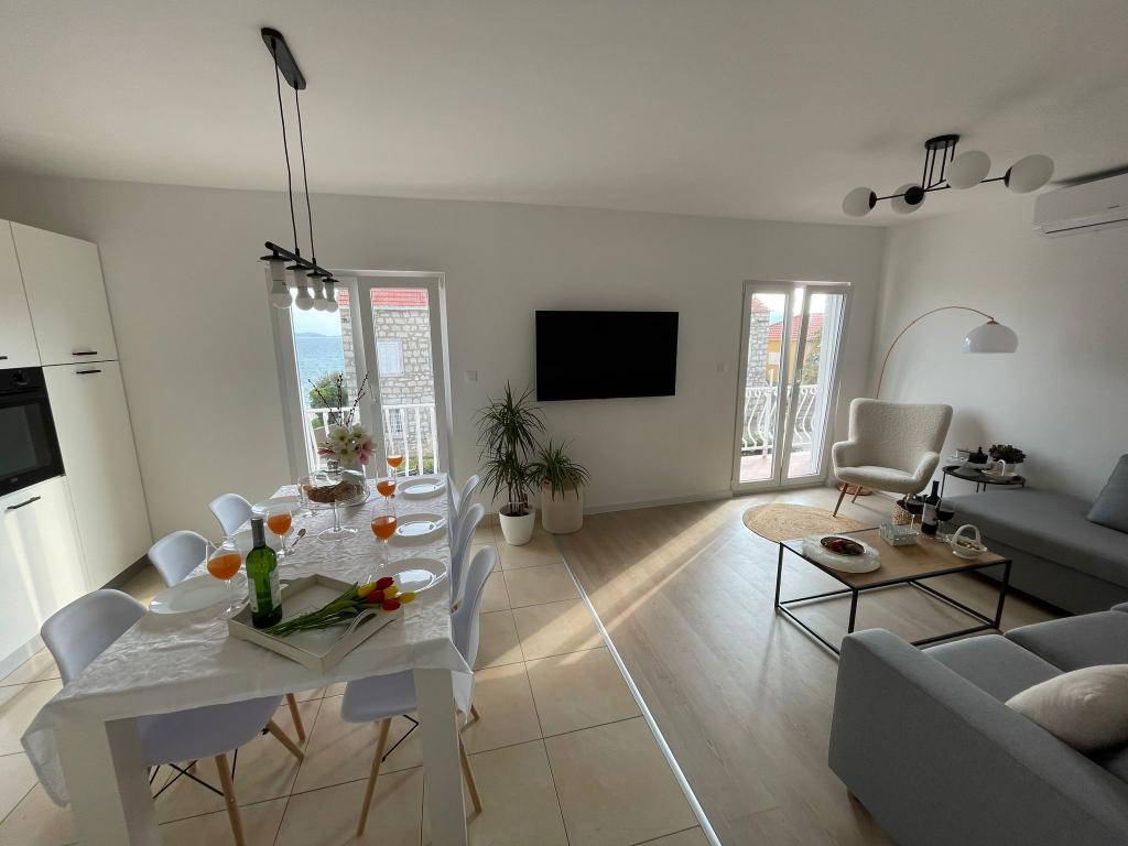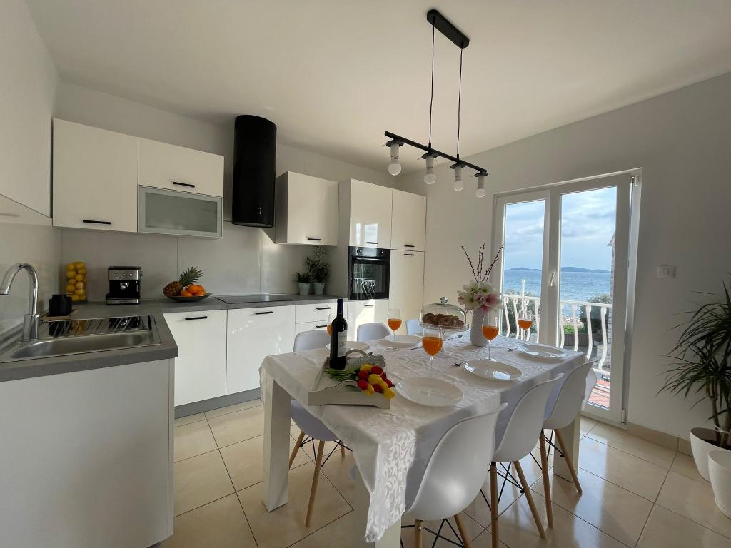 Het appartement is gelegen op de eerste rij naar de zee, bestaat uit drie tweepersoons slaapkamers, twee badkamers en twee keukens, op de eerste verdieping. De keuken en twee slaapkamers hebben een balkon en uitzicht op zee. De keukens zijn uitgerust. Voor het huis is een terras. Gasten kunnen gebruikmaken van de mobiele barbecue.