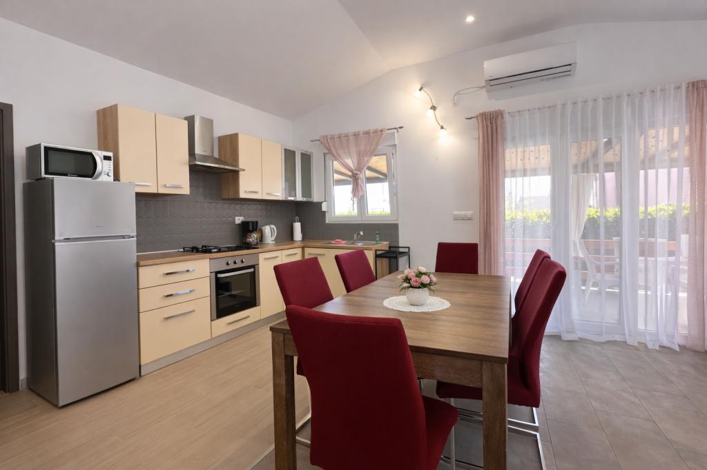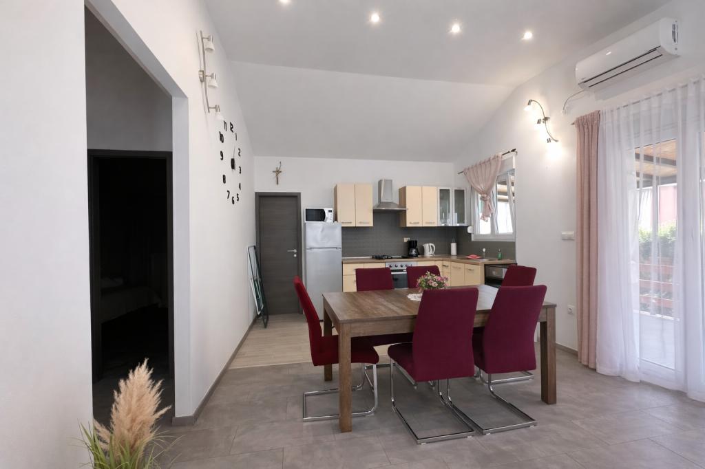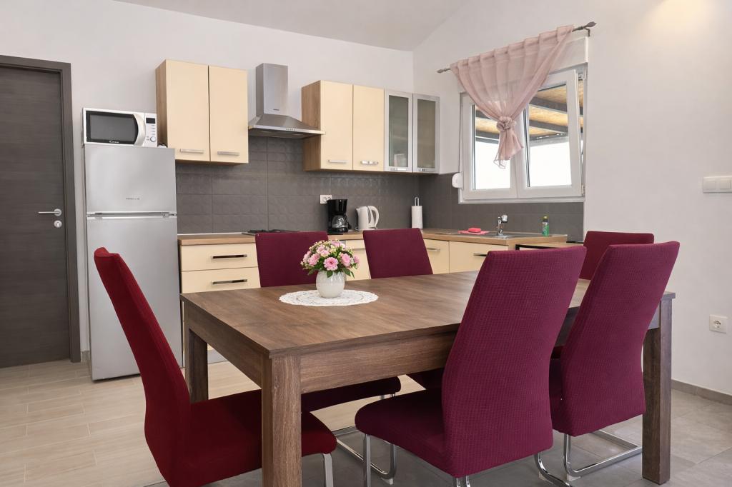 De accommodatie biedt plaats aan maximaal 5 gasten en beschikt over twee slaapkamers met tweepersoonsbedden (160x200) en een extra bed voor een kind tot 12 jaar in de woonkamer. Gasten hebben toegang tot beddengoed en handdoeken, een badkamer met douche en wasmachine, een gezellige woonkamer met tv en een volledig uitgeruste keuken (koelkast, fornuis, oven, vaatwasser, waterkoker en servies). Het overdekte terras is ideaal voor een kopje koffie in de ochtend of om te ontspannen, en gasten hebben toegang tot een eigen parkeerplaats. De tuin is omheind. De accommodatie ligt op 800-900 meter van het dichtstbijzijnde strand, terwijl de winkel en bakkerij op slechts 100 meter afstand liggen. De accommodatie is gemakkelijk bereikbaar vanaf de snelwegafslag bij Pakoštane, op ongeveer 15 minuten rijden. Welkom! :) Gebruik het contactformulier voor al uw vragen! BEDANKT :) De prijslijst voor het seizoen 2026 is bijgewerkt!